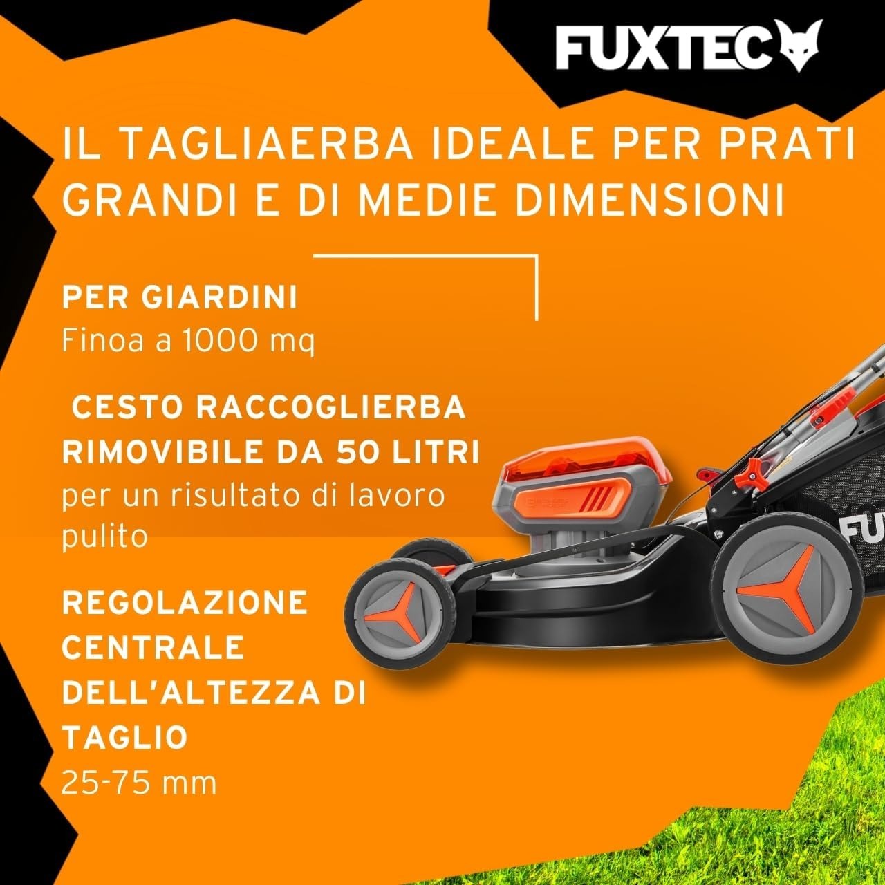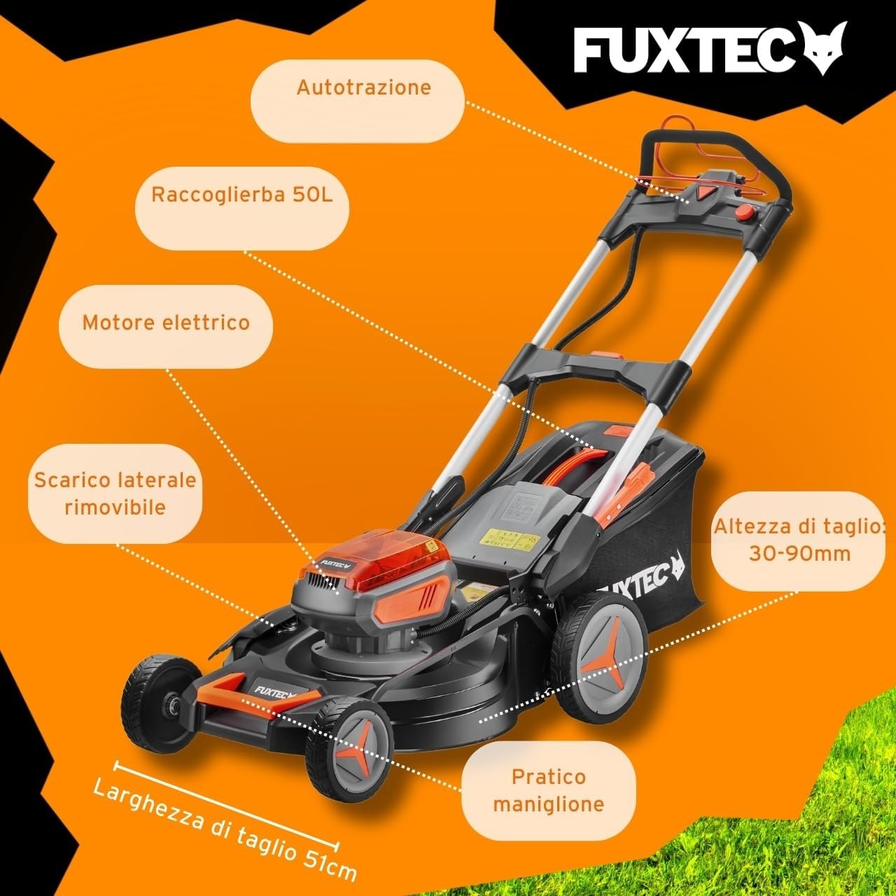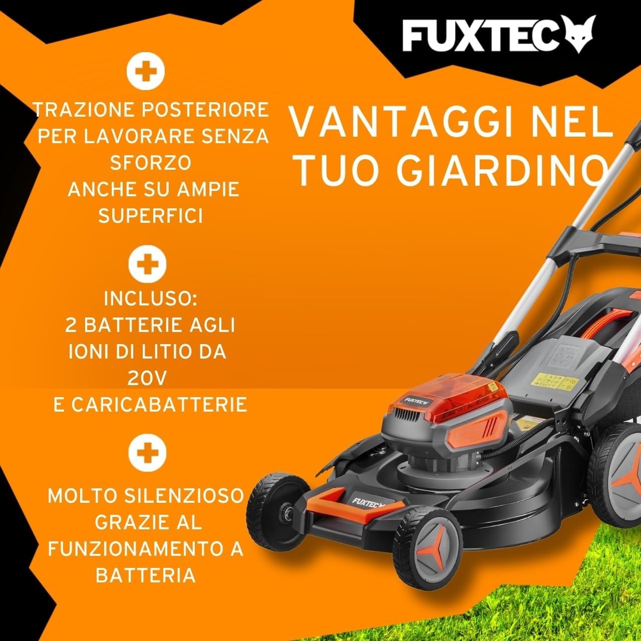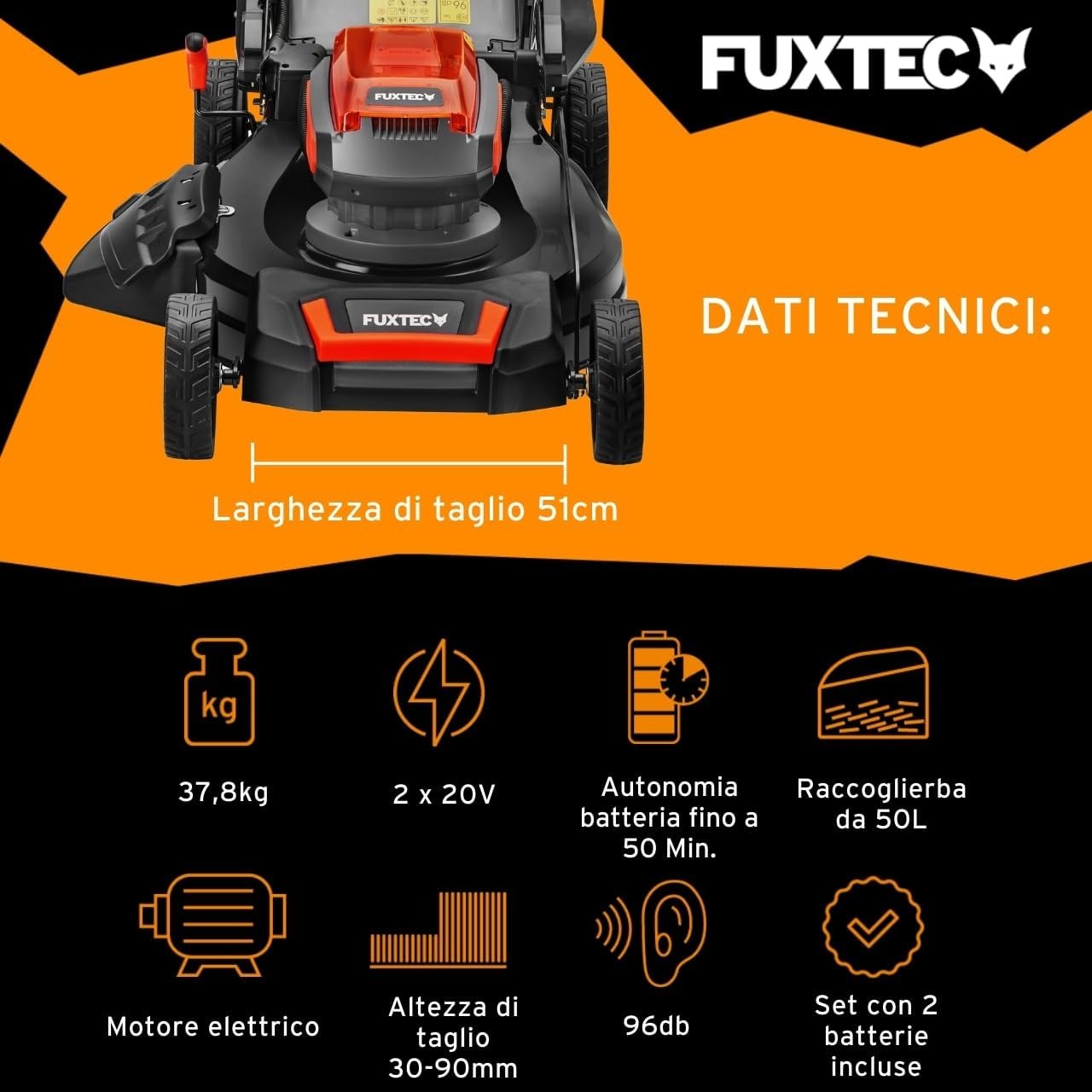 Fuxtec Tagliaerba a Batteria 40V (2x20V) E2RM46 semovente, Mulching e Scarico Laterale - Set Batterie 2x4Ah e Caricabatterie - Larghezza di Taglio 46cm, 50L, Altezza di Taglio 25-75mm