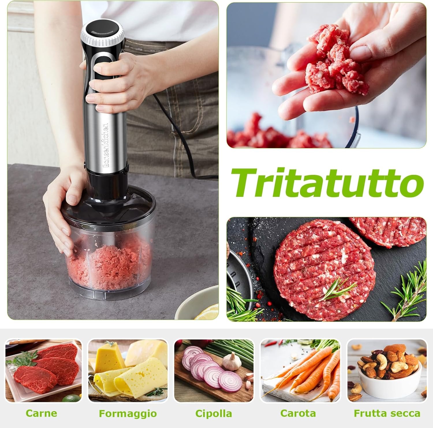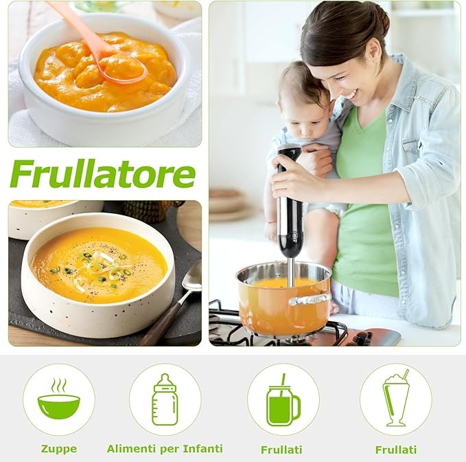 Bonsenkitchen Frullatore a Immersione Multifunzione 4 in 1, Minipimer in Acciaio Inox, 1000 W, 20 Velocità Regolabili, con Frusta, Tritatutto da 500 ml