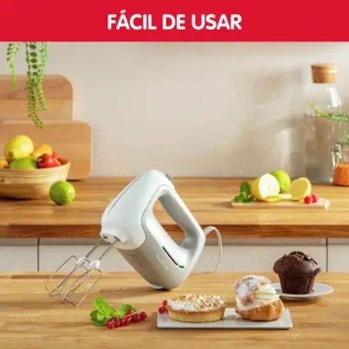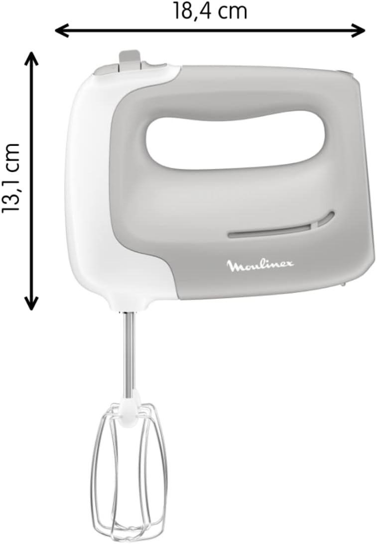 Moulinex HM450 PrepMix, Sbattitore Elettrico, Potenza di 450 W, 5 Velocità Regolabili e un Pulsante Turbo, 2 Lame in Acciaio Inox, 2 Ganci Impastatori, Utilizzo Confortevole, Bianco e Grigio [Classe di efficienza energetica A]