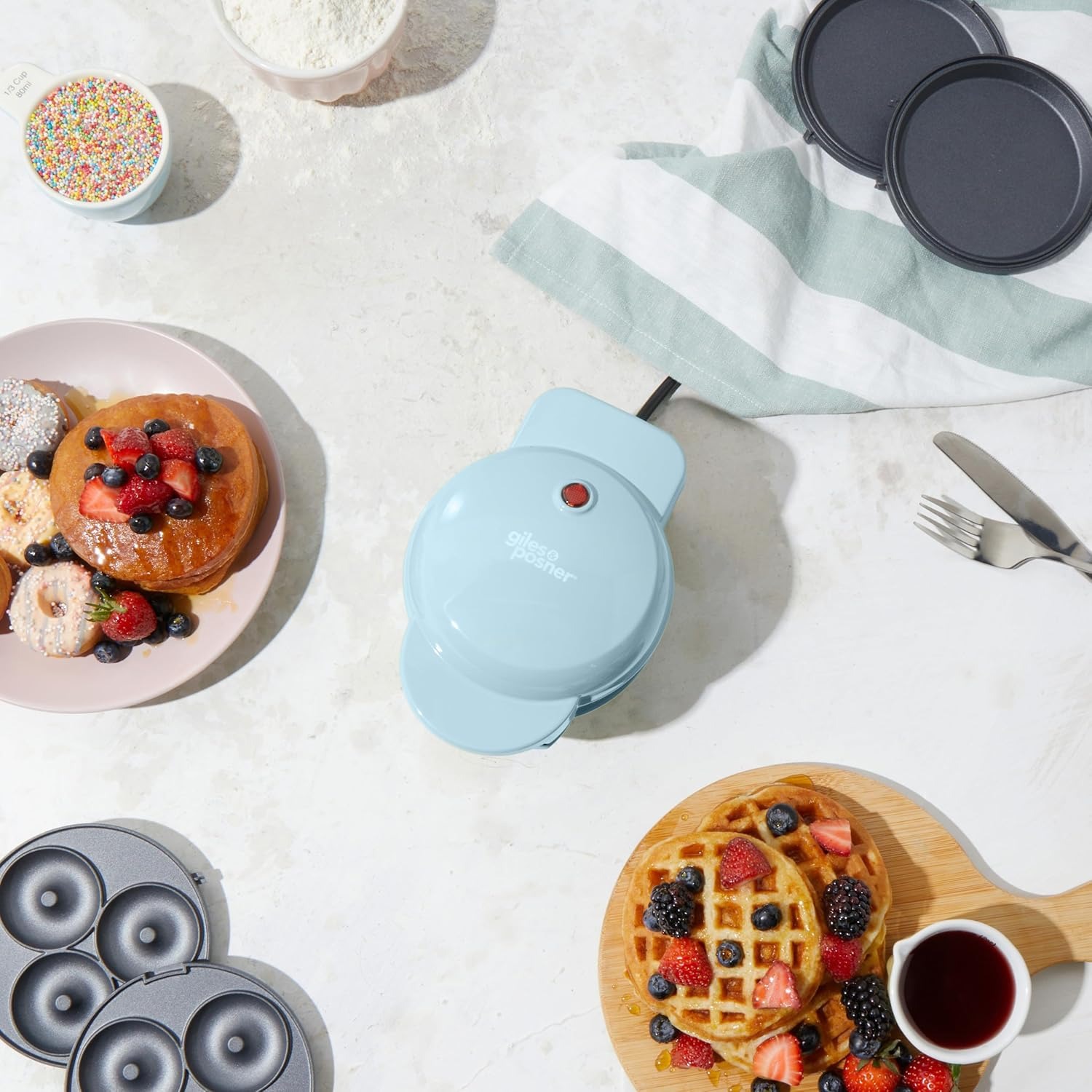Giles & Posner 3 in 1 Mini-Bites Maker - Piastre di cottura antiaderenti, macchina per donuts, waffle e pancake, 3 minuti di preriscaldamento, piedini antiscivolo, luci indicatori di prontezza, 400W