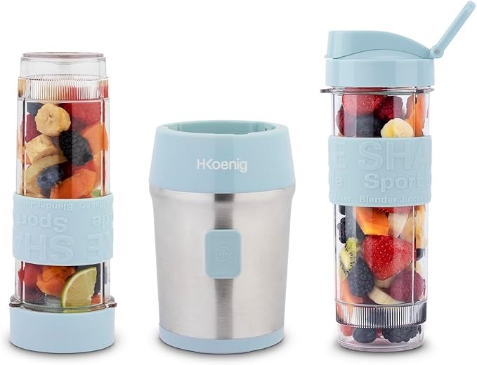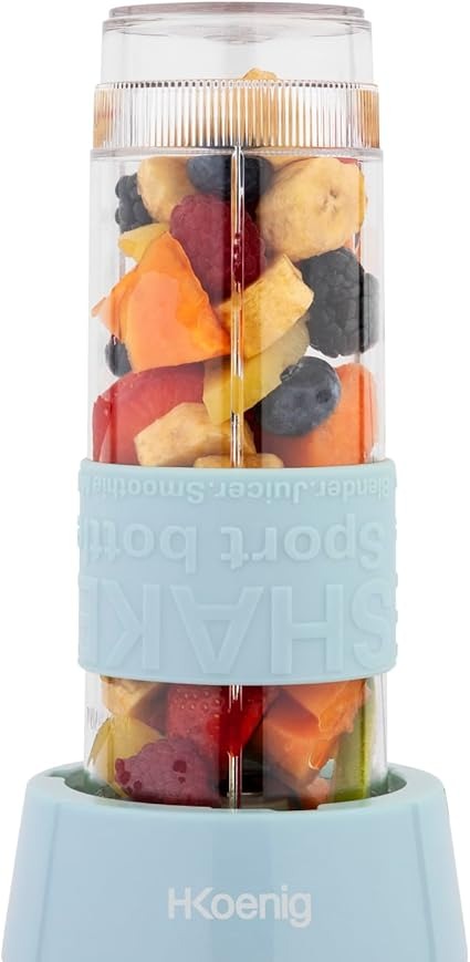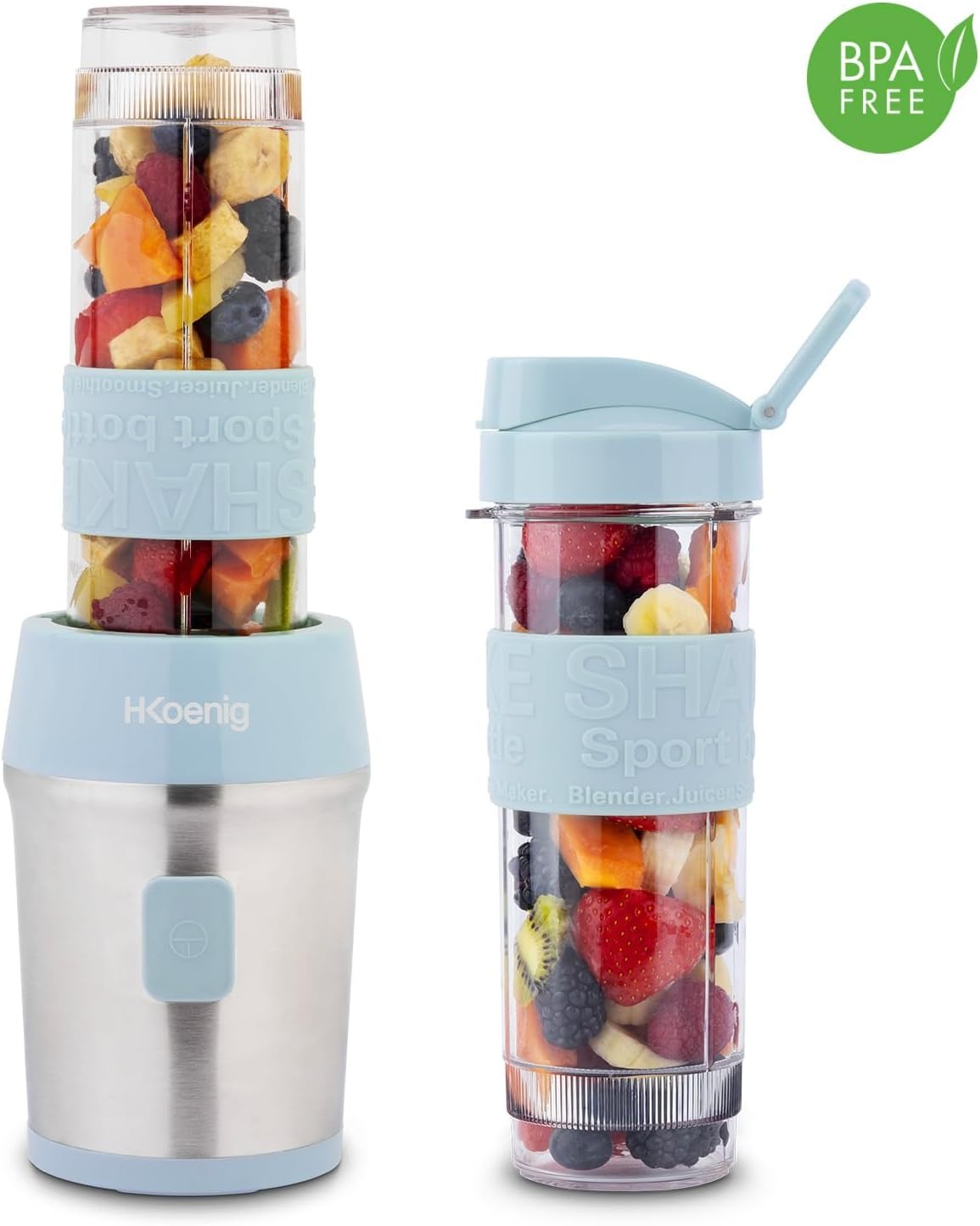 H.Koenig Mini Frullatore per SMOOTHIE Compatto 570mL SMOO16 Senza BPA Potente 300W, Frullatore per smoothie e frullati 2 Bottiglie Portatili con coperchio, 4 Lame in acciaio Inox, Blu pastello