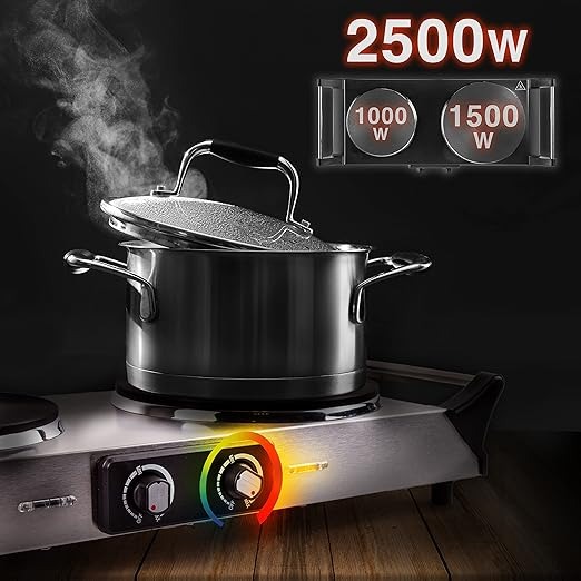 Duronic HP2 SS Fornello Elettrico 2500W 2 Piastre in Ghisa con Manici Termoisolati Temperatura Regolabile Piano Cottura Portatile per Campeggio Viaggi Ufficio e Casa Acciaio Inox Argento