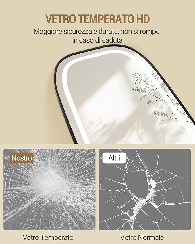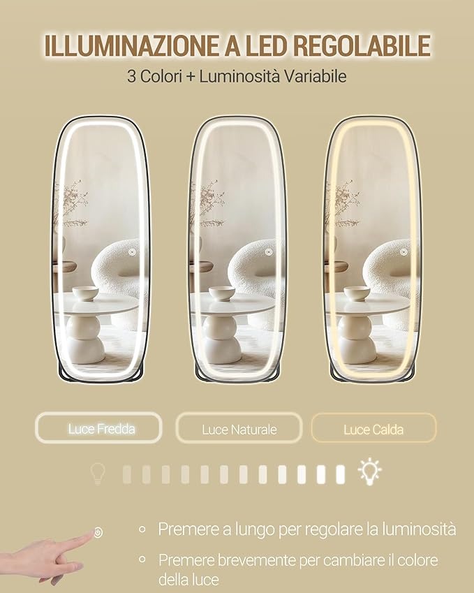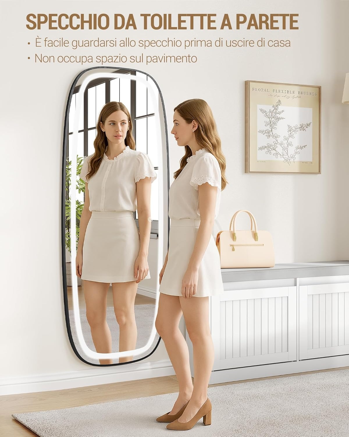 Hzuaneri Specchio da terra con luci, LED Specchio da Parete Lungo, 160 x 50 cm, Specchio Curvo da Terra con supporto, 3 colori di illuminazione, Adatto per Camera da Letto, Soggiorno, Nero DM41801B