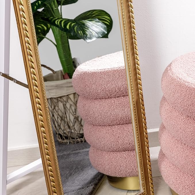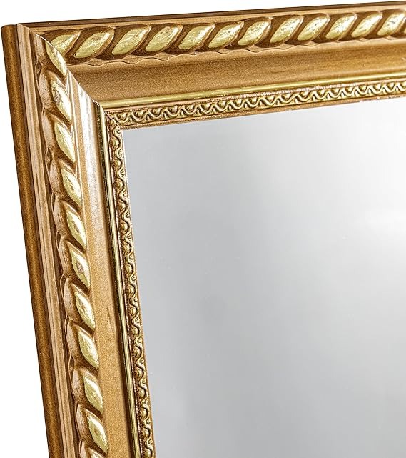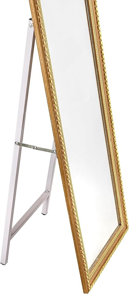 Baroni Home Specchio da Terra con Struttura in Acciaio, Specchio a Figura Intera con Supporto Pieghevole con Cornice Decorata in Legno, Riccioli Oro, 40x150 cm