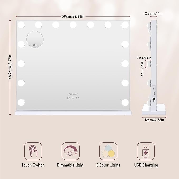 ADDCOLOR Hollywood Specchio Trucco con Luci, Specchio da Tavolo con 15 LED Lampadine e Porta di Ricarica USB, 3 Modalità di Illuminazione Regolabili Specchio da Parete con 10X Specchio (58*2,8*46CM) [Classe di efficienza energetica F]