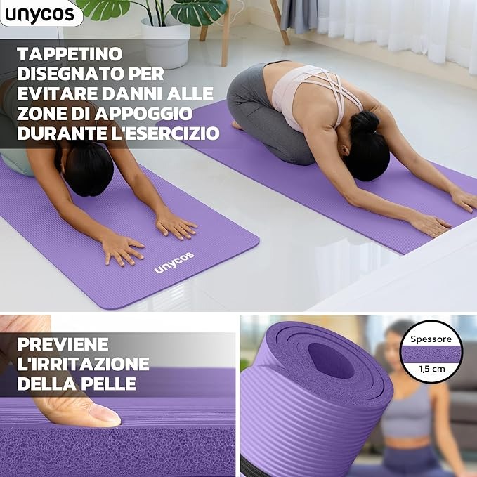 unycos - Tappetino Antiscivolo da Yoga, Pilates e Ginnastica Extra Spesso 10/15 mm, 183x60 cm | 72,04"x23,62" Materassino Fitness, Schiuma NBR, Tracolla, Borsa, E-Book di 50 Esercizi