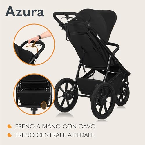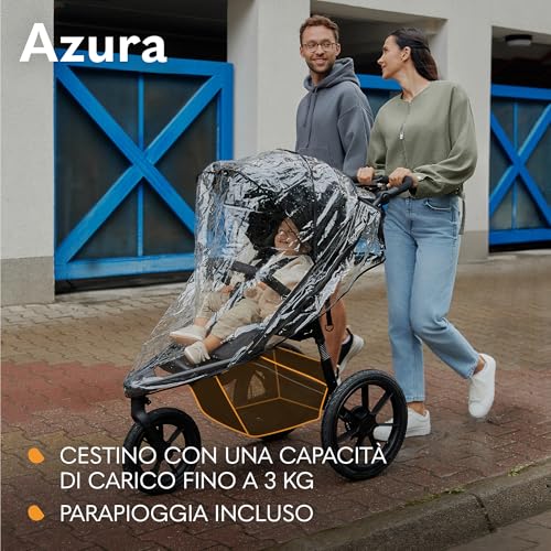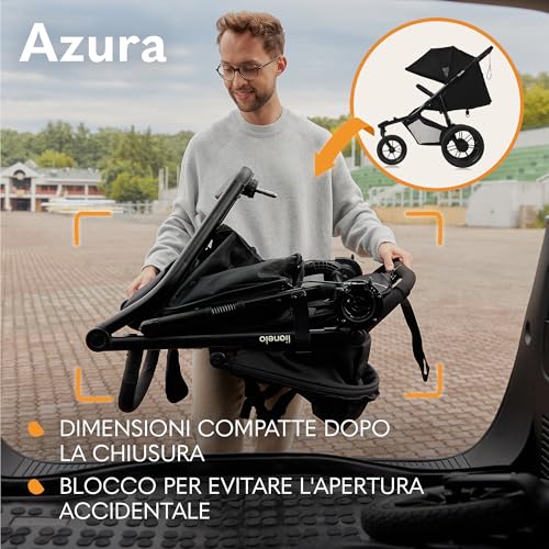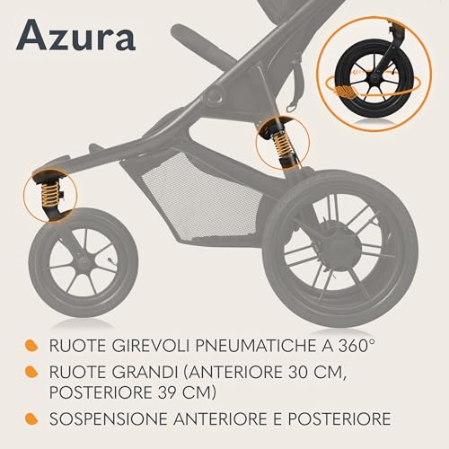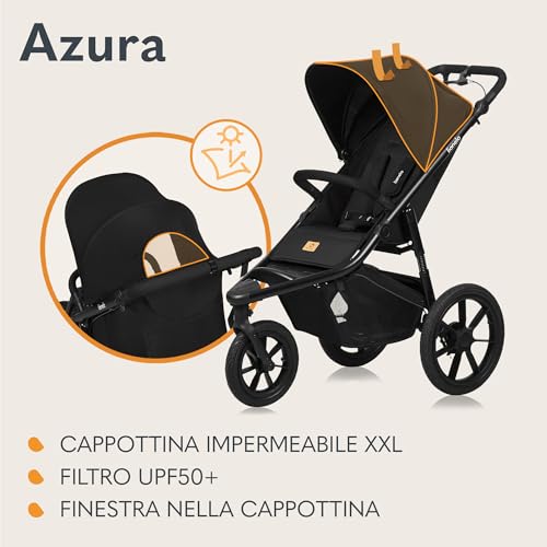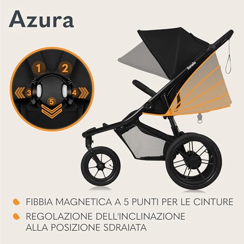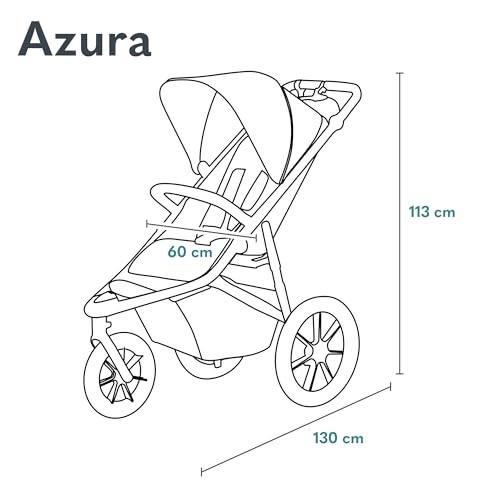 LIONELO AZURA Passeggino per Jogging da 6 mesi a 22kg Passeggino a Tre Ruote, Schienale Regolabile Completamente Reclinabile Grandi Ruote Gonfiabili Sospensione Completa Cappottina XXL : Prima infanzia