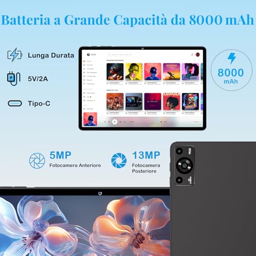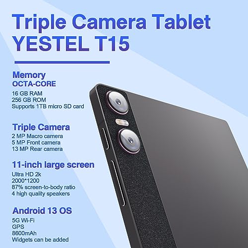 YESTEL Tablet 11 Pollici Android 13 con 16 GB RAM 256 GB ROM (TF 1TB), GPS, 2000 x 1200 IPS, 8600 mAh Ricarica Rapida USB C da 18 W, 4 Altoparlantis, 5MP 13MP 2MP, 5G Wi Fi, Octa Core, Caffè : Informatica