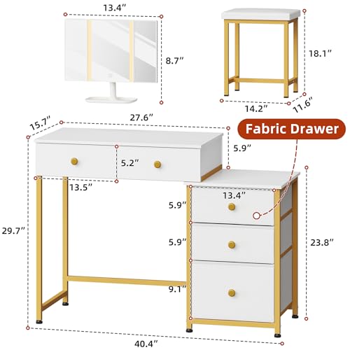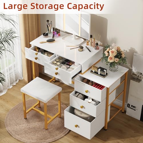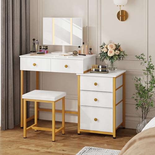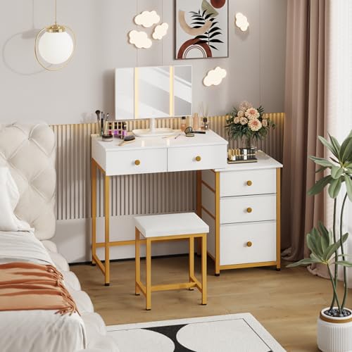 DSAFGGY Scrivania con 5 cassetti e specchio e 3 modalità di illuminazione, trucco Vanity con 5 cassetti per camera da letto, 104 cm, bianco e oro : Amazon.it: Casa e cucina