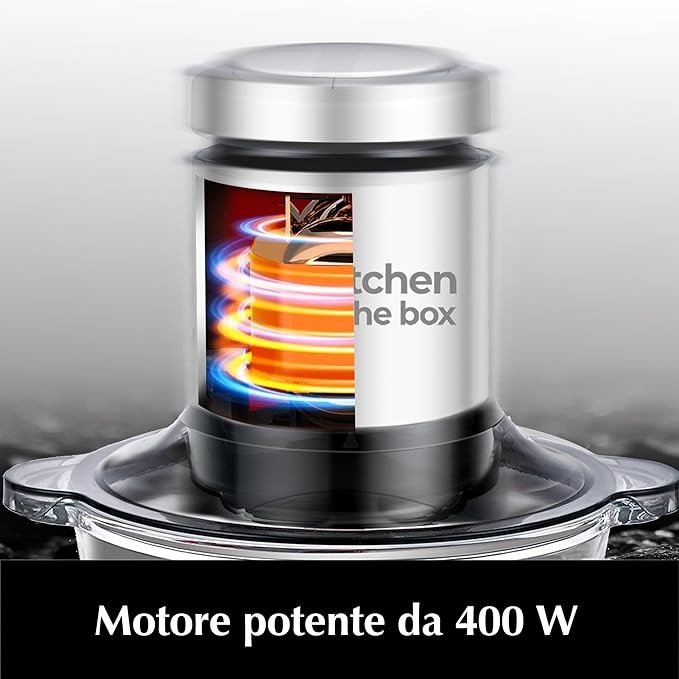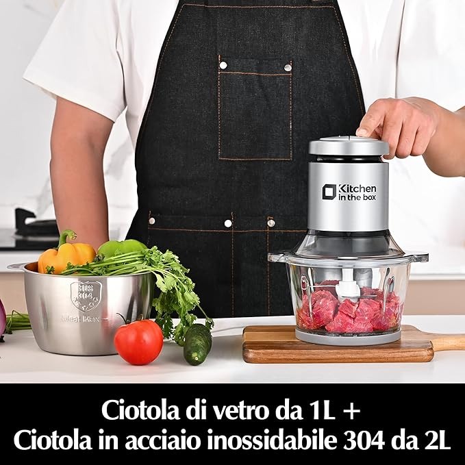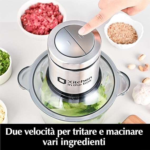 Kitchen in the box Tritatutto 2L con 2 Ciotole,Frullatore con 2 Set di 4 Lame in Acciaio inox,Tritatutto Elettrico a 2 Velocità per Verdure,Carne,Frutta Secca,400W
