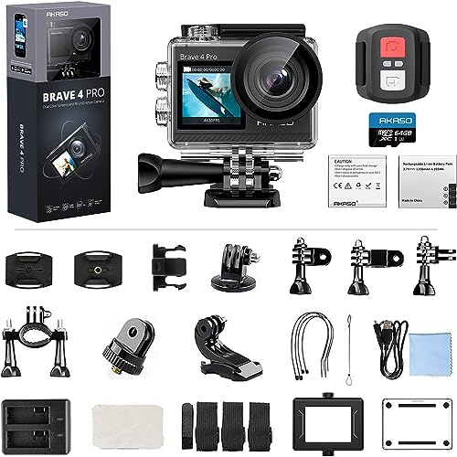 AKASO Brave 4 Pro Action Cam 4K 40M con Scheda di Memoria U3 da 64GB, Videocamera 20MP WiFi 170° Grandangolare Doppio Schermo EIS Stabilizzazione, Touch Screen, 5x Zoom : Elettronica