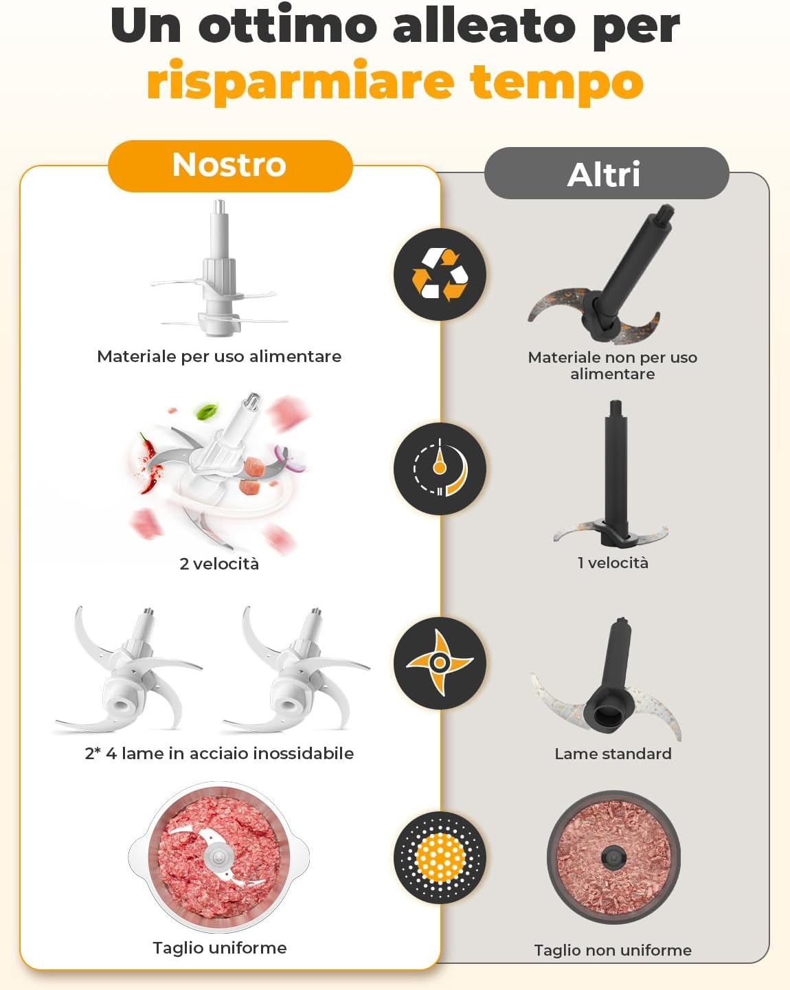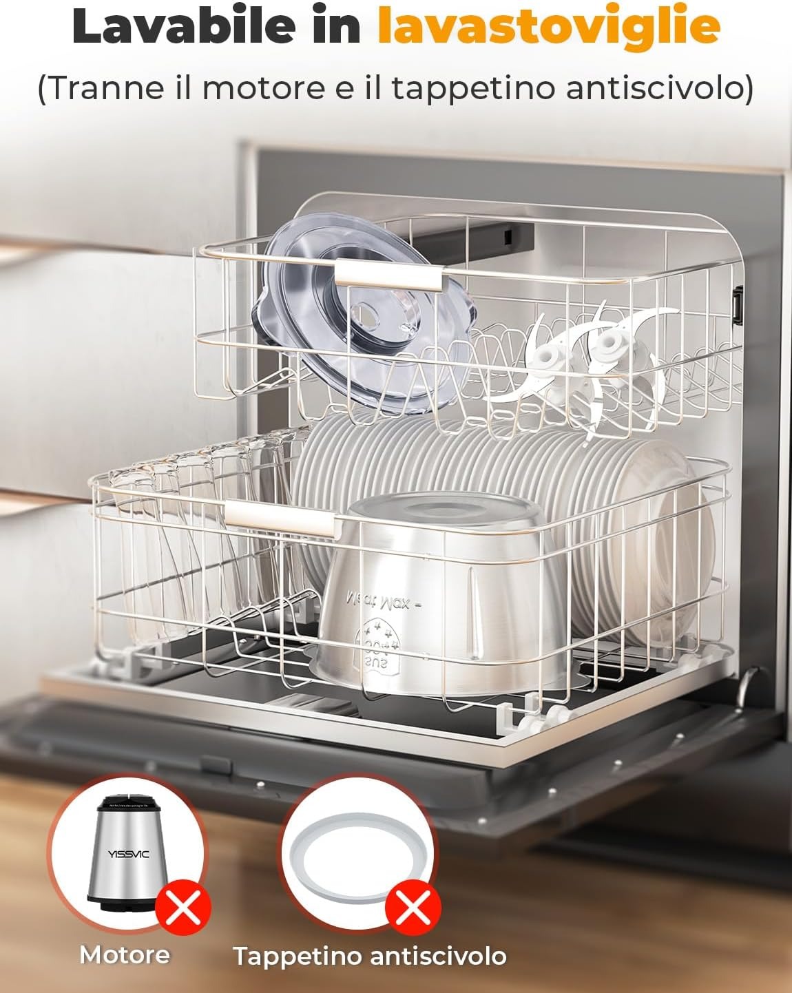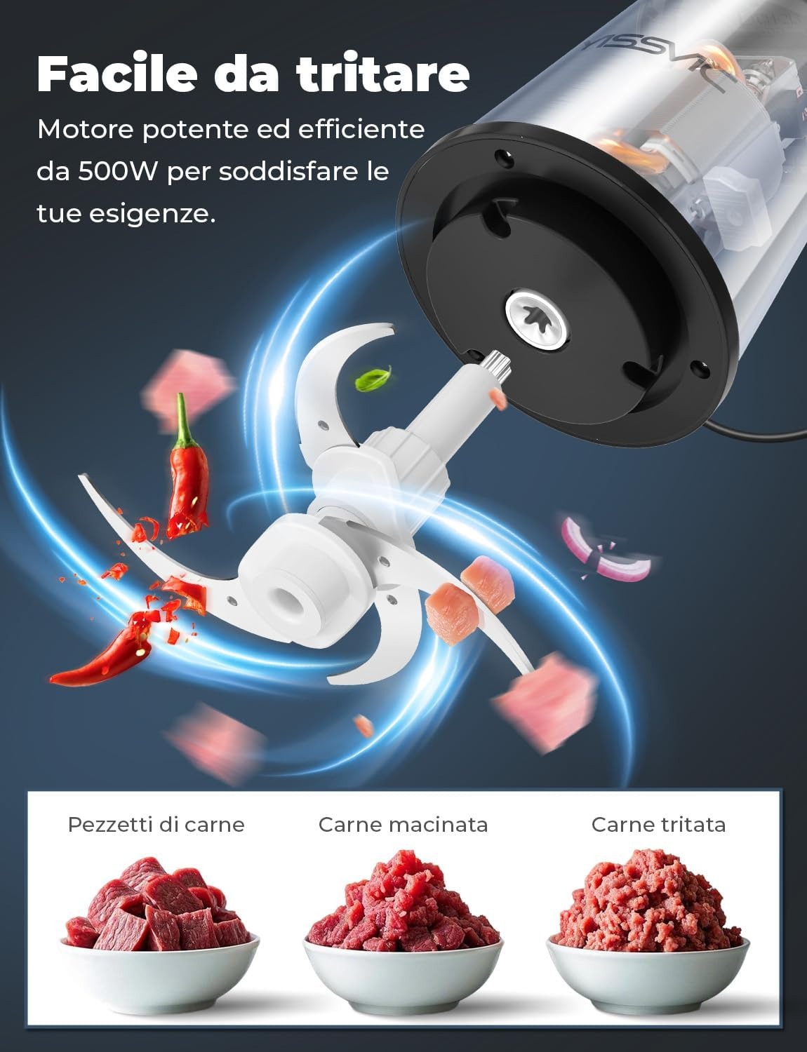 YISSVIC Tritatutto da Cucina Elettrico 2L, 500W, 2 Velocità, 2×4 Lame, Ciotola in Acciaio Inox, Anello Antiscivolo, Lavabile in Lavastoviglie, per Frutta Verdura Carne Spezie Visita lo Store di YISSVIC