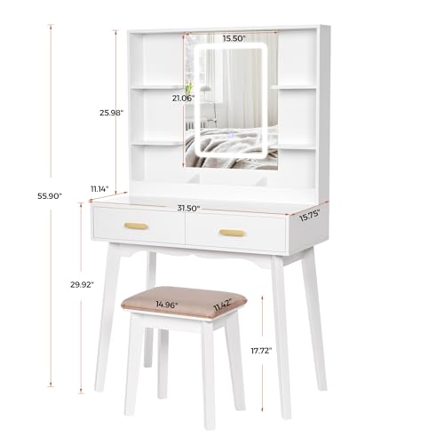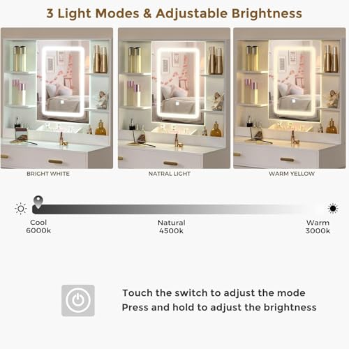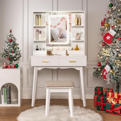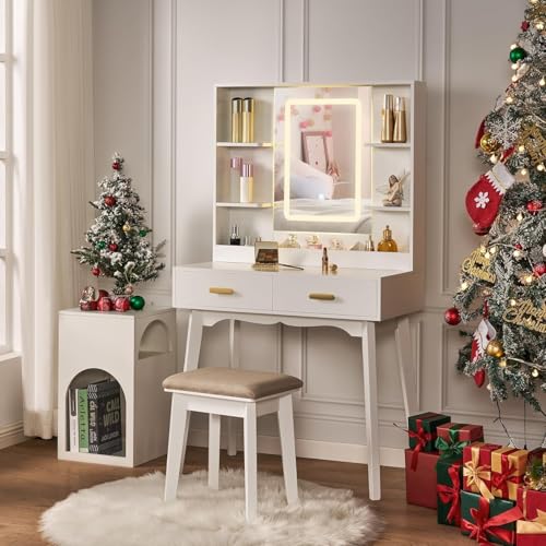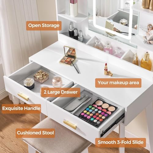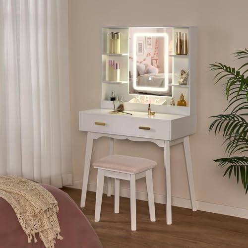 BEWISHOME Toeletta da Trucco con Specchio, Toeletta Bianca con Sgabello, Tavolo da Trucco con Luci LED e 3 Modalità Colore, Postazione Trucco con 2 Cassetti e 4 Ripiani Aperti,Toeletta Moderna EFST22W : Amazon.it: Casa e cucina