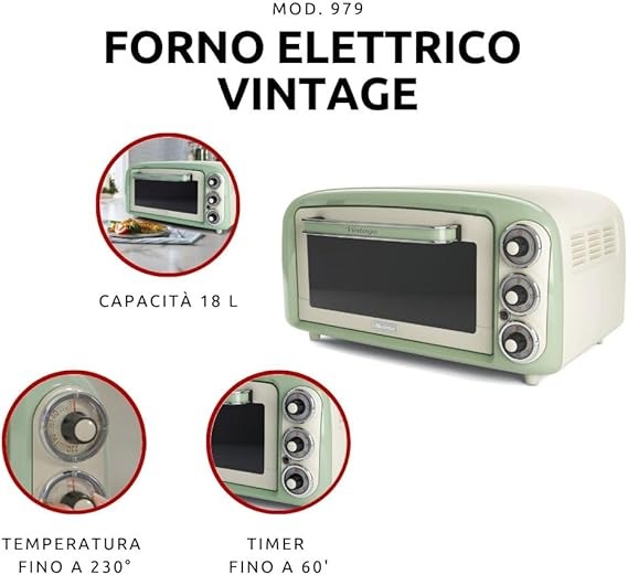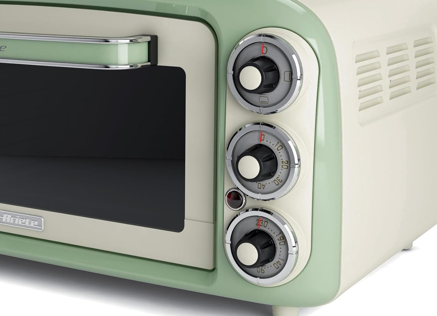 Ariete 979 Forno Elettrico di Design 18 Litri - Ideale per pizza da 30 cm - Doppio vetro - 1380 Watt - Acciaio Inox - Linea Vintage - Verde