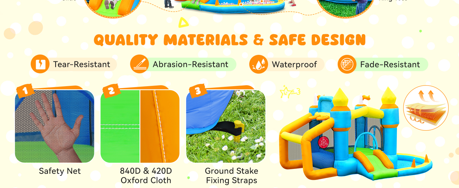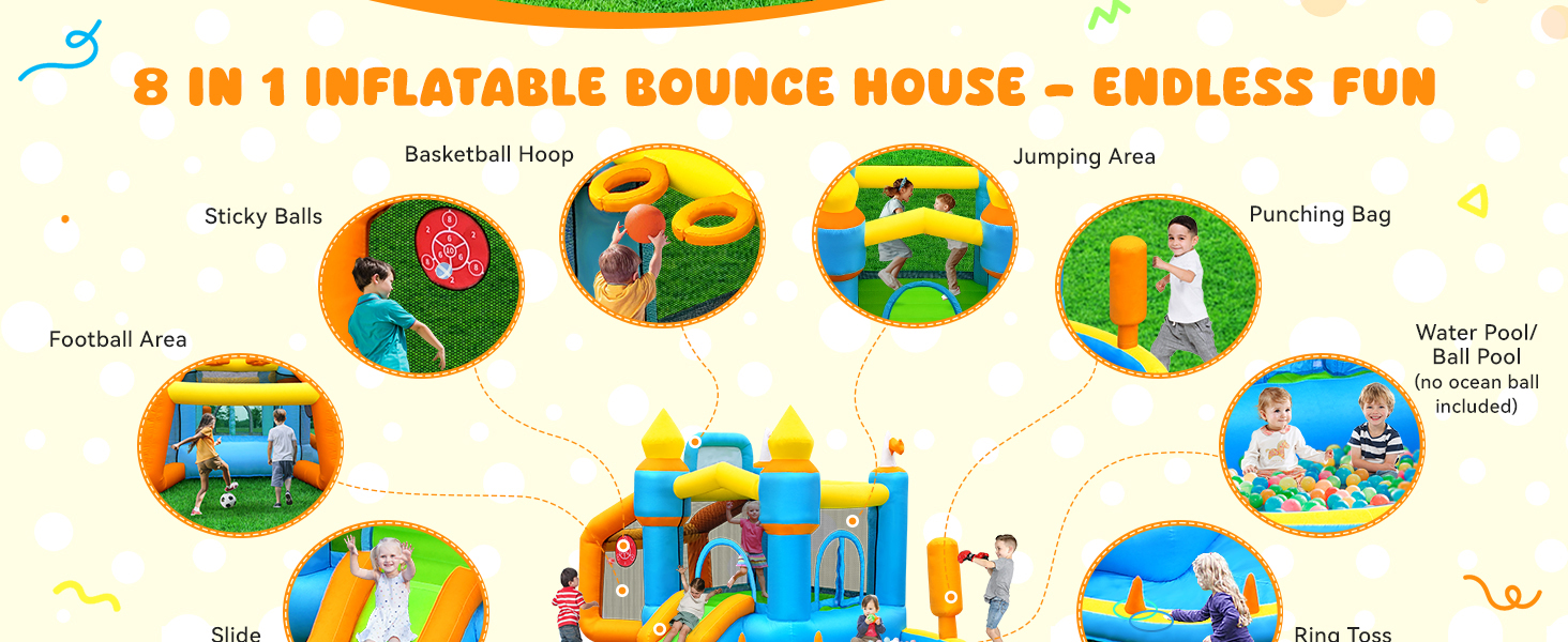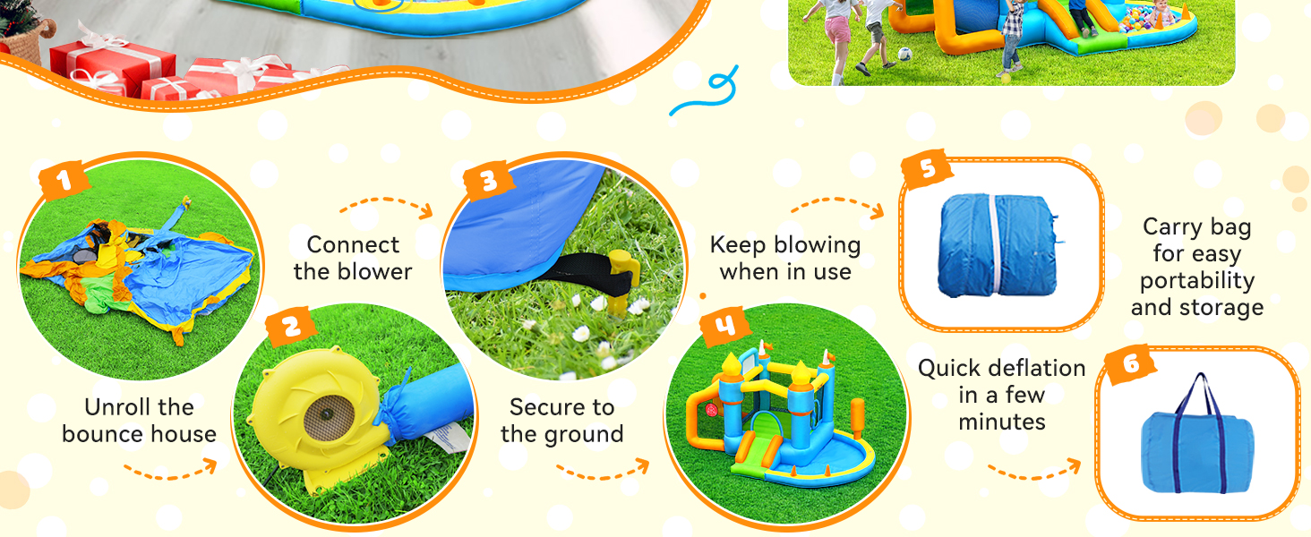 Informazioni su questo articolo Divertimento senza fine: Questo castello gonfiabile è dotato di area per il salto, scivolo, canestro, piscina di palline, lancio di anelli, sacco da boxe, area per il calcio, palline adesive. Combina una varietà di aree di gioco in una sola, in grado di soddisfare i molteplici desideri del bambino in una sola volta. Inoltre, può ospitare più bambini che giocano insieme per ore di divertimento. Materiali di prima qualità: Il nostro castello gonfiabile per bambini è realizzato in tessuto Oxford 840D e 420D, resistente all'usura, agli strappi e che non perde colore. L'area di salto è circondata da una rete di sicurezza a maglia visiva per proteggere i bambini dalle cadute durante i salti e il gioco, oltre a essere comoda per prendersi cura dei bambini. Il soffiatore deve rimanere acceso durante l'utilizzo del castello gonfiabile. Facile da installare e conveniente: Offre un'esperienza migliore e fa risparmiare tempo. Questa casa gonfiabile è dotata di un soffiatore da 350 W che si gonfia e si sgonfia rapidamente. Questa casa gonfiabile con scivolo è adatta per uso interno ed esterno. Viene fornito con una borsa per il trasporto, si può anche facilmente portare al parco, parco giochi, campeggio e altri luoghi da utilizzare, è molto comodo da trasportare. Regalo perfetto: questo castello gonfiabile per bambini da 3 a 12 anni è un ottimo regalo per compleanni, vacanze o qualsiasi occasione speciale, ed è perfetto per riunioni di famiglia, feste e tutti i tipi di feste. E si può bagnare o asciugare, tutte le stagioni sono adatte per l'uso. Questa casa gonfiabile può portare gioia infinita ai bambini. Tutto ciò che serve: Il nostro castello gonfiabile da interno include tutti gli accessori necessari e istruzioni dettagliate. In particolare, include 1 soffiatore da 350W, 1 borsa per il trasporto, 1 pallone da basket gonfiabile, 1 pallone da calcio gonfiabile, 4 anelli, 5 picchetti per il terreno, 6 palline adesive, 1 gonfiatore, 1 martello di plastica, patch di riparazione. › Visualizza altri dettagli prodotto Informazioni su questo articolo Divertimento senza fine: Questo castello gonfiabile è dotato di area per il salto, scivolo, canestro, piscina di palline, lancio di anelli, sacco da boxe, area per il calcio, palline adesive. Combina una varietà di aree di gioco in una sola, in grado di soddisfare i molteplici desideri del bambino in una sola volta. Inoltre, può ospitare più bambini che giocano insieme per ore di divertimento. Materiali di prima qualità: Il nostro castello gonfiabile per bambini è realizzato in tessuto Oxford 840D e 420D, resistente all'usura, agli strappi e che non perde colore. L'area di salto è circondata da una rete di sicurezza a maglia visiva per proteggere i bambini dalle cadute durante i salti e il gioco, oltre a essere comoda per prendersi cura dei bambini. Il soffiatore deve rimanere acceso durante l'utilizzo del castello gonfiabile. Facile da installare e conveniente: Offre un'esperienza migliore e fa risparmiare tempo. Questa casa gonfiabile è dotata di un soffiatore da 350 W che si gonfia e si sgonfia rapidamente. Questa casa gonfiabile con scivolo è adatta per uso interno ed esterno. Viene fornito con una borsa per il trasporto, si può anche facilmente portare al parco, parco giochi, campeggio e altri luoghi da utilizzare, è molto comodo da trasportare. Regalo perfetto: questo castello gonfiabile per bambini da 3 a 12 anni è un ottimo regalo per compleanni, vacanze o qualsiasi occasione speciale, ed è perfetto per riunioni di famiglia, feste e tutti i tipi di feste. E si può bagnare o asciugare, tutte le stagioni sono adatte per l'uso. Questa casa gonfiabile può portare gioia infinita ai bambini. Tutto ciò che serve: Il nostro castello gonfiabile da interno include tutti gli accessori necessari e istruzioni dettagliate. In particolare, include 1 soffiatore da 350W, 1 borsa per il trasporto, 1 pallone da basket gonfiabile, 1 pallone da calcio gonfiabile, 4 anelli, 5 picchetti per il terreno, 6 palline adesive, 1 gonfiatore, 1 martello di plastica, patch di riparazione. › Visualizza altri dettagli prodotto Product details