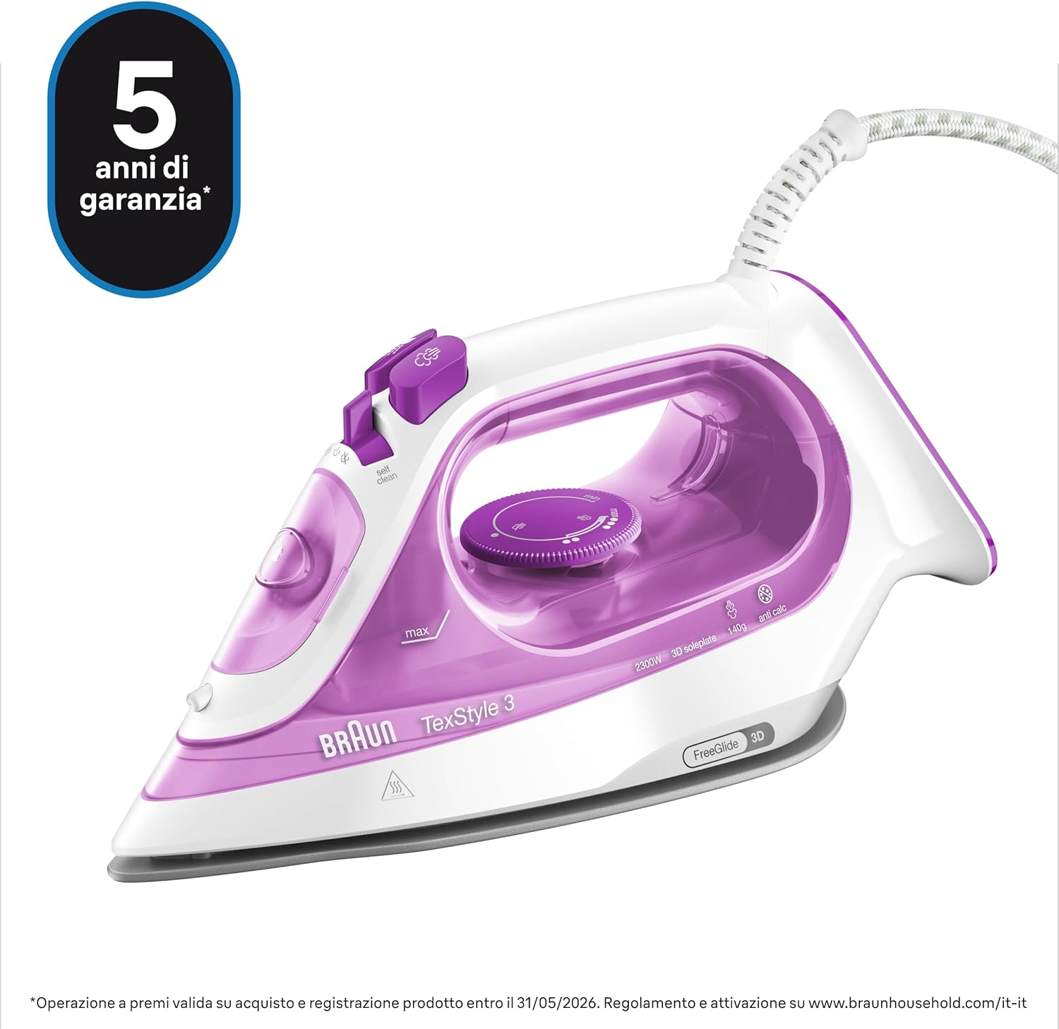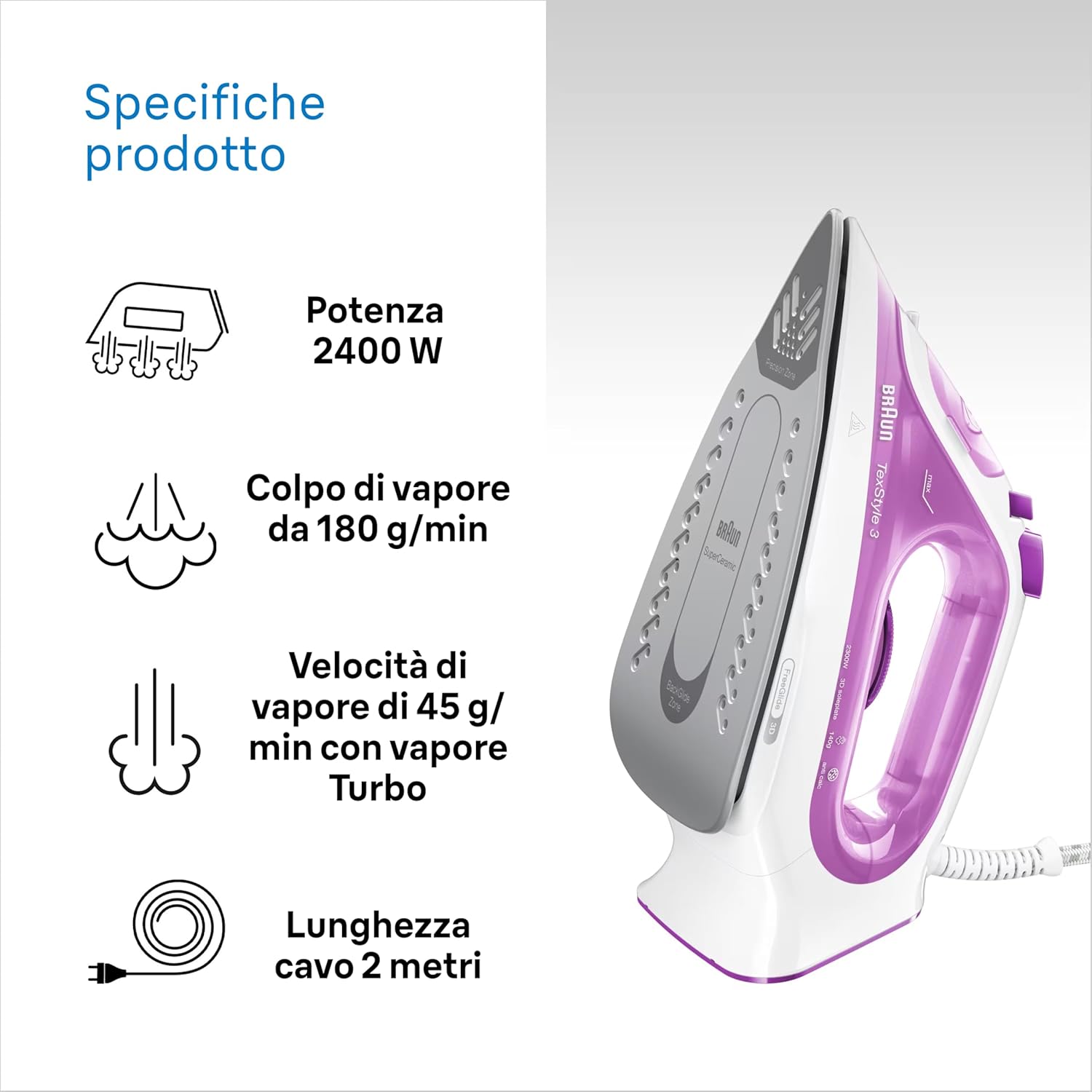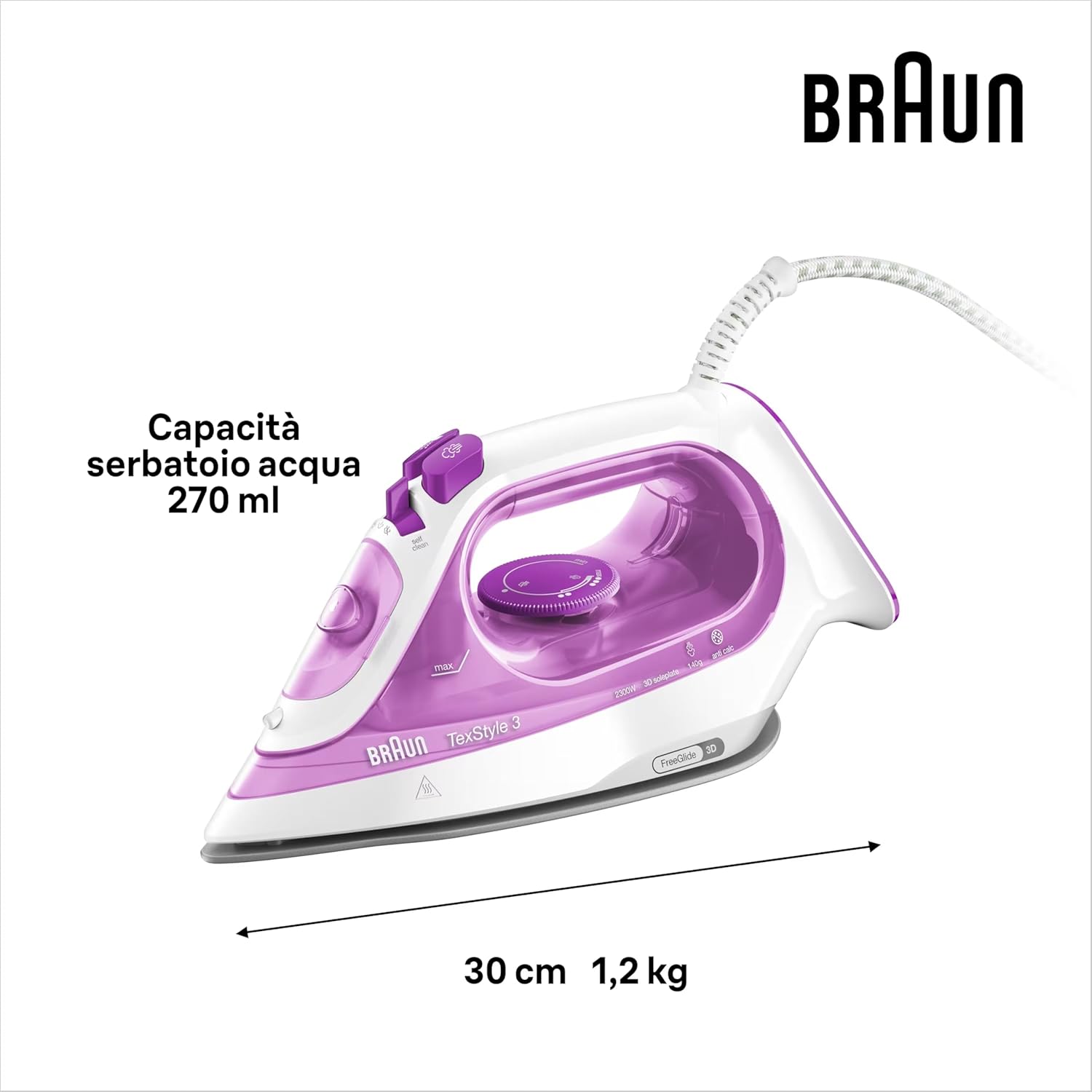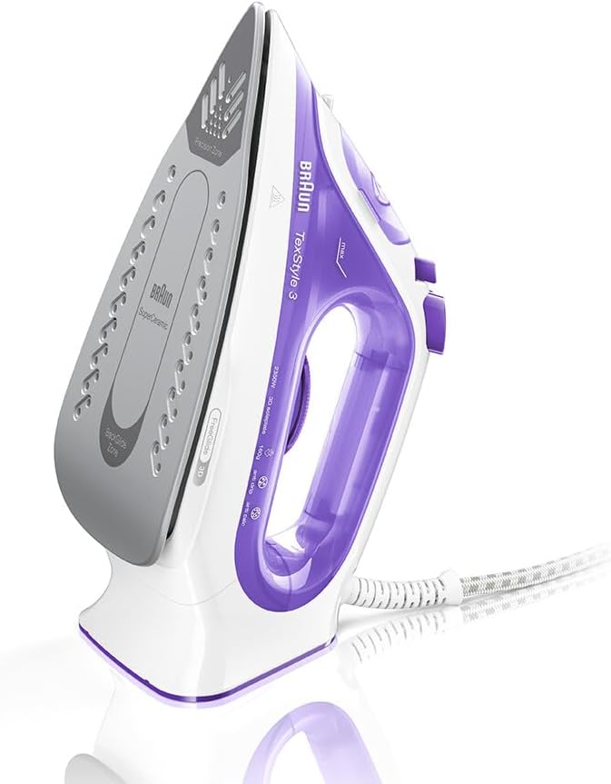 Braun TexStyle3 SI3030PU Steam Iron with 5 Years Service, Ceramic Plate, Vertical Ironing, Precision Tip, Steam Jet 140 g/min, Power 2300 watts, White/Purple