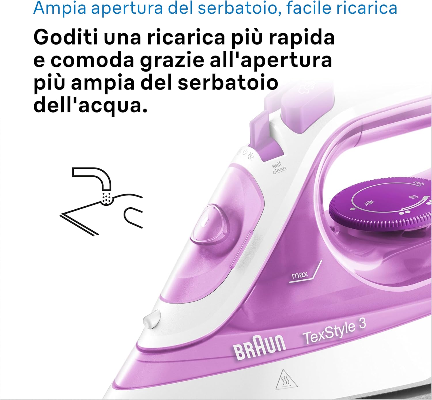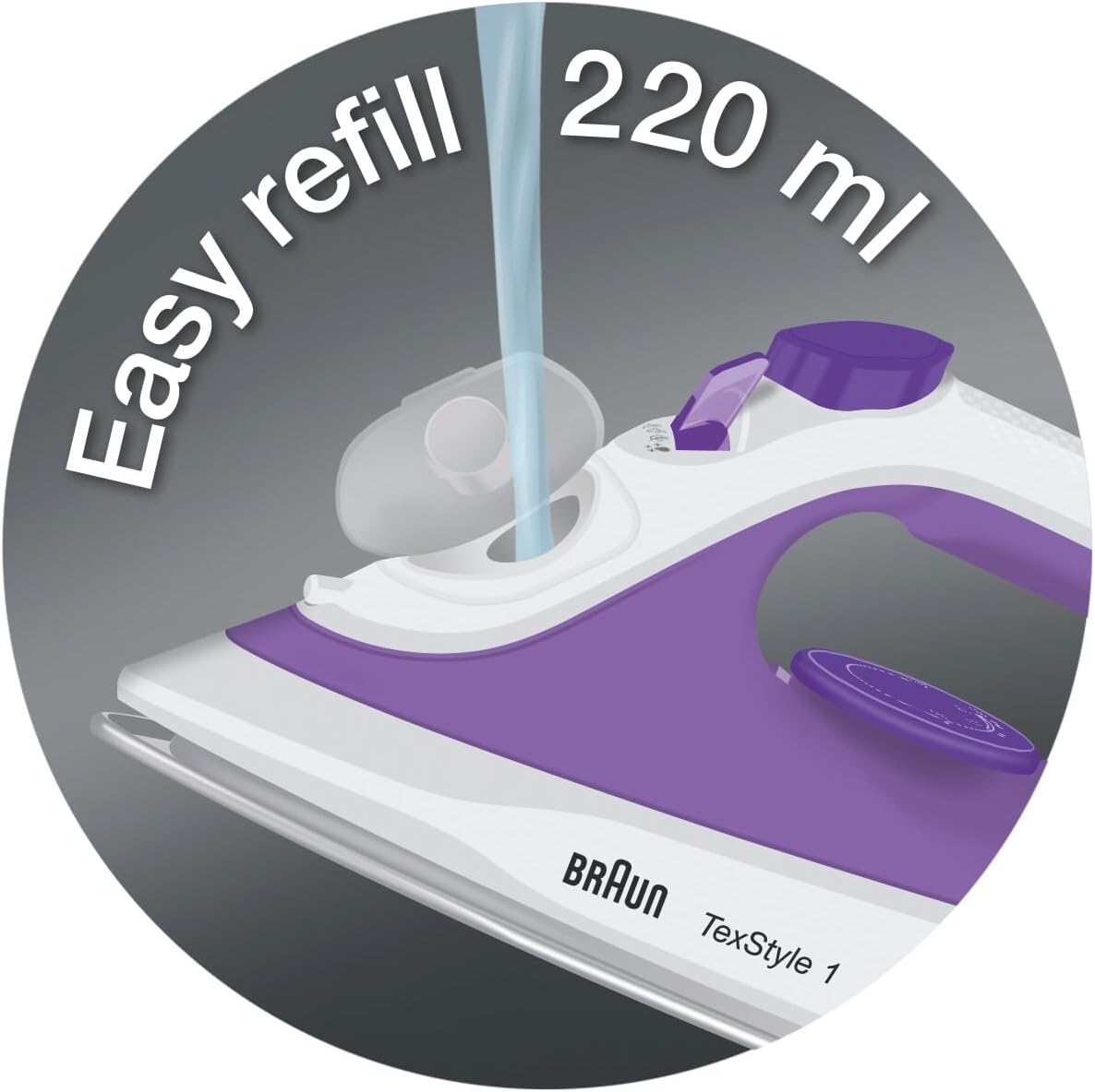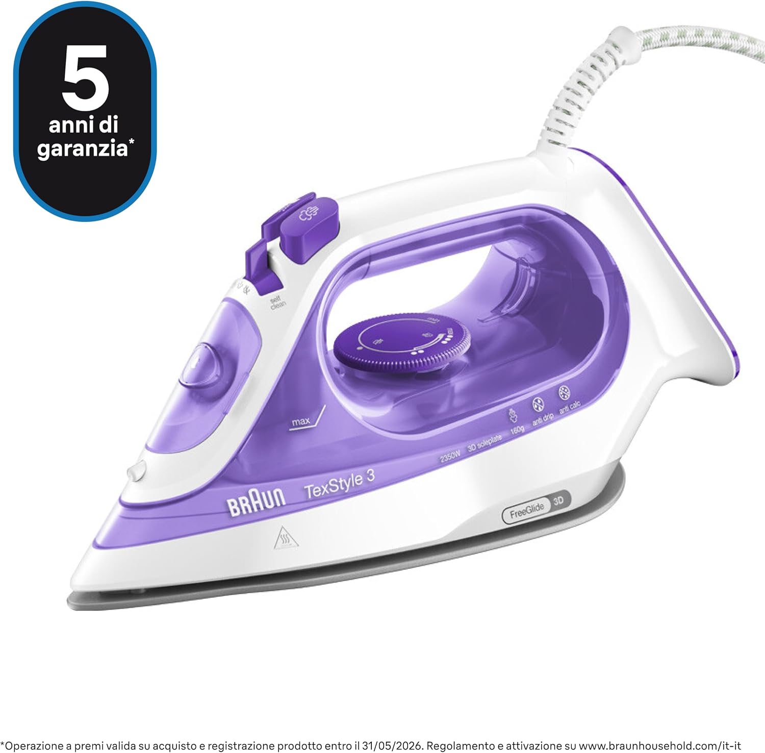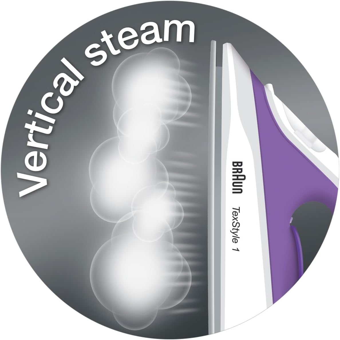 Braun TexStyle3 SI3030PU Steam Iron with 5 Years Service, Ceramic Plate, Vertical Ironing, Precision Tip, Steam Jet 140 g/min, Power 2300 watts, White/Purple