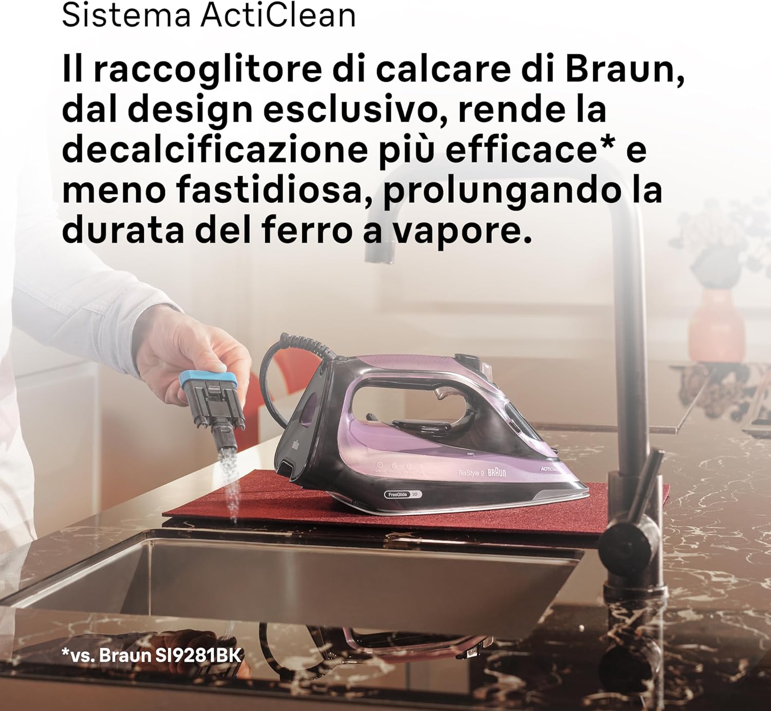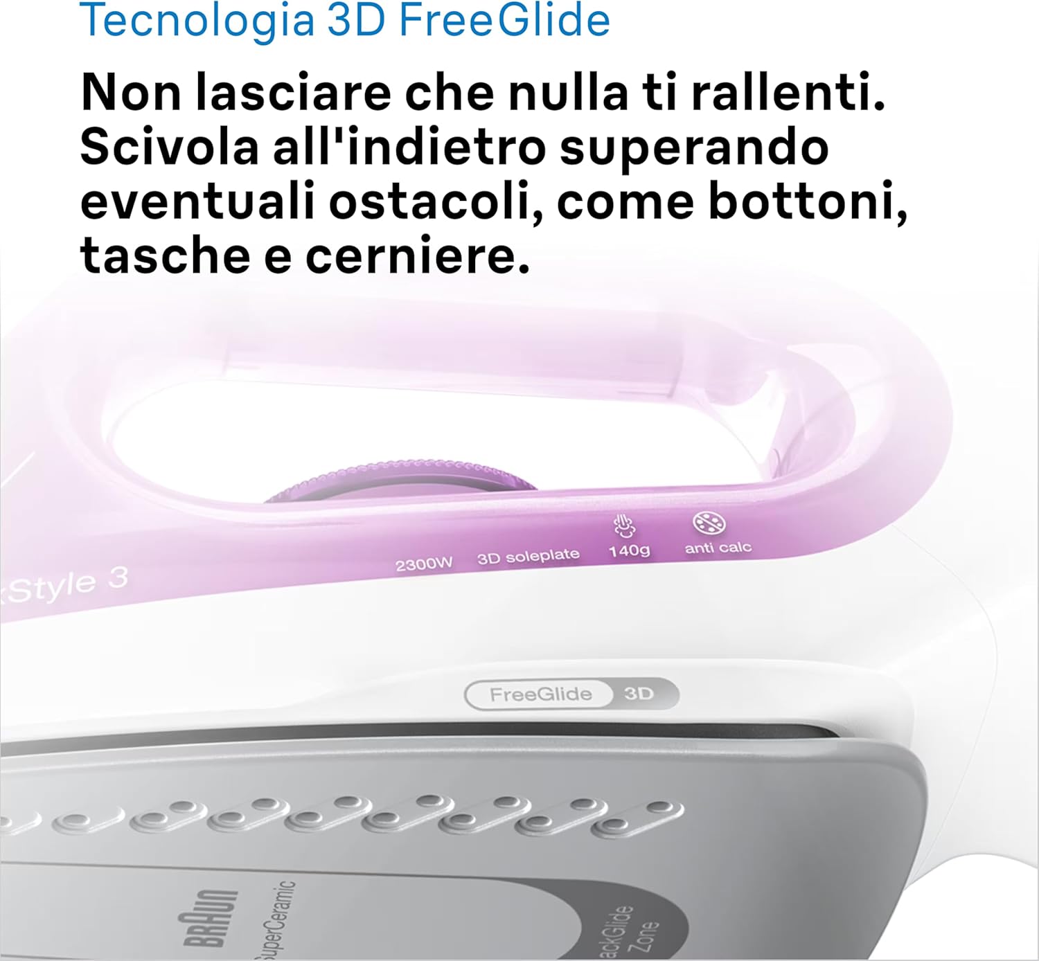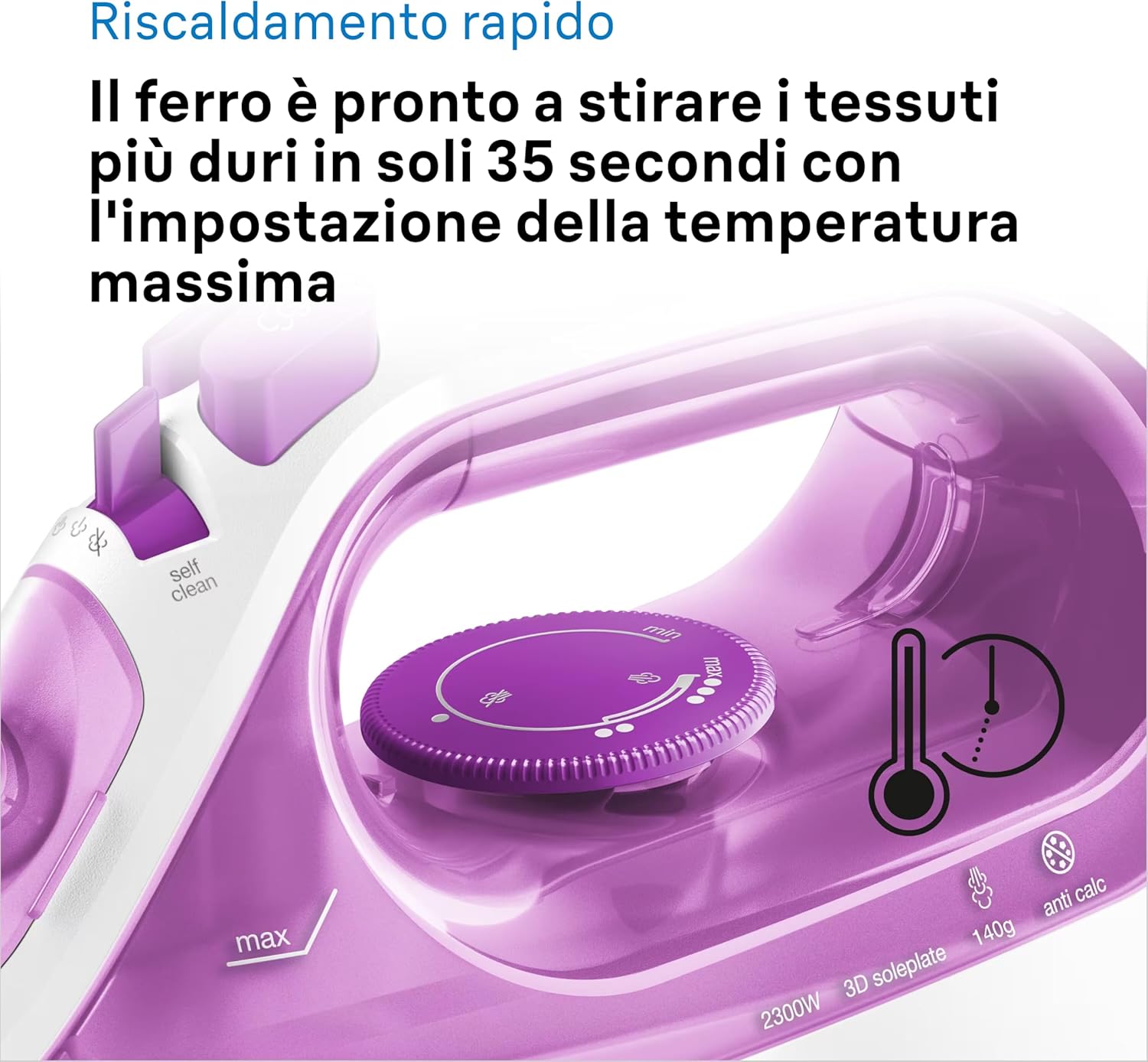 Braun TexStyle3 SI3030PU Steam Iron with 5 Years Service, Ceramic Plate, Vertical Ironing, Precision Tip, Steam Jet 140 g/min, Power 2300 watts, White/Purple