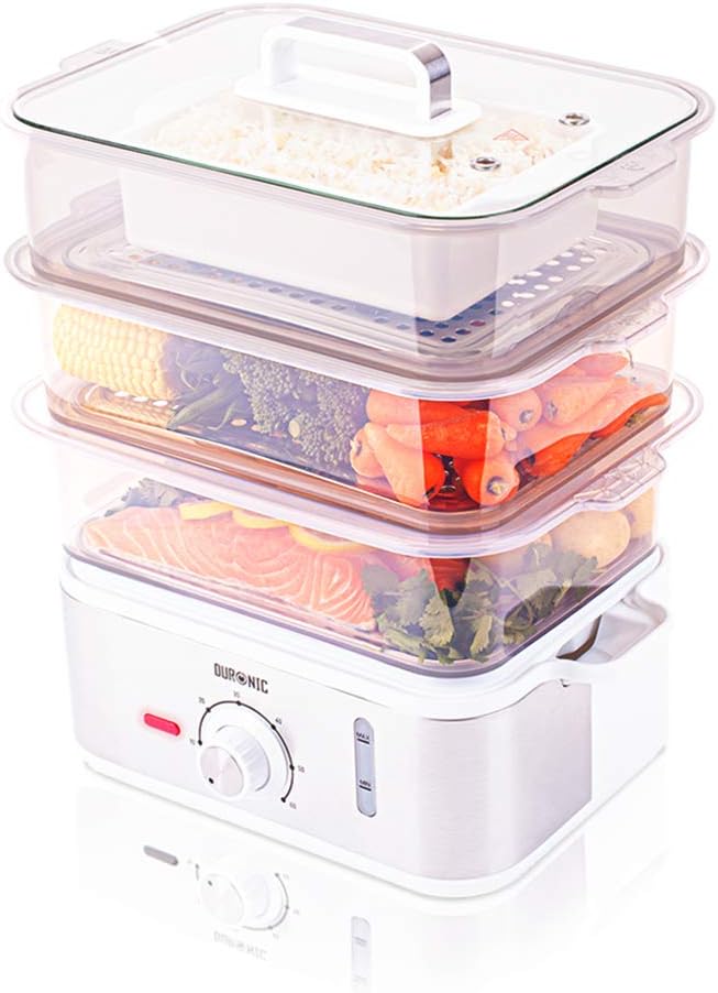 Duronic FS87 Electric Steamer 870W, Total Capacity 10.6L, 1.2L Tank, Integrated Timer, Multi Cooking with 3 Trays with Stainless Steel Base, with Rice Basket, White