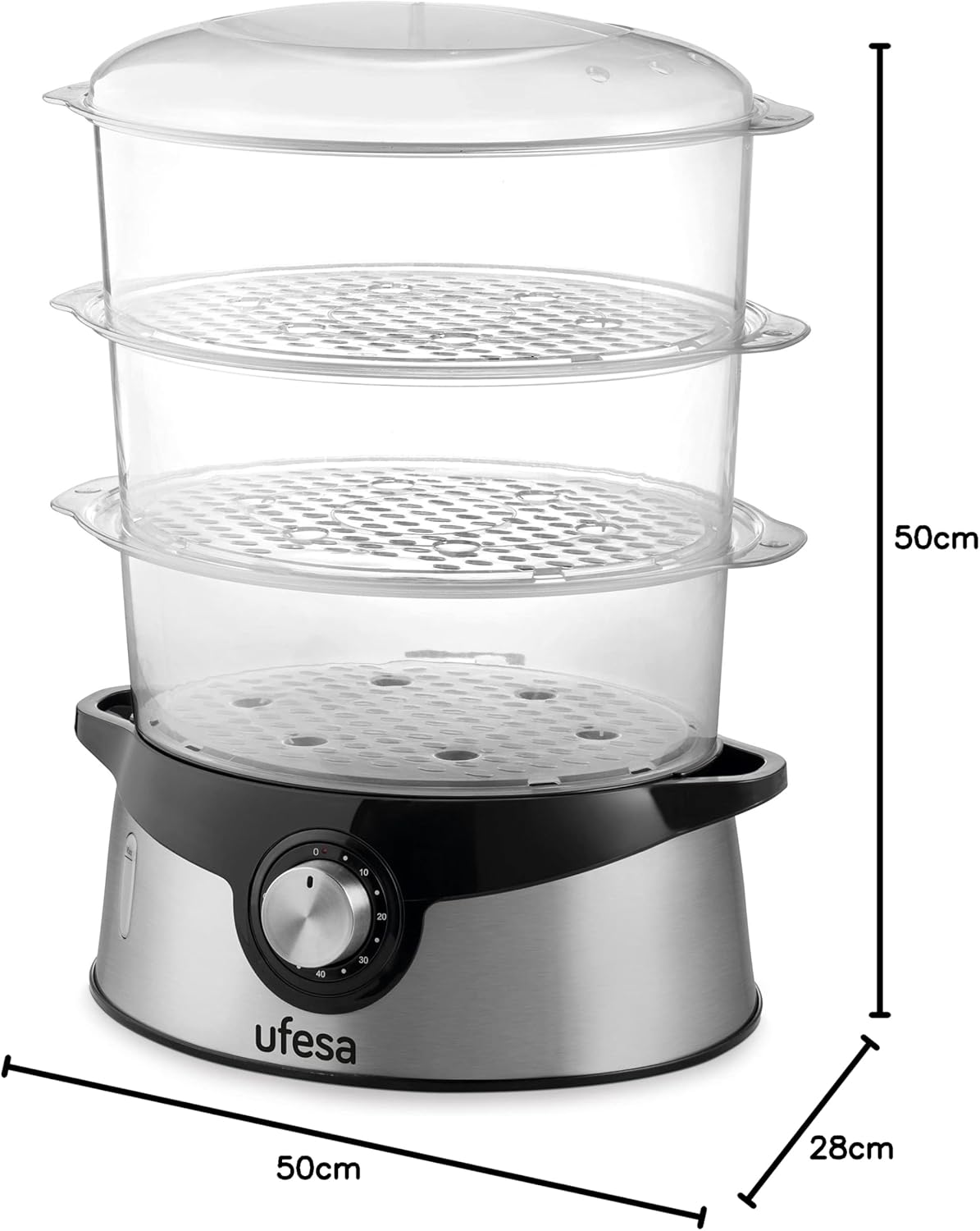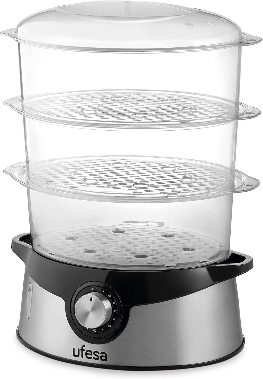 Ufesa CV4000 Steamer 800 W, 3 Stacking Trays, 9 L Capacity, 60 min Timer, Includes 1 Litre Rice Bowl and Egg Holder, BPA-Free, Stainless Steel