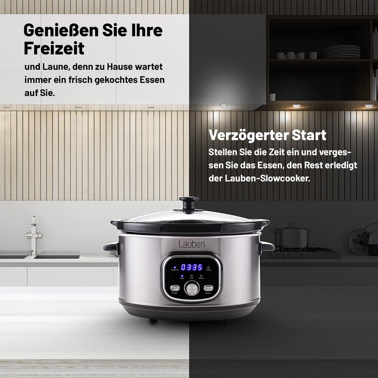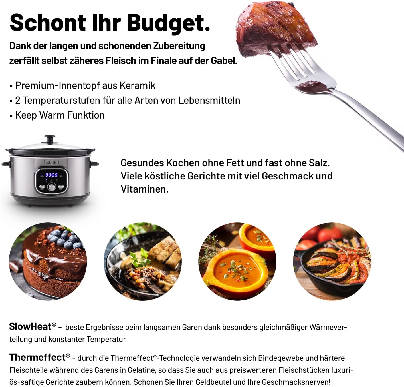 Lauben Slow Cooker 3500SB Thermeffect® SlowHeat® Cooking Pot with Ceramic Inner Container, Two Temperature Levels, Manual Time Adjustment, 3.5 L