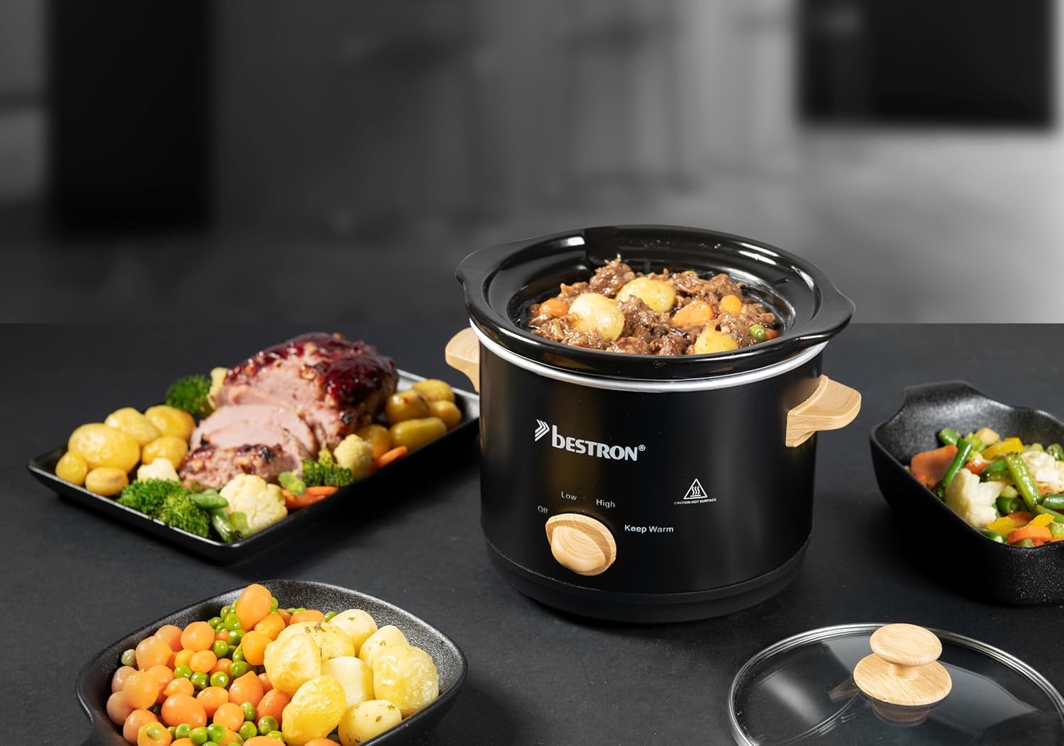 Bestron 2 Person Slowcooker with Ceramic Frying Pan and Glass Lid, 3 Level Thermostat Ideal for Many Dishes such as Meat, Soups and Vegetables, 1.5 Litres, Black and Wood, Black/Wood