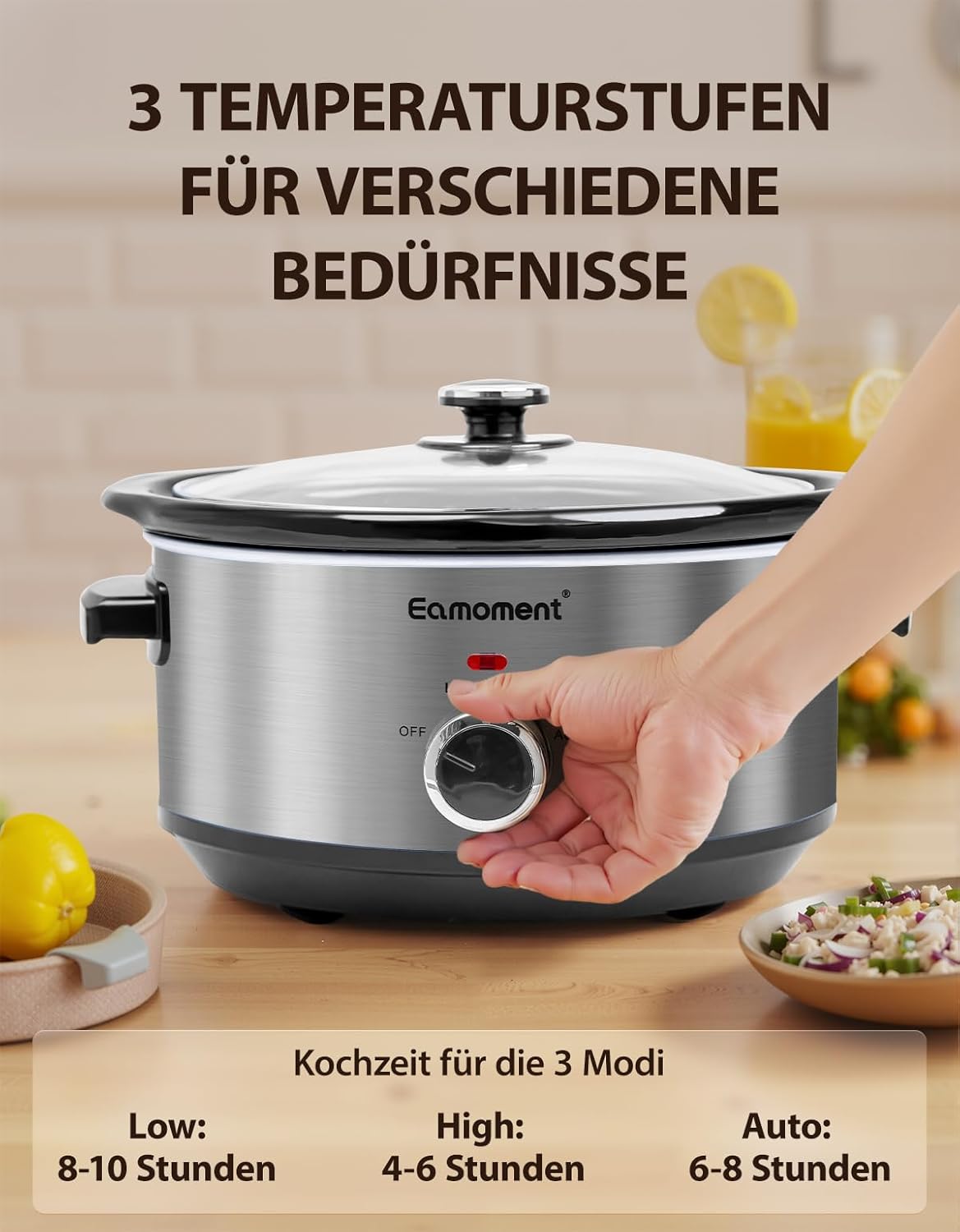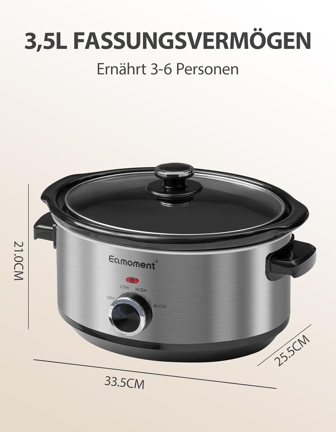 Eamoment 3.5L | 200W Slow Cooker with 3 Heat Settings and Power Indicator, Dishwasher Safe and Handles, Easy Clean Glass Lid (Red)