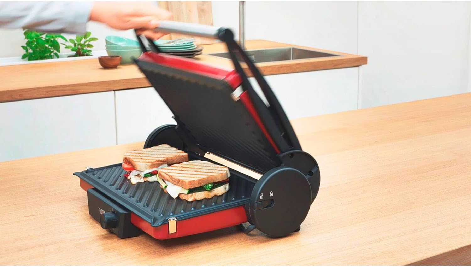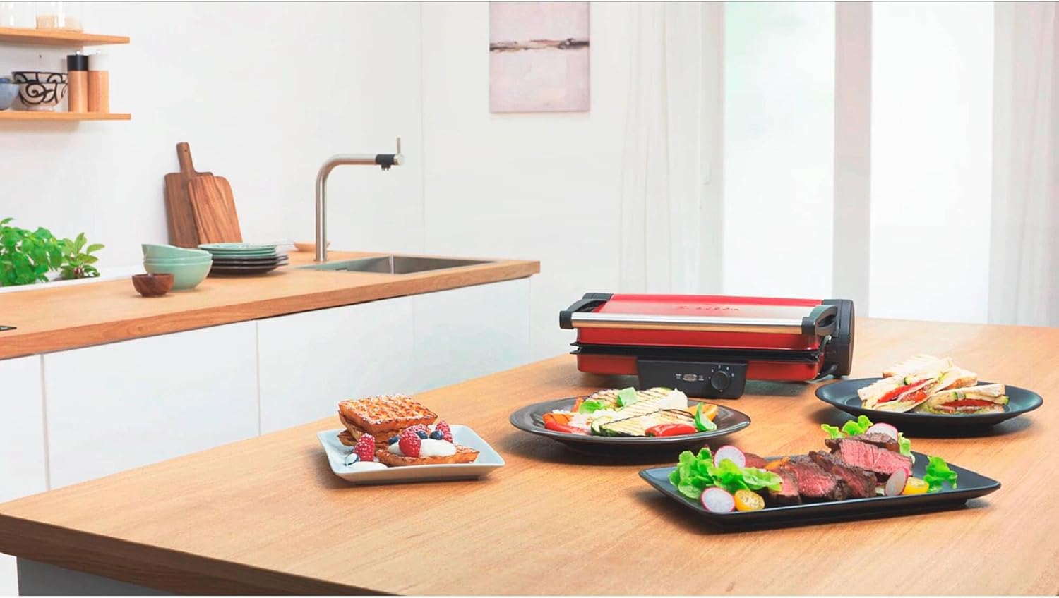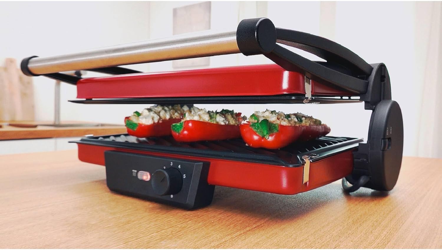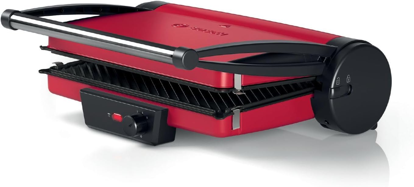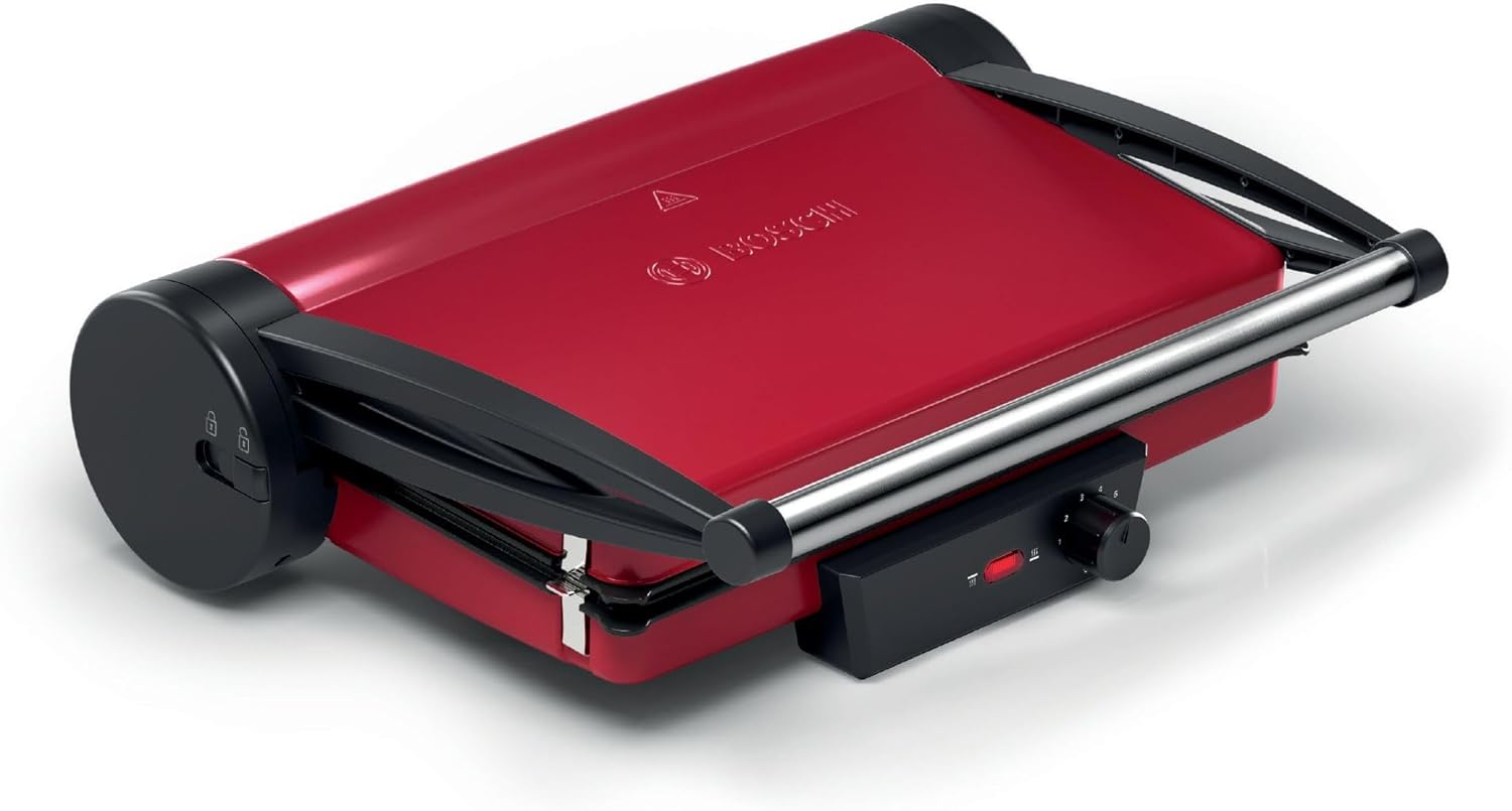 Bosch Elettrodomestici TCG4104 - Bistecchiera Griglia a Contatto, 5 Livelli di temperatura, 2000W, Alluminio, Rosso