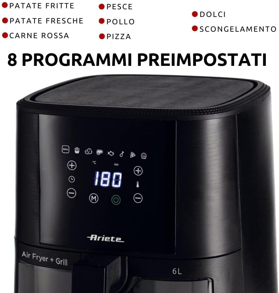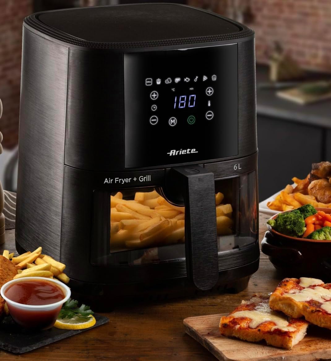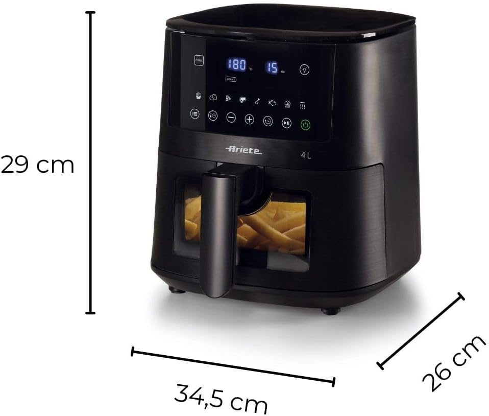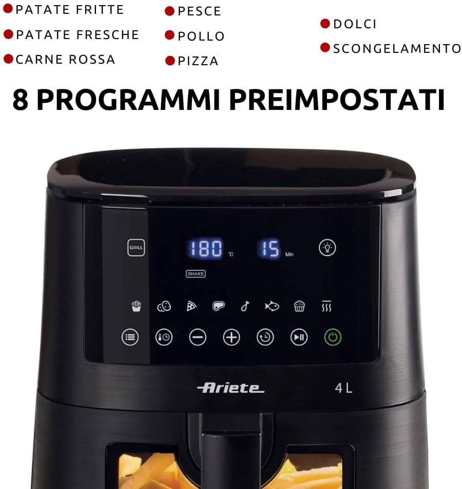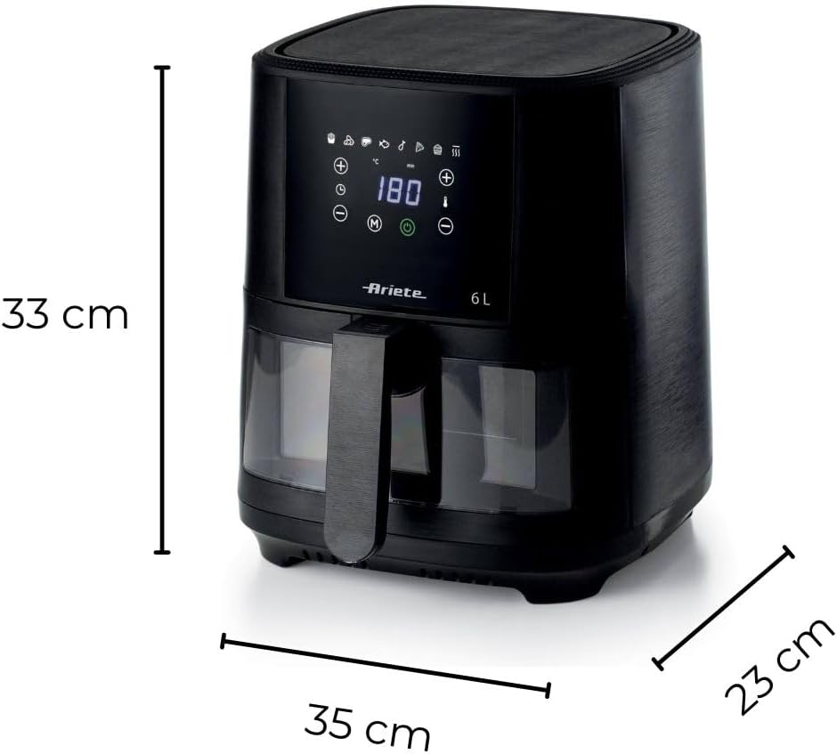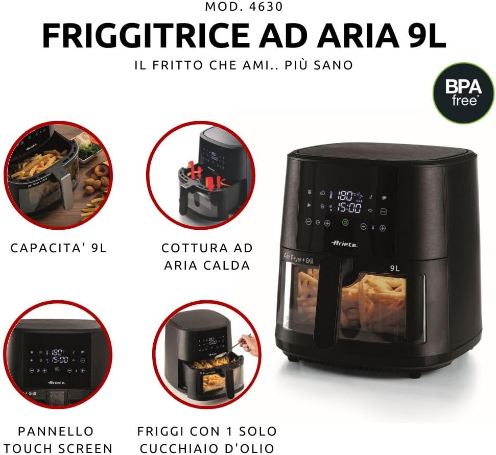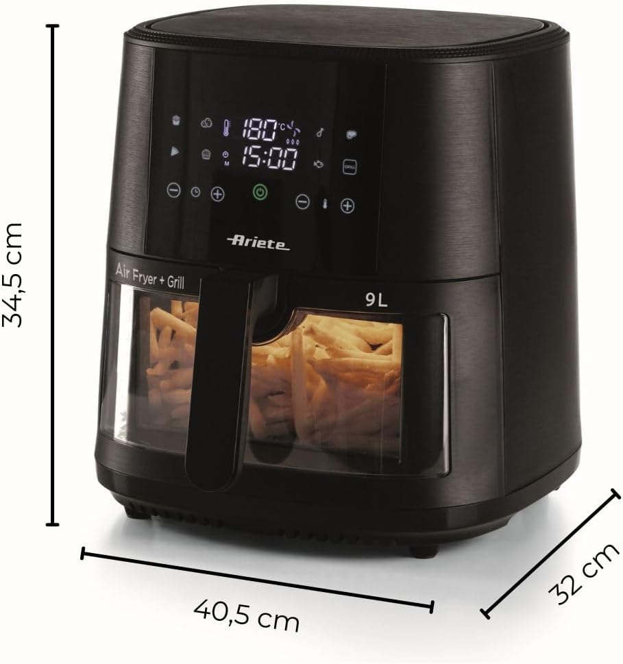 Ariete 4630 Air Fryer 9L, 1500 W, 9L Capacity, 2.5 kg Cooking Capacity, 8 Preset Programmes, Temperature up to 200°, Transparent Basket for Cooking Control, Black