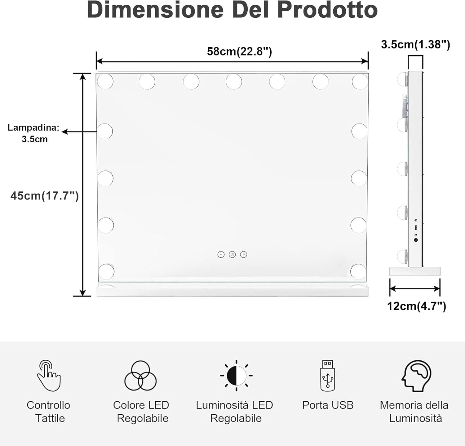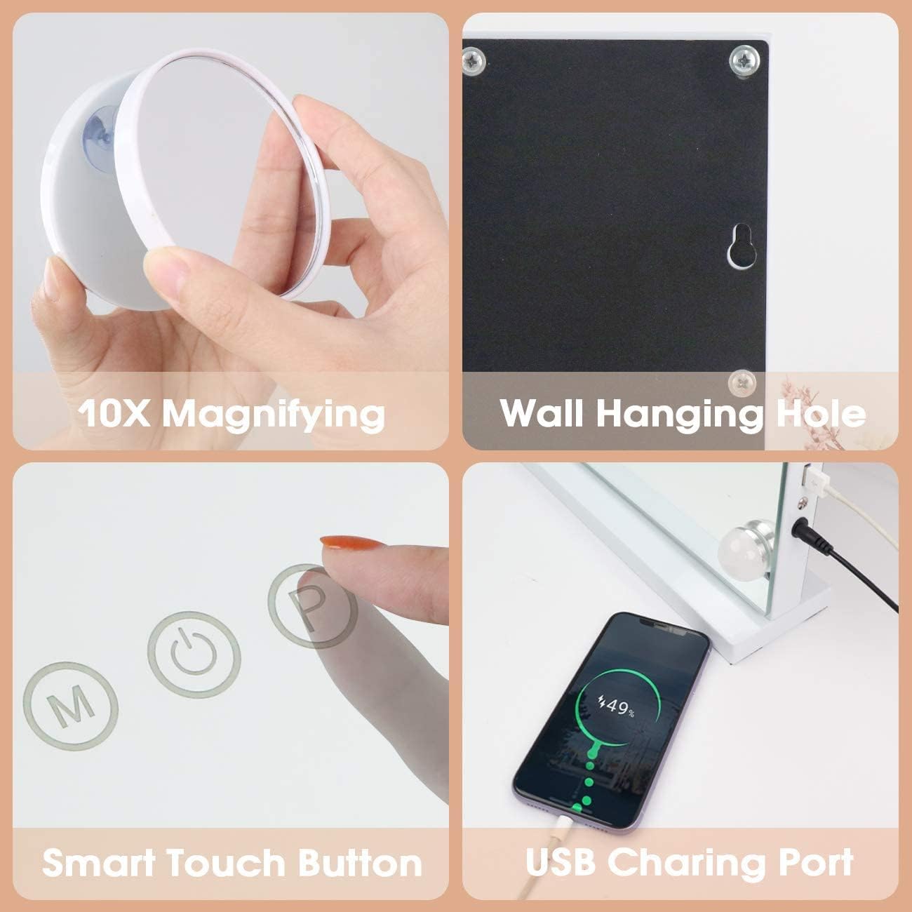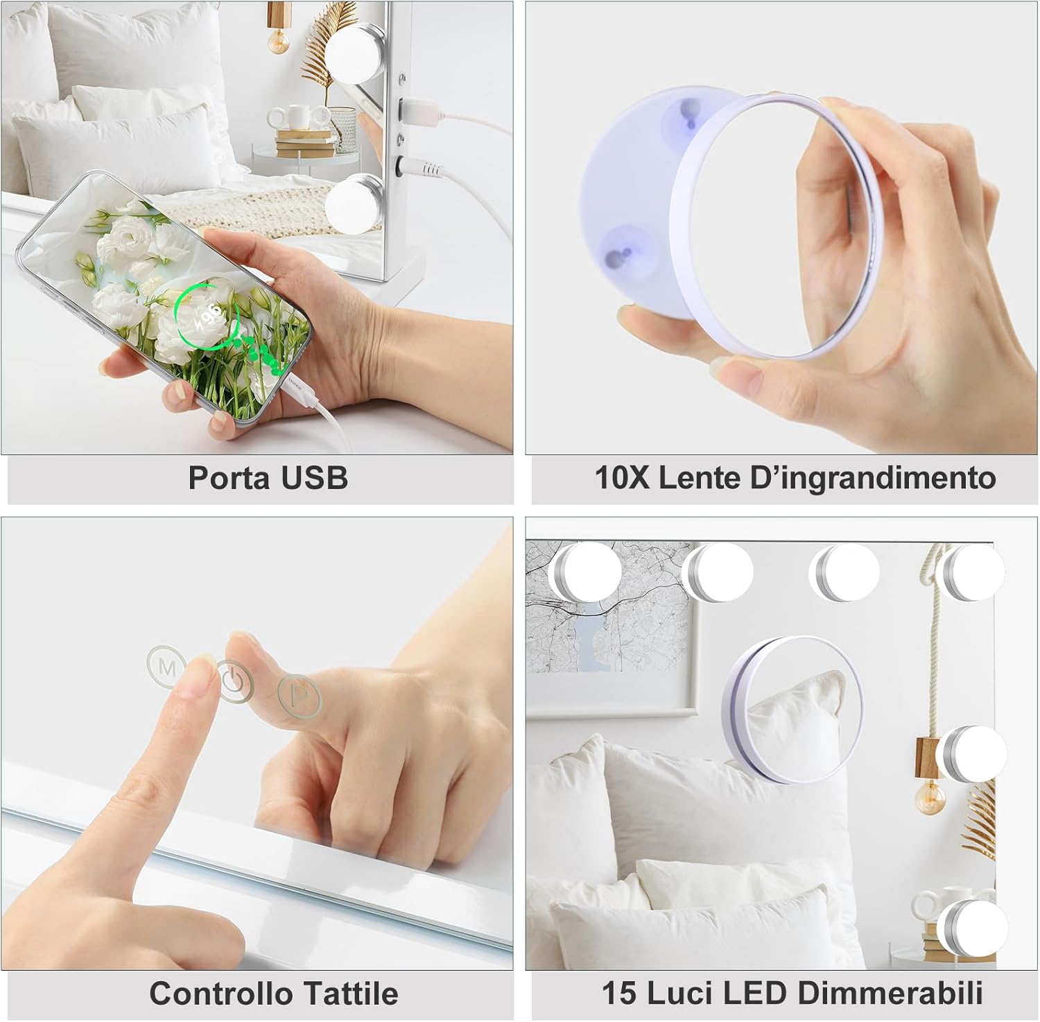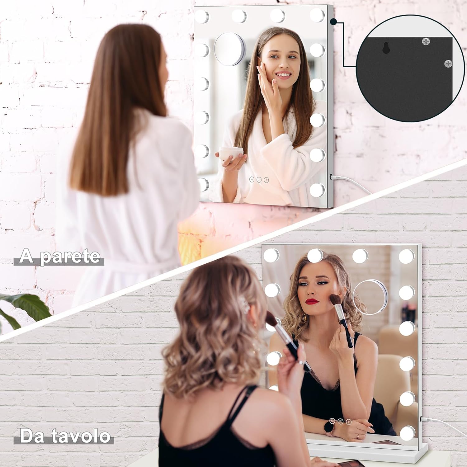 YU YUSING Specchio Trucco con Luci Hollywood, 58X45cm Specchio 15 Lampadine Led Trucco USB, 3 Temperature di Colore, Specchio da Tavolo 10X, Specchio Cosmetico da Parete, Controllo Tattile, Bianco