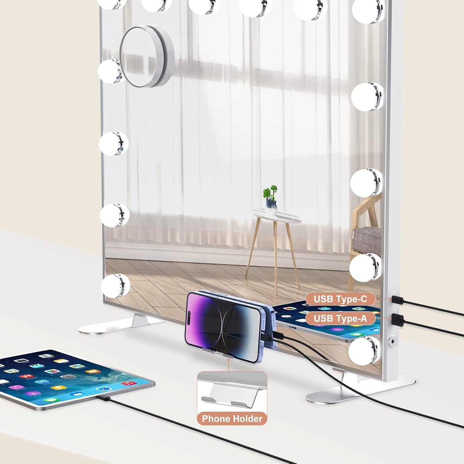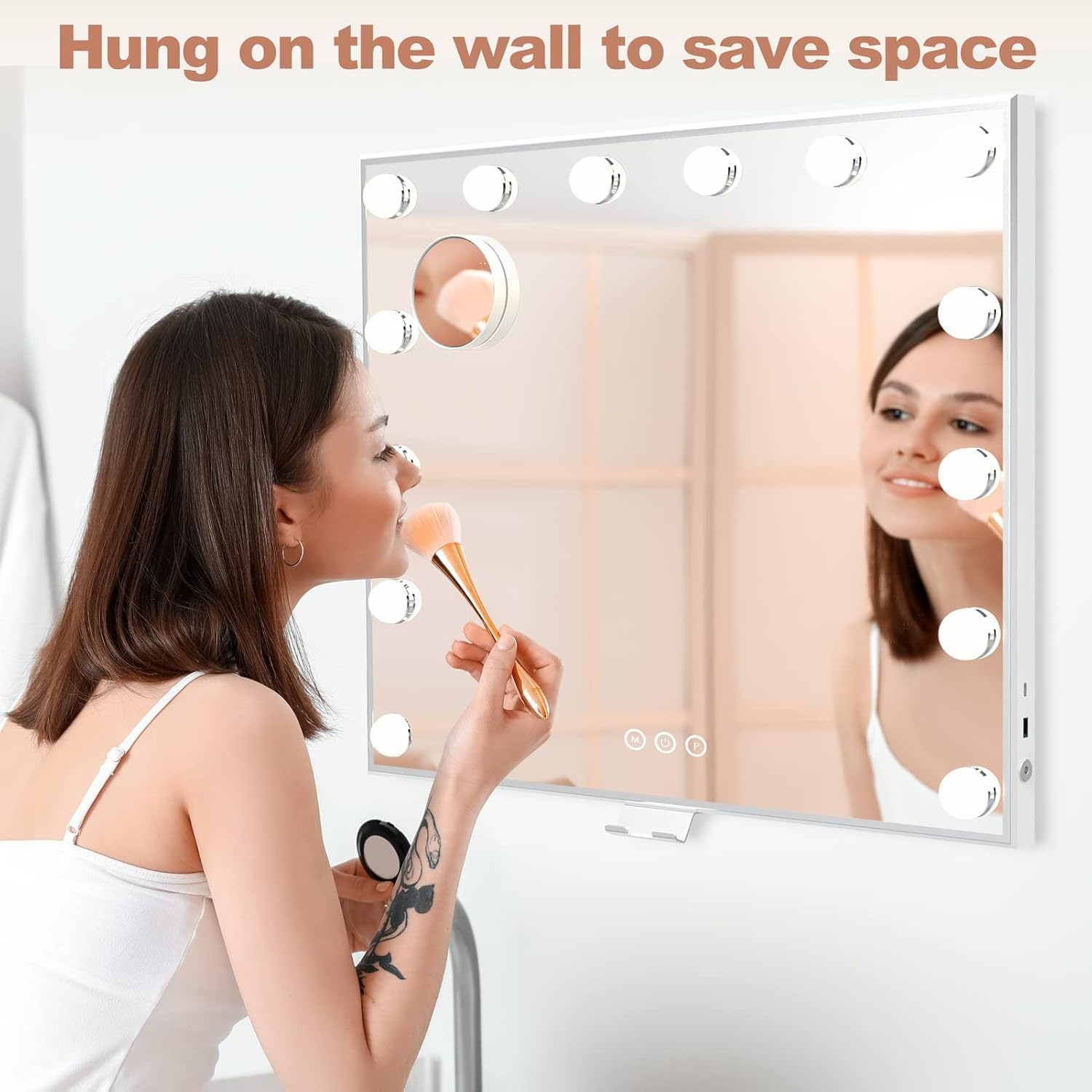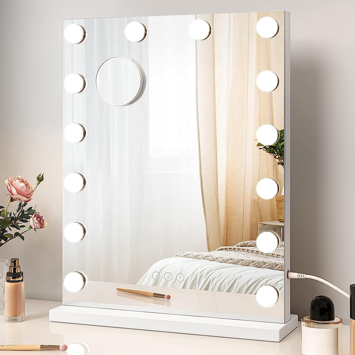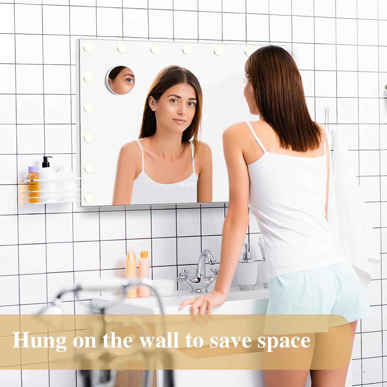 YU YUSING Specchio Trucco con Luci Hollywood, 58X45cm Specchio 15 Lampadine Led Trucco USB, 3 Temperature di Colore, Specchio da Tavolo 10X, Specchio Cosmetico da Parete, Controllo Tattile, Bianco