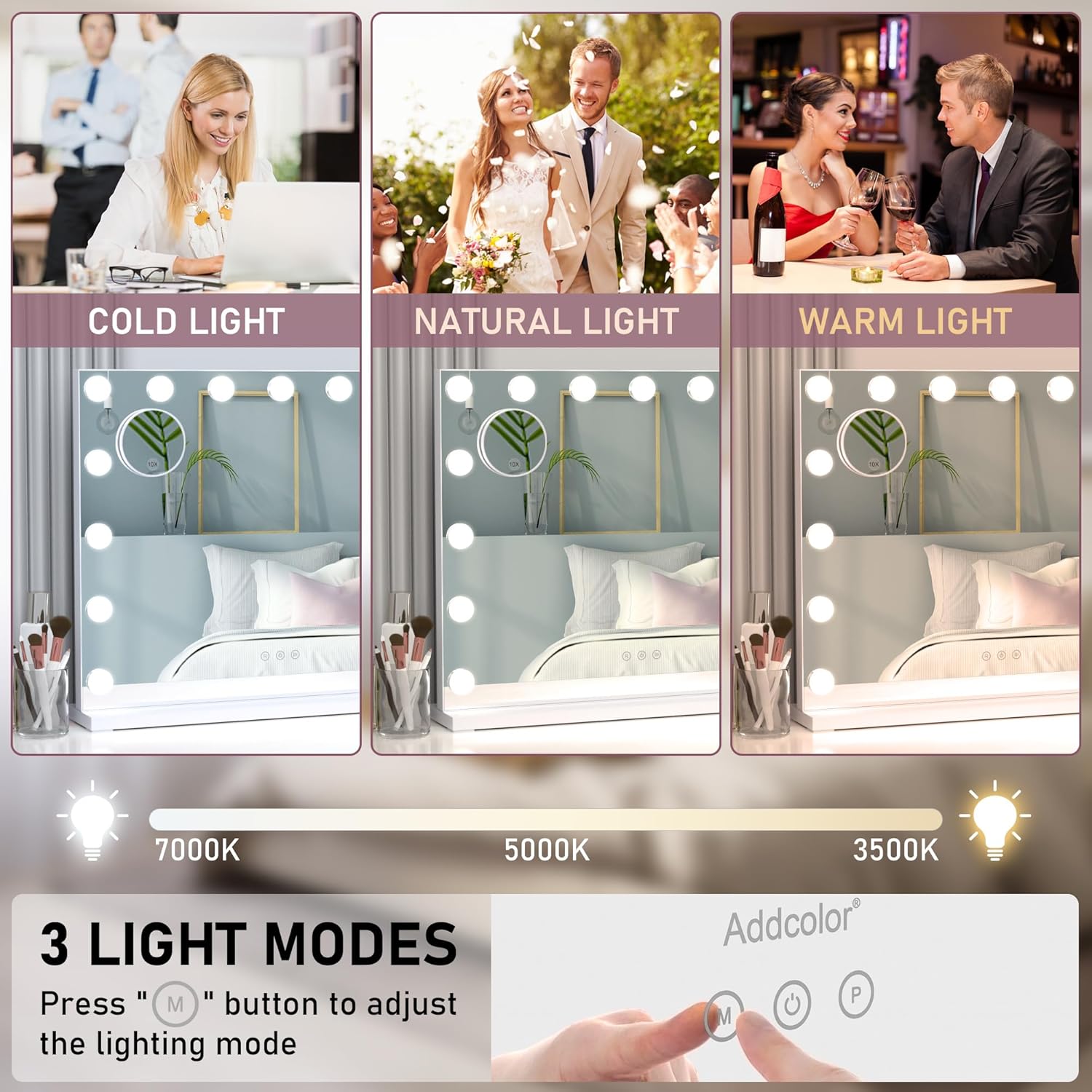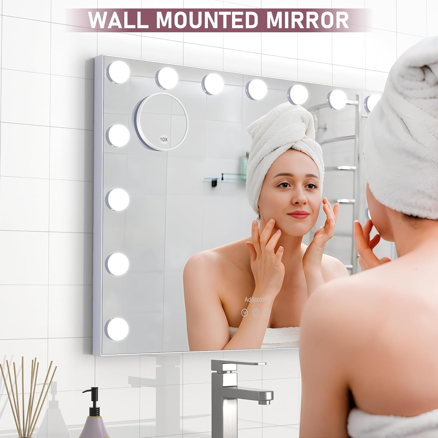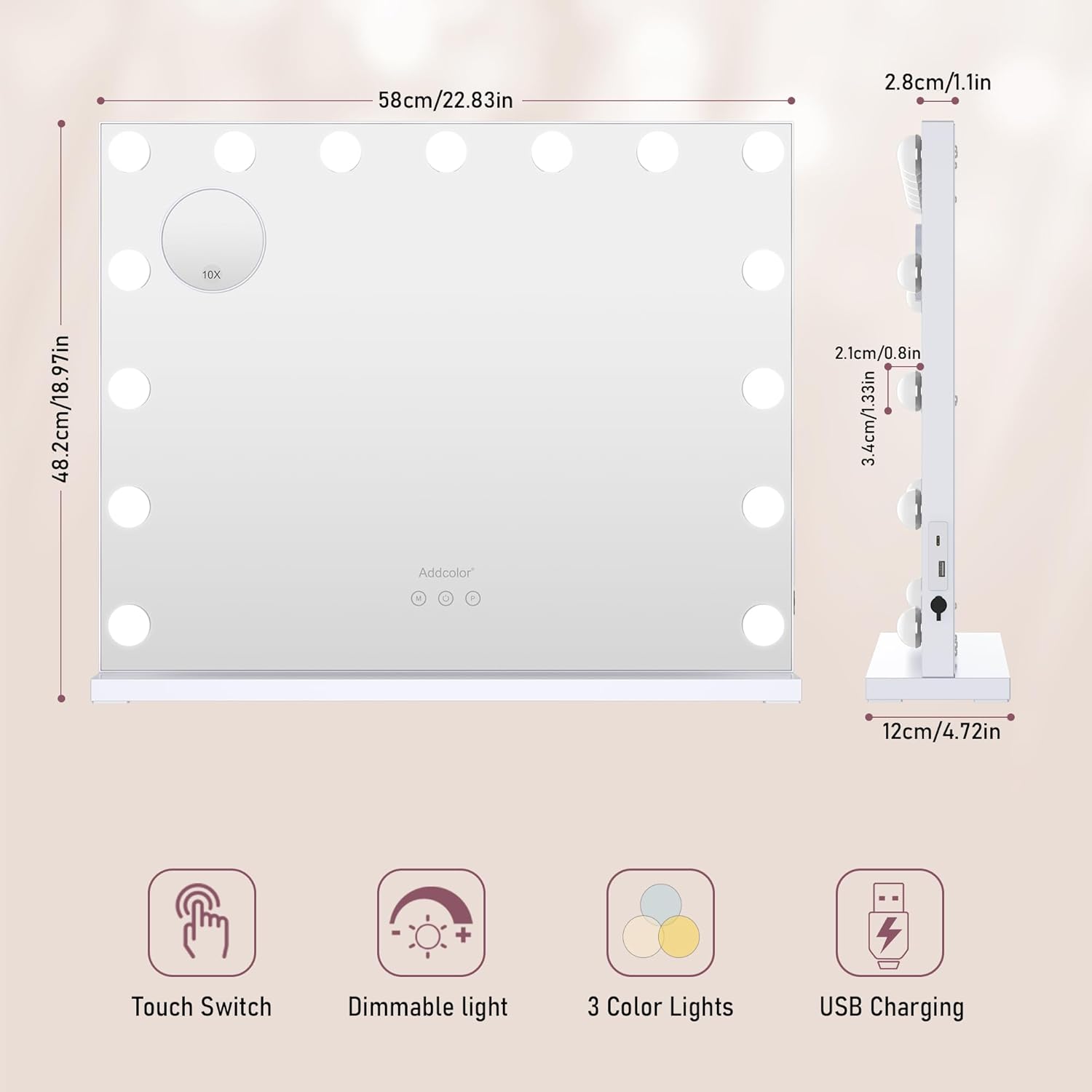 ADDCOLOR Hollywood Specchio Trucco con Luci, Specchio da Tavolo con 15 LED Lampadine e Porta di Ricarica USB, 3 Modalità di Illuminazione Regolabili Specchio da Parete con 10X Specchio (58*2,8*46CM)