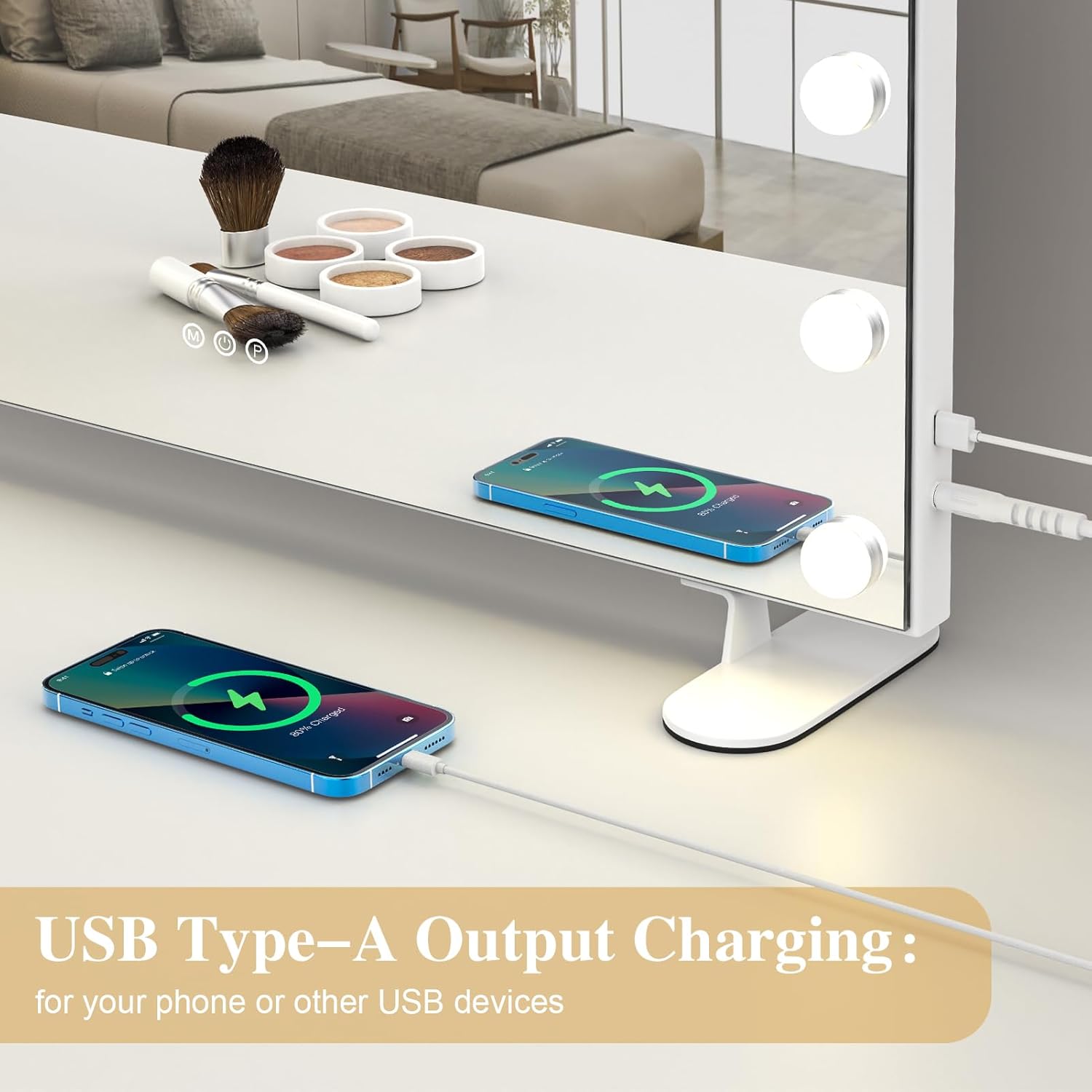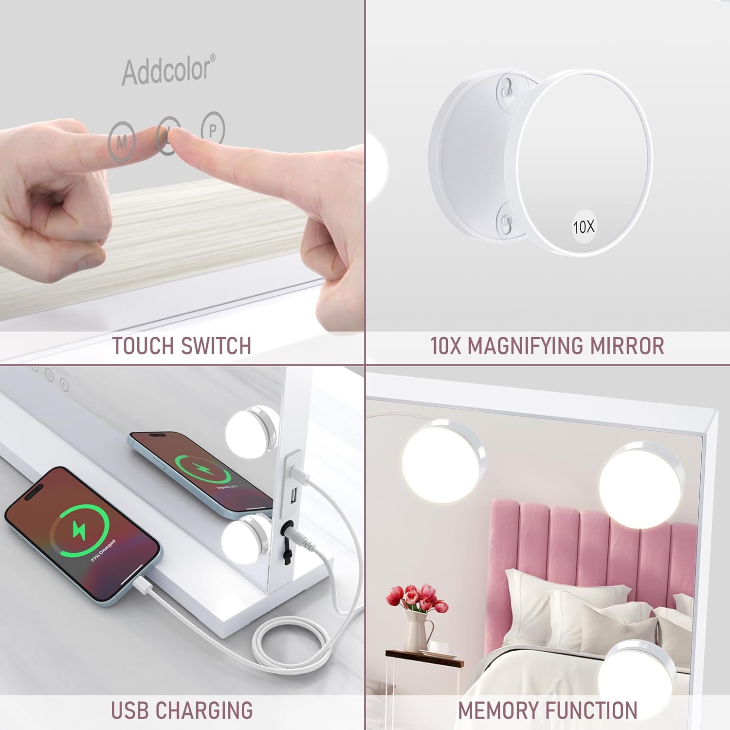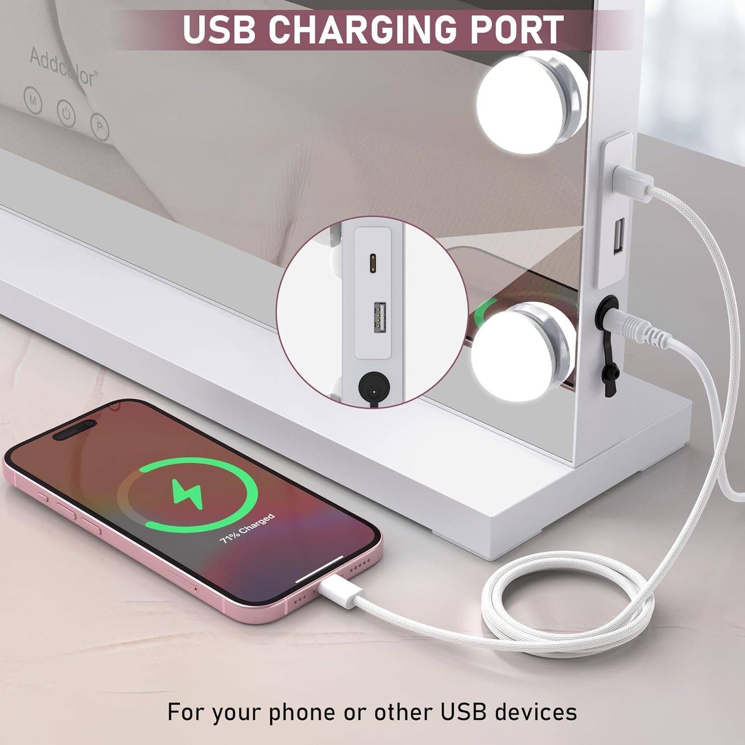 ADDCOLOR Hollywood Specchio Trucco con Luci, Specchio da Tavolo con 15 LED Lampadine e Porta di Ricarica USB, 3 Modalità di Illuminazione Regolabili Specchio da Parete con 10X Specchio (58*2,8*46CM)
