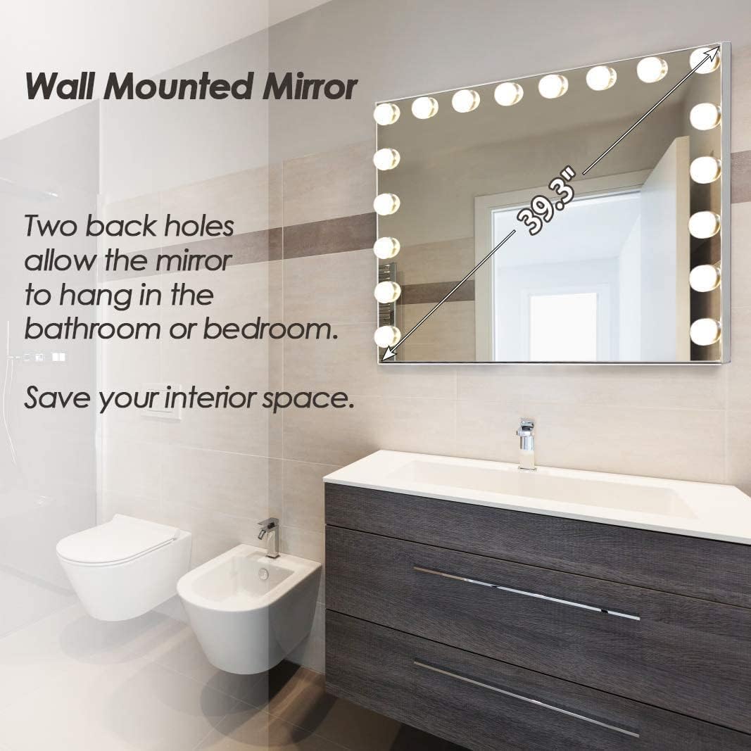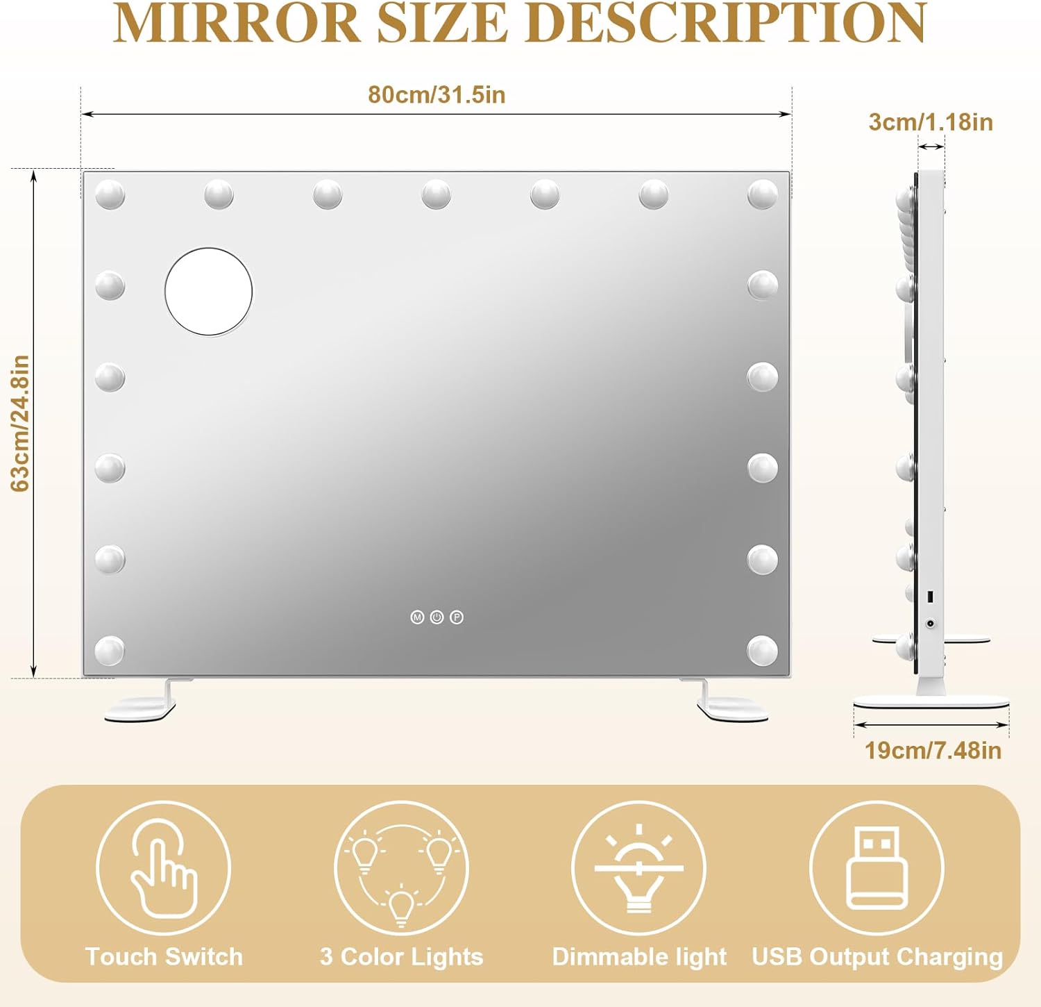 Moziel 90x60cm Specchio da Trucco Hollywood, Specchio Trucco con Luci a 20 Led Montato a Parete o sul Tavolo, 3 Colori di Luce e Funzione di Luminosità Regolabile