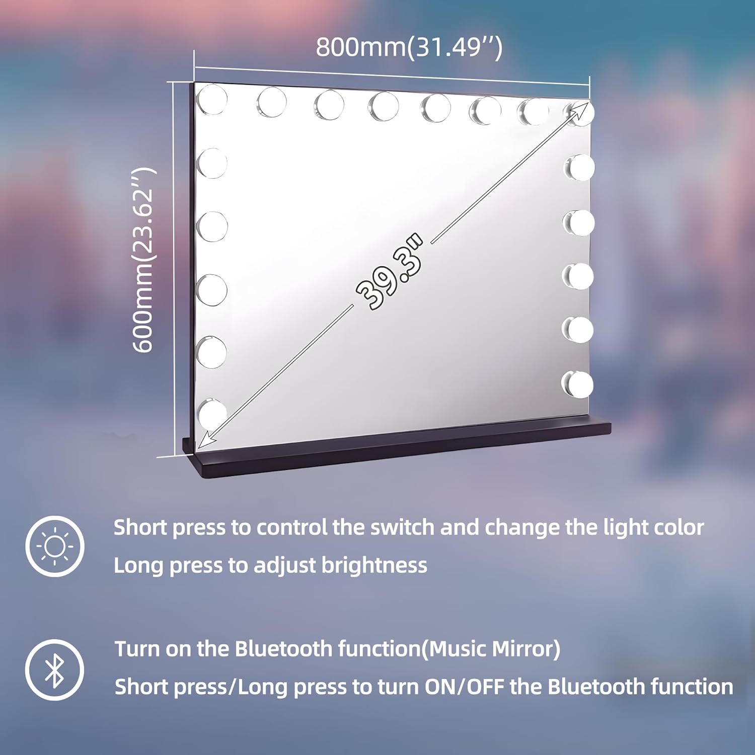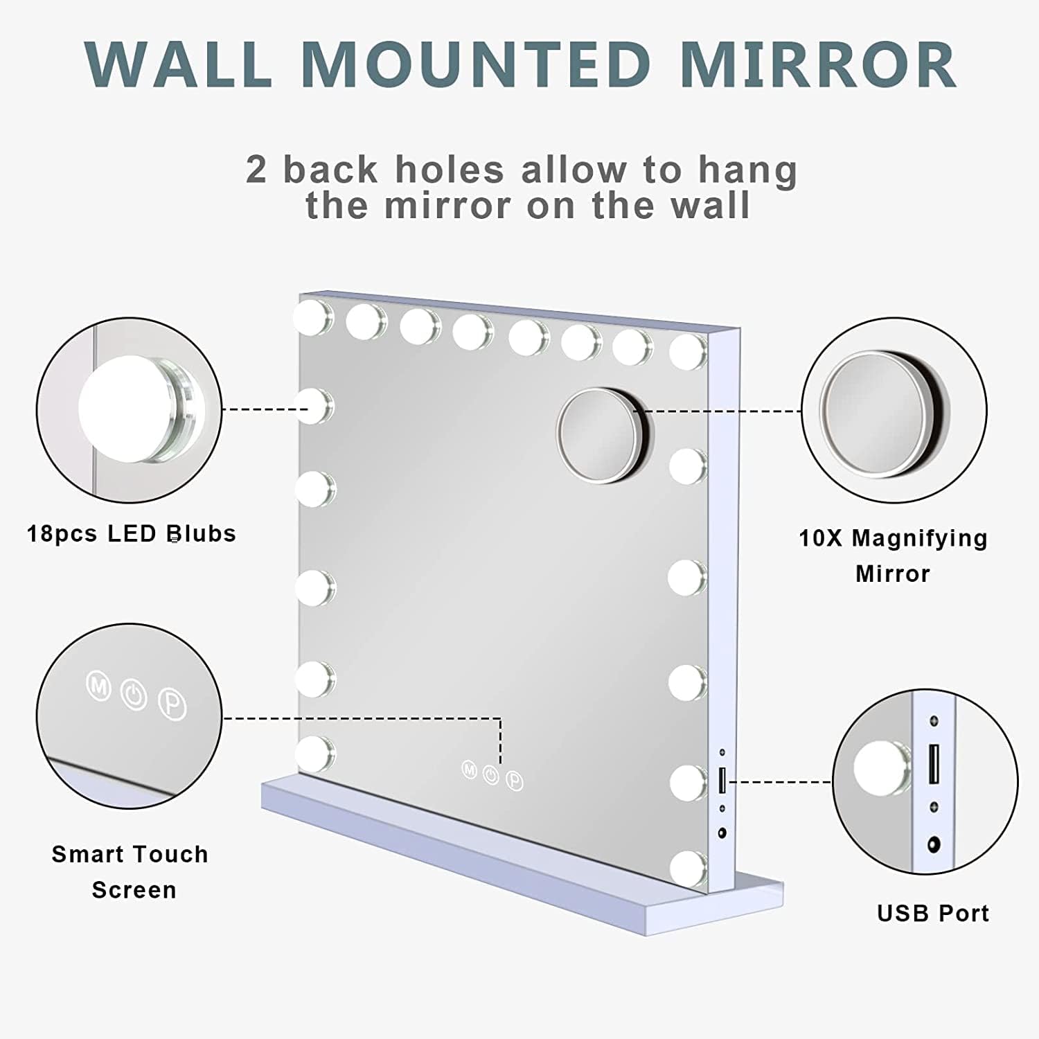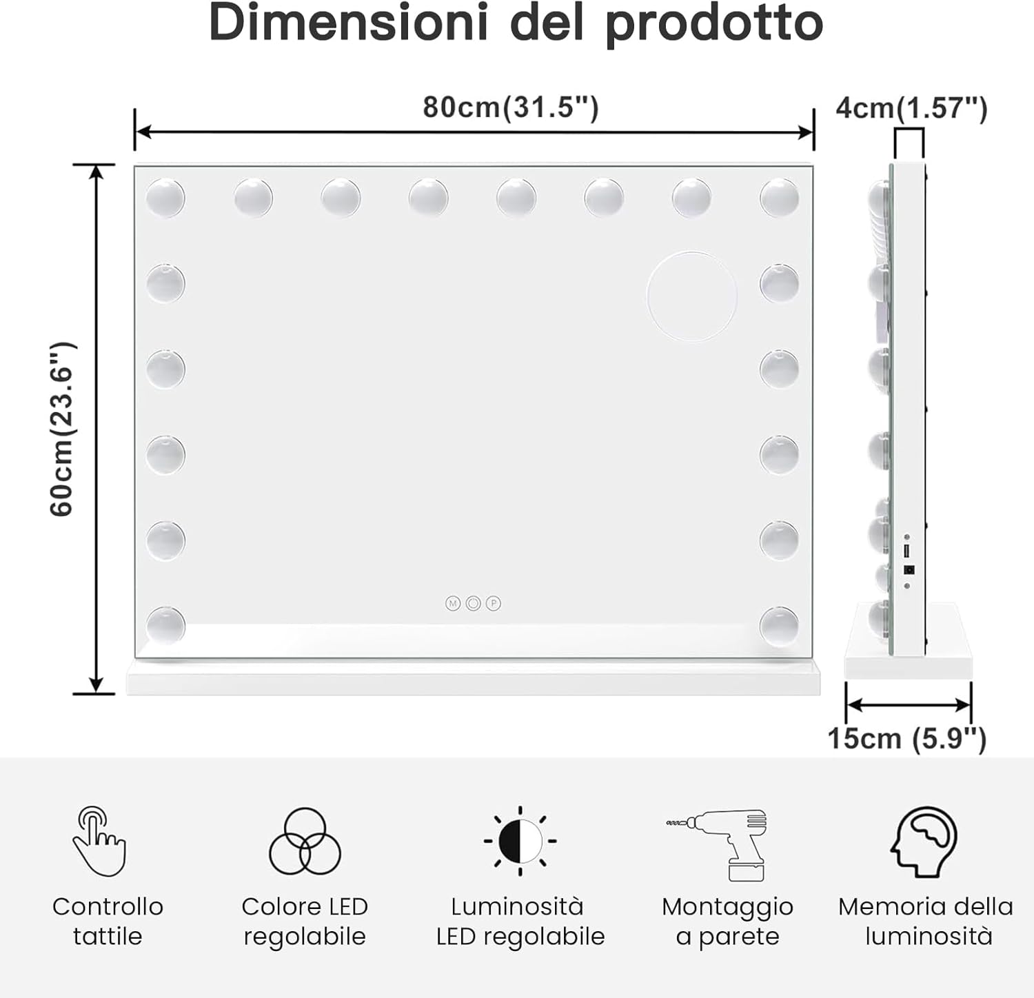 FENCHILIN Specchio trucco con Luci e altoparlante, Hollywood con 18 lampade a LED dimmerabili Porta di ricarica USB Grande per makeup, ingranditore 10x 80x58cm