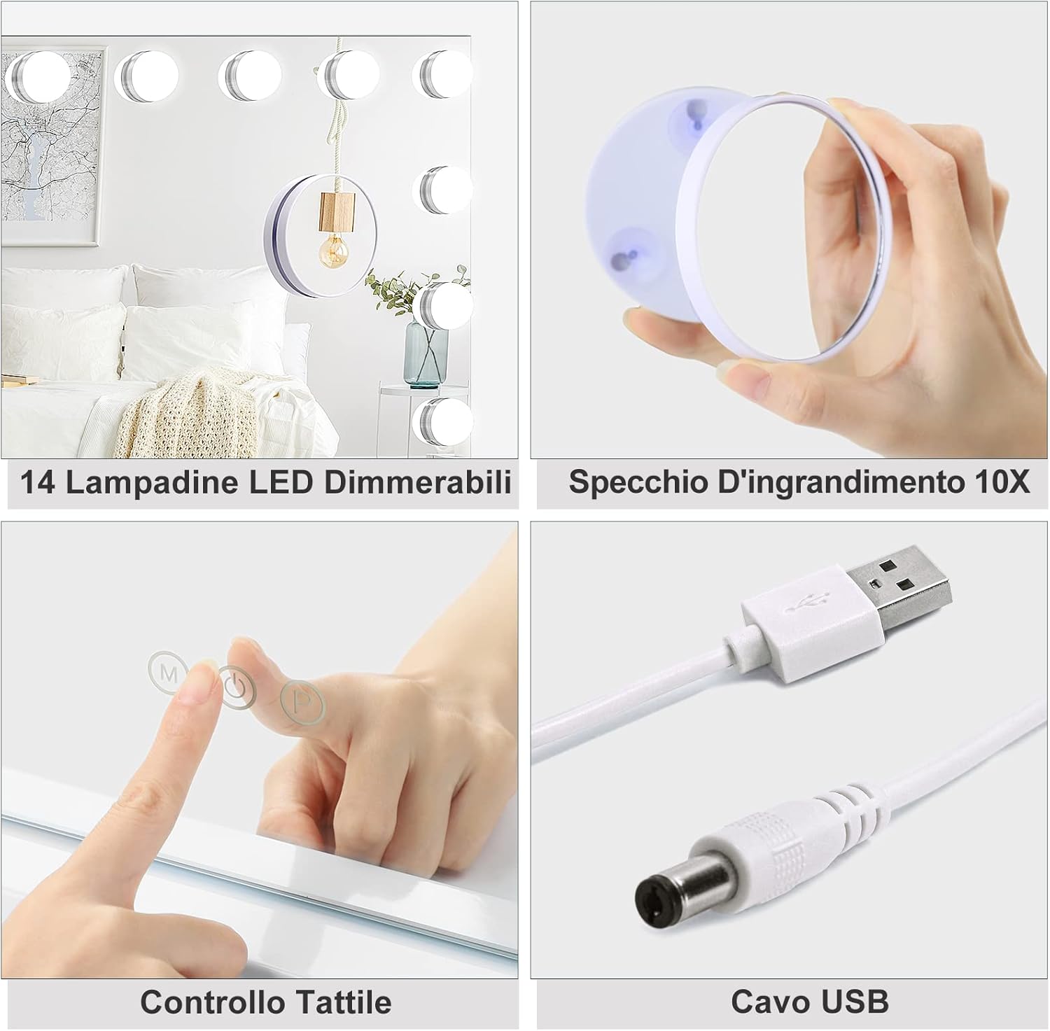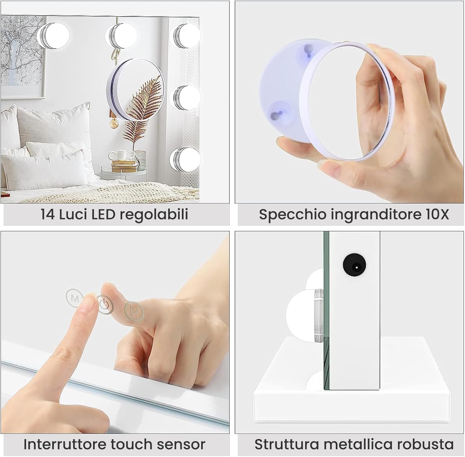 Teousev Hollywood Specchio Trucco con luci, Specchio Trucco con 14 lampade LED, Illuminato Specchio da Tavolo con 10x ingrandente, 50x40cm