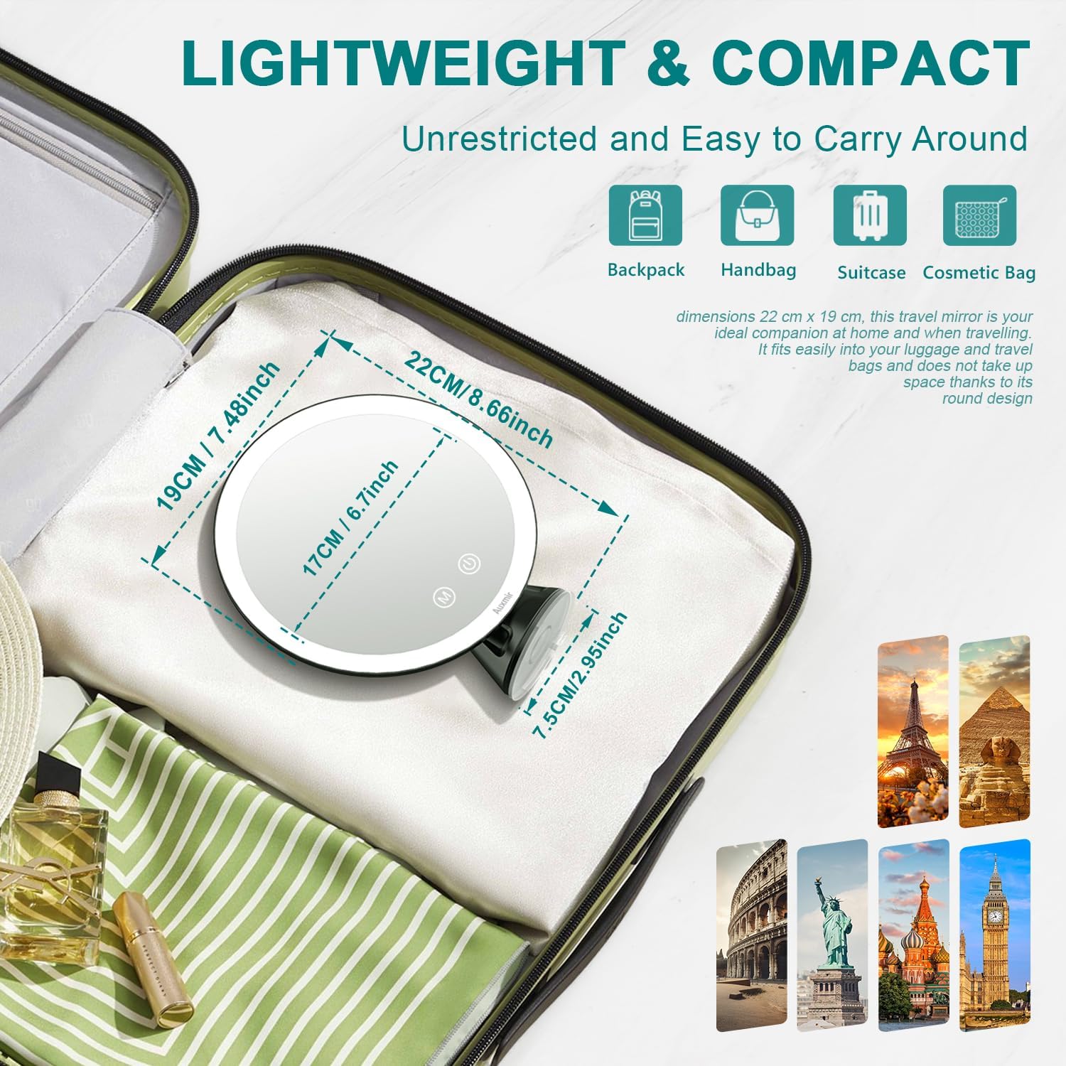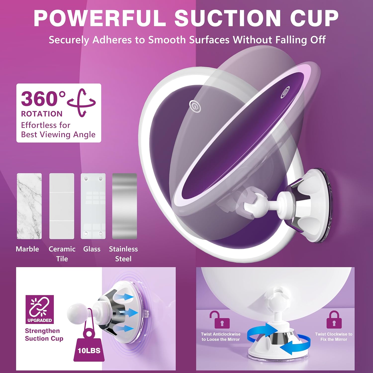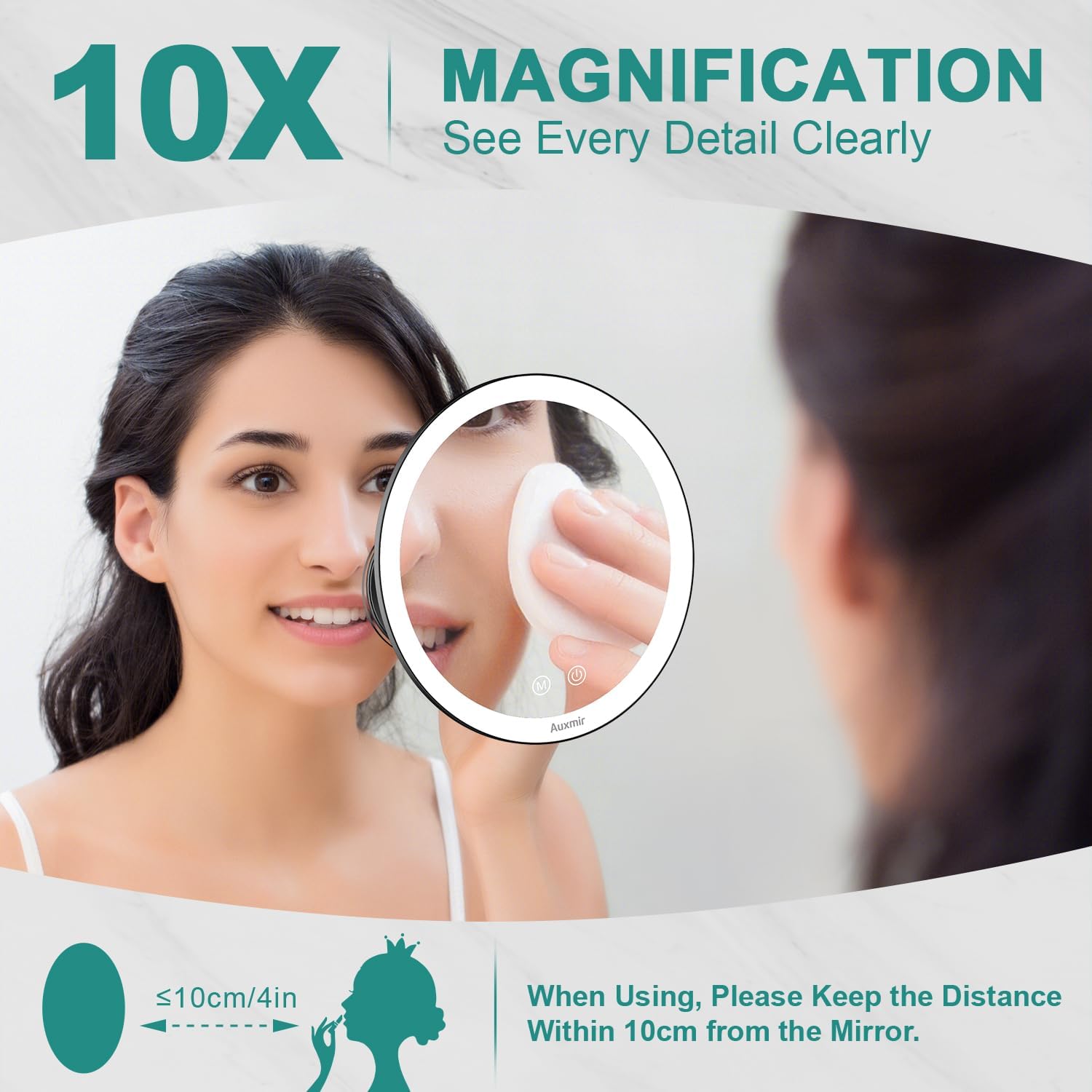 Specchio ingranditore 10X con luce LED e 3 forti ventose, compatto e illuminato (4 batterie AAA)
