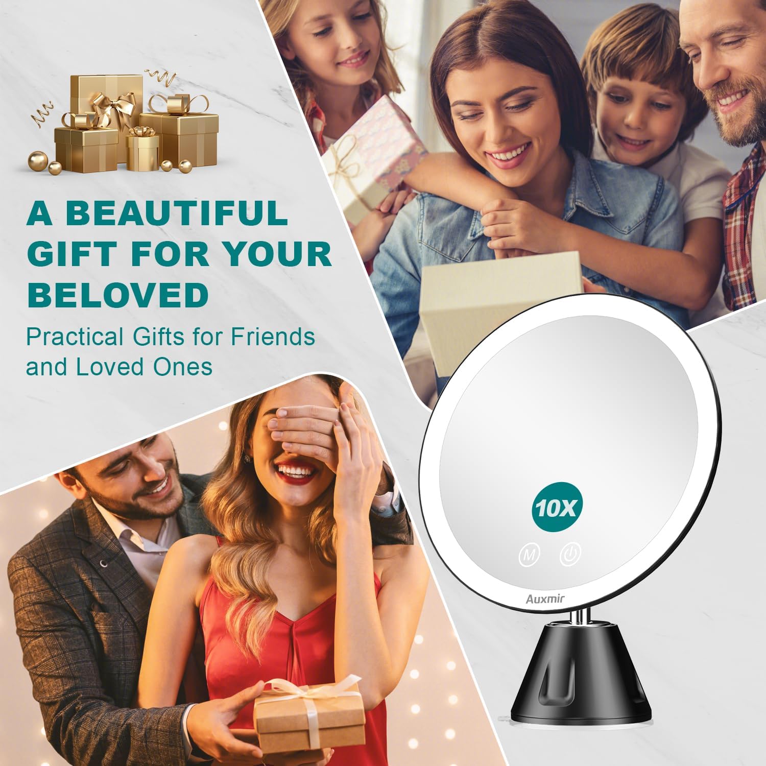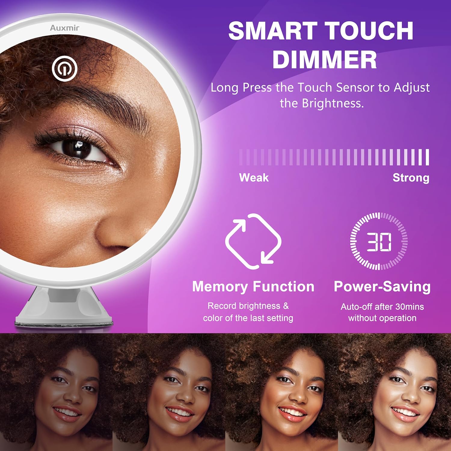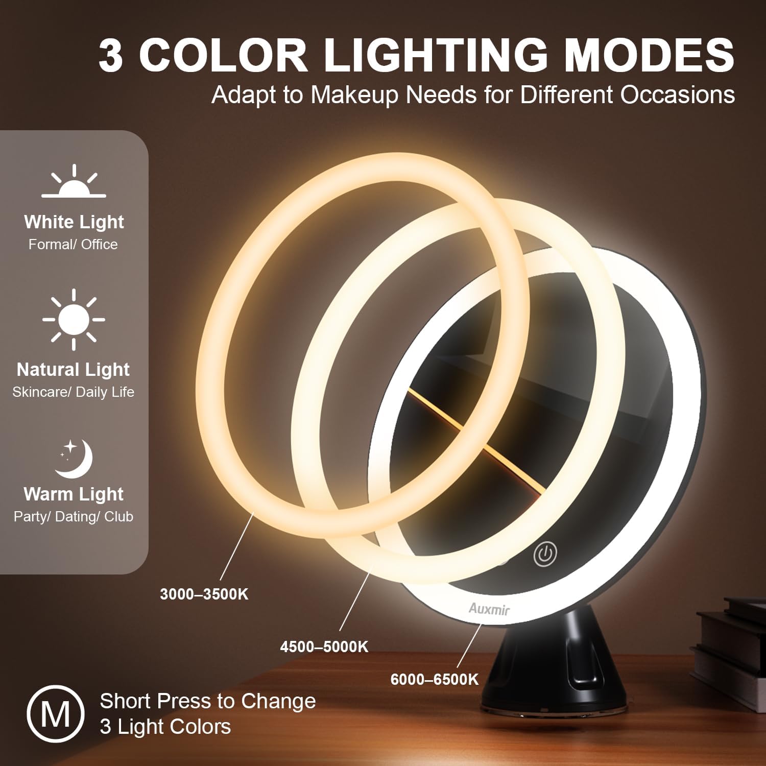 Auxmir Specchio Trucco con Luci LED, Specchio Ingranditore 30X/1X a Doppio Lato, Luminosità Regolabile a 3 Colori, Specchio da Tavolo Pieghevole con Foro per Appendere, Ricaricabile e Portatile