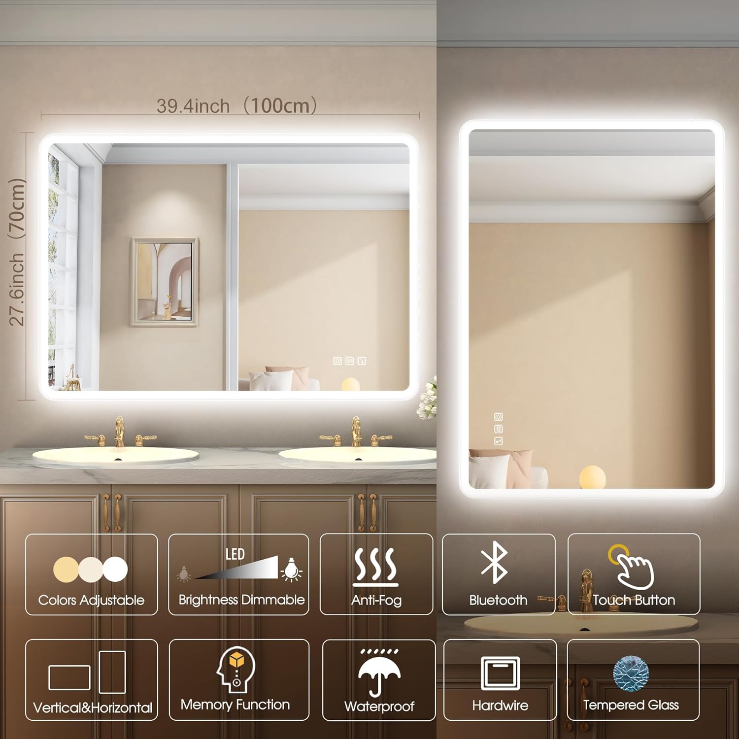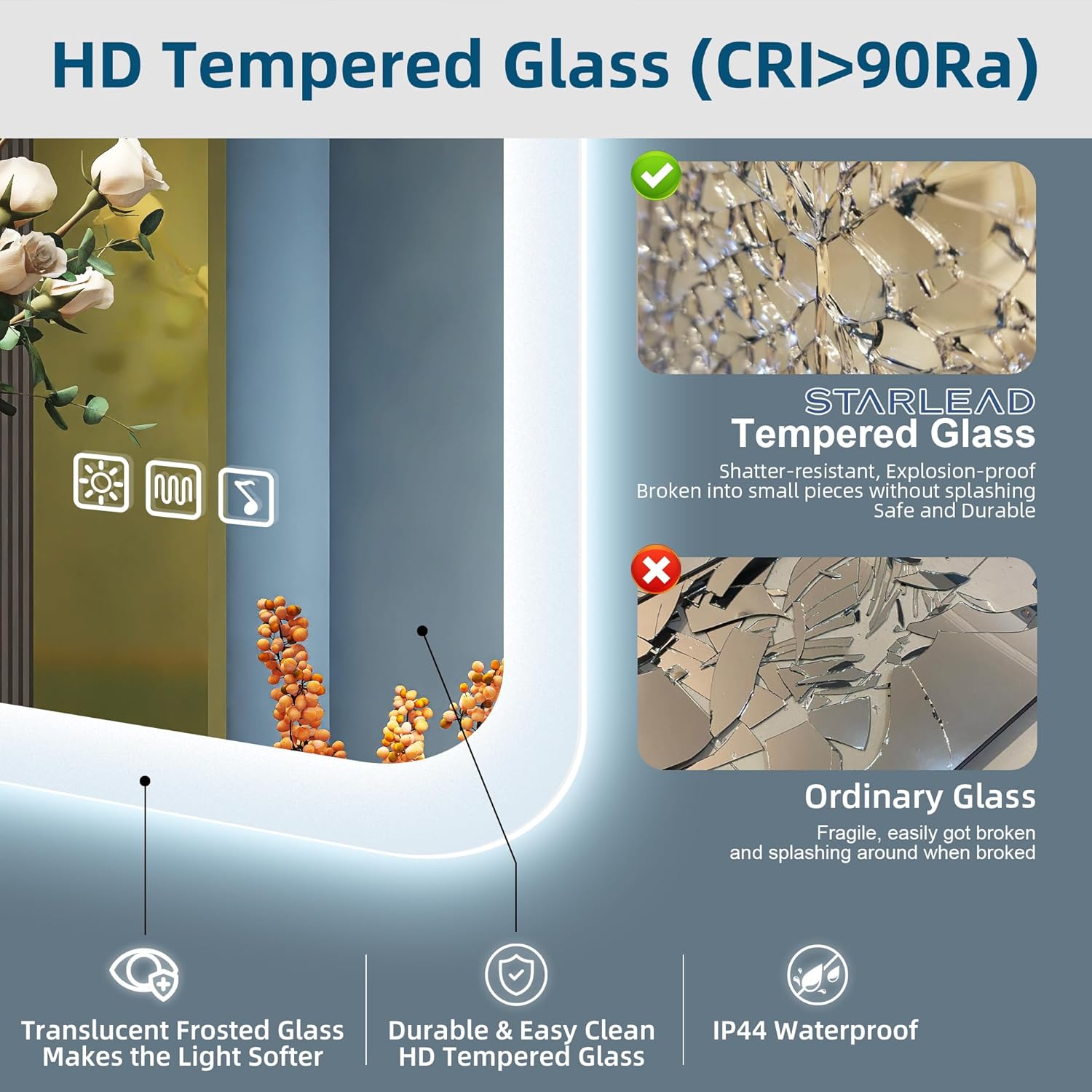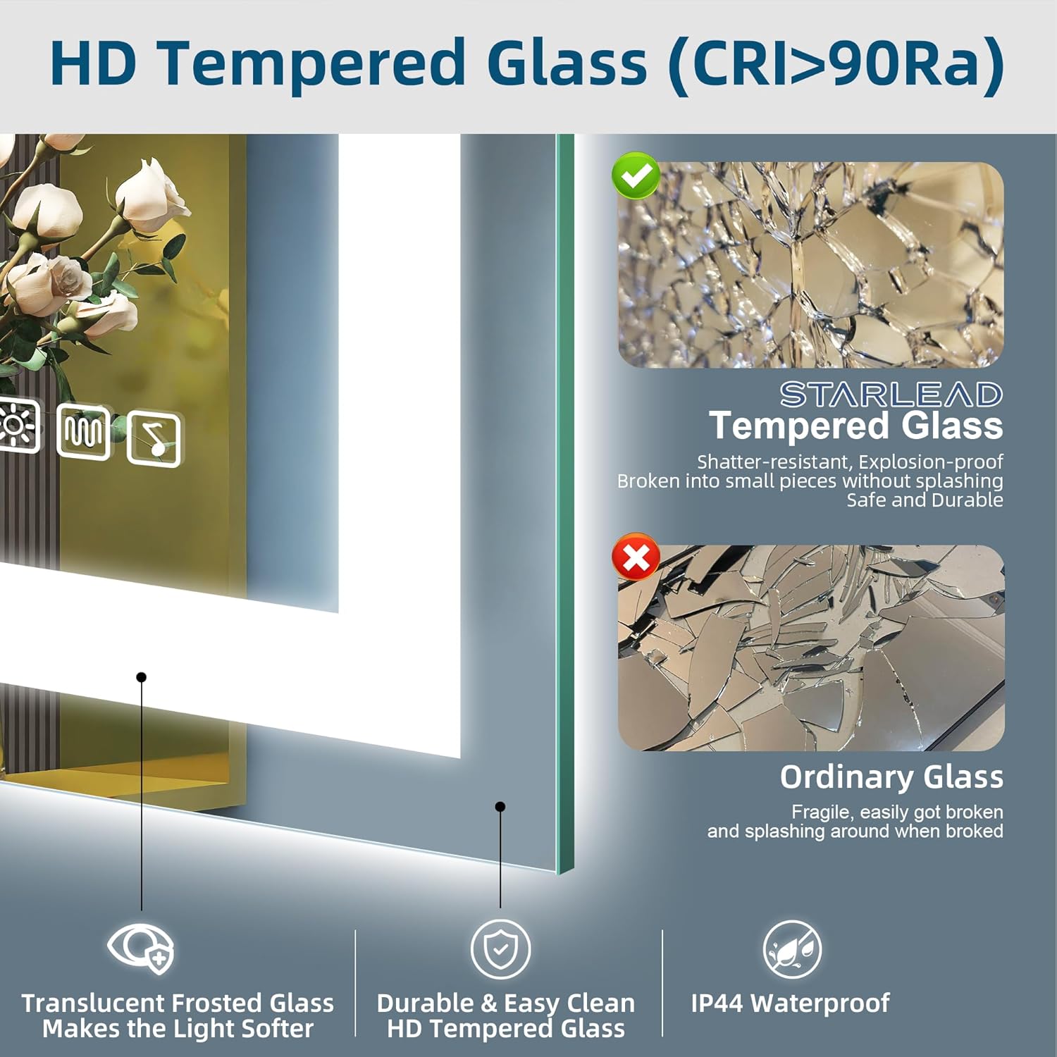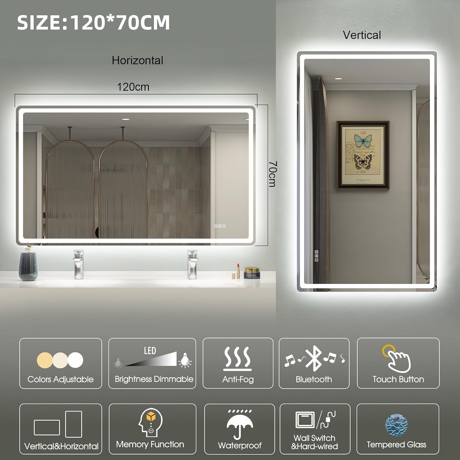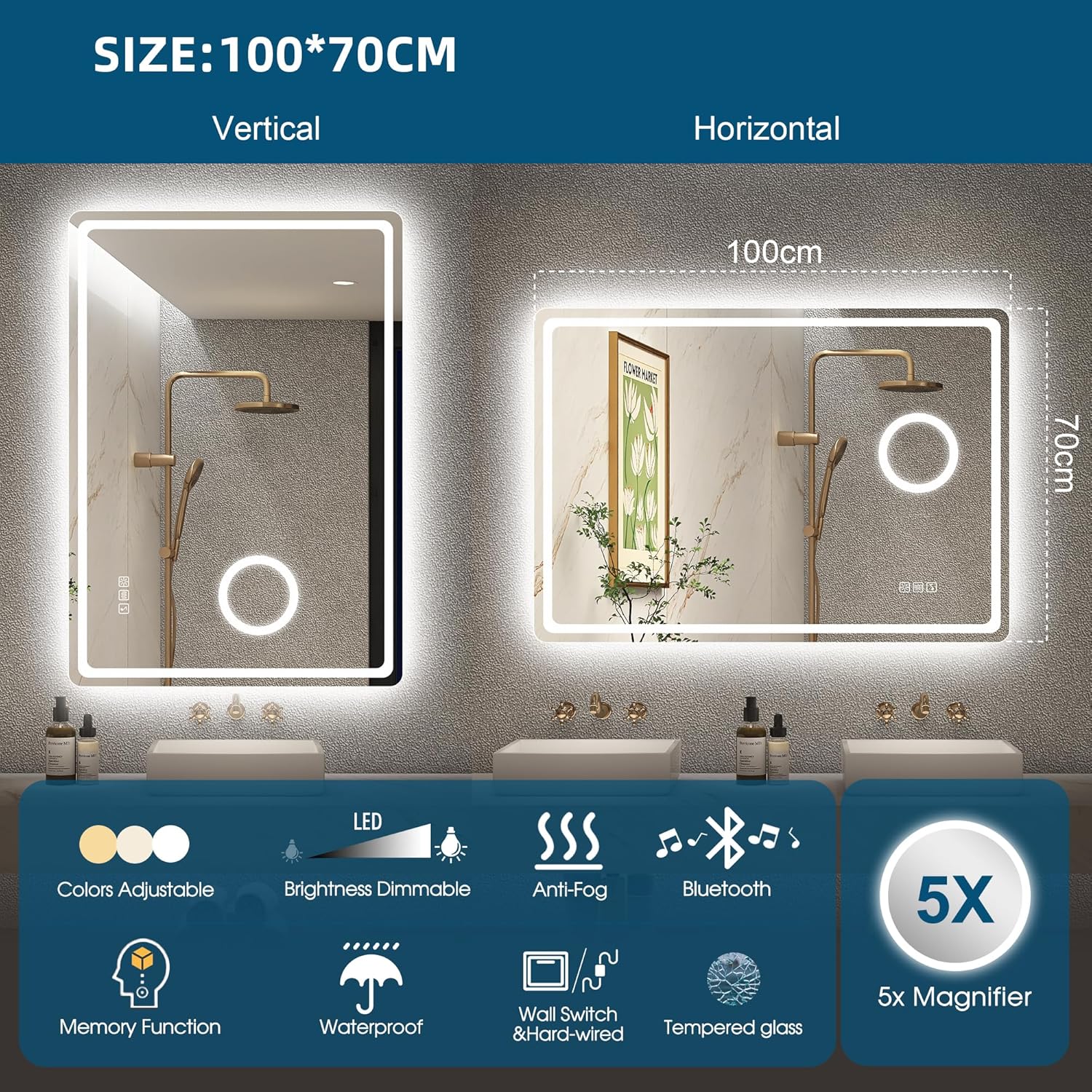 STARLEAD Specchio-Bagno-con-Luce e Bluetooth 70x100cm, Specchio-Bagno-LED con Antifog, 3 Colori Luce, Dimmerabile, IP44, Vetro Temperato HD, Memoria, Orizzontale/Verticale