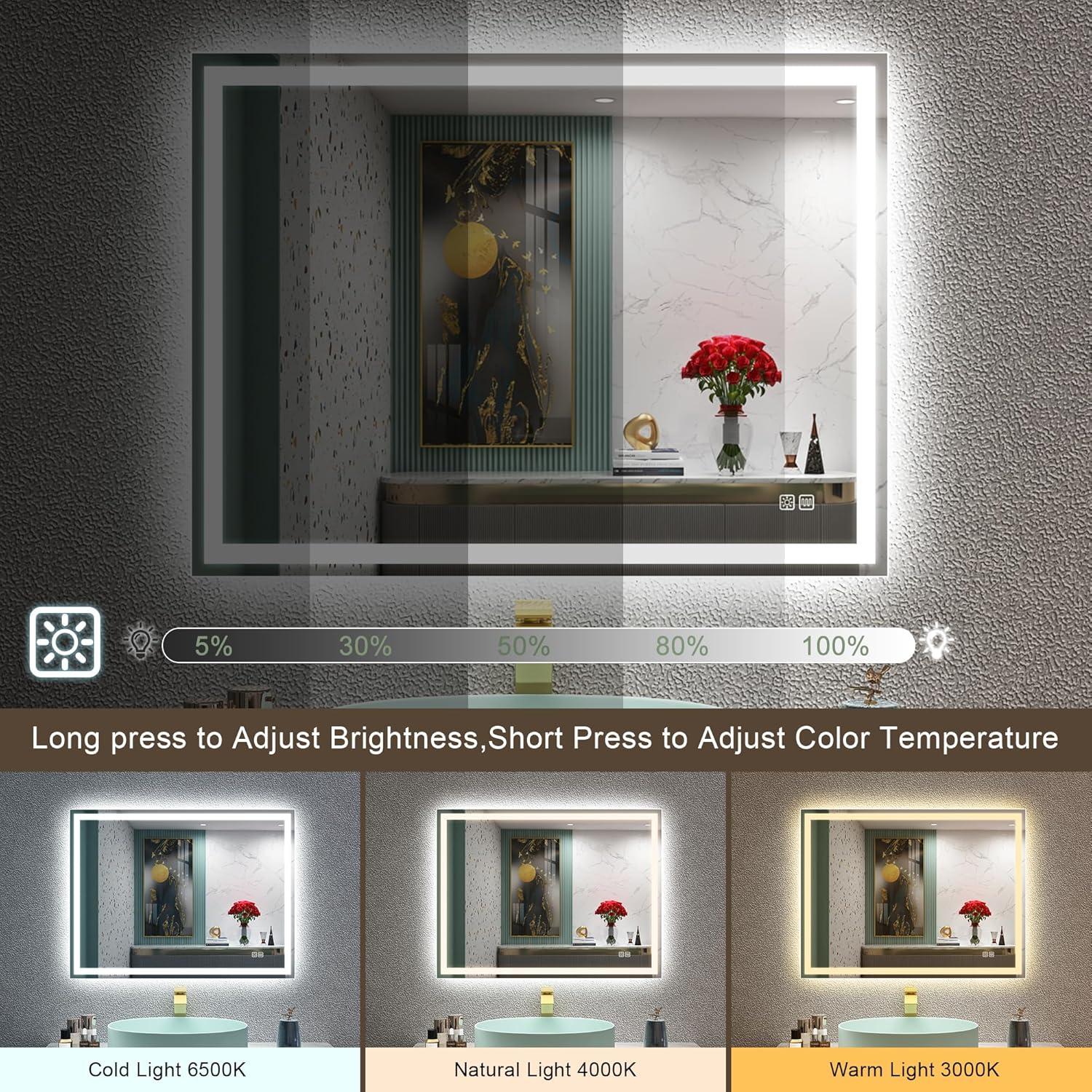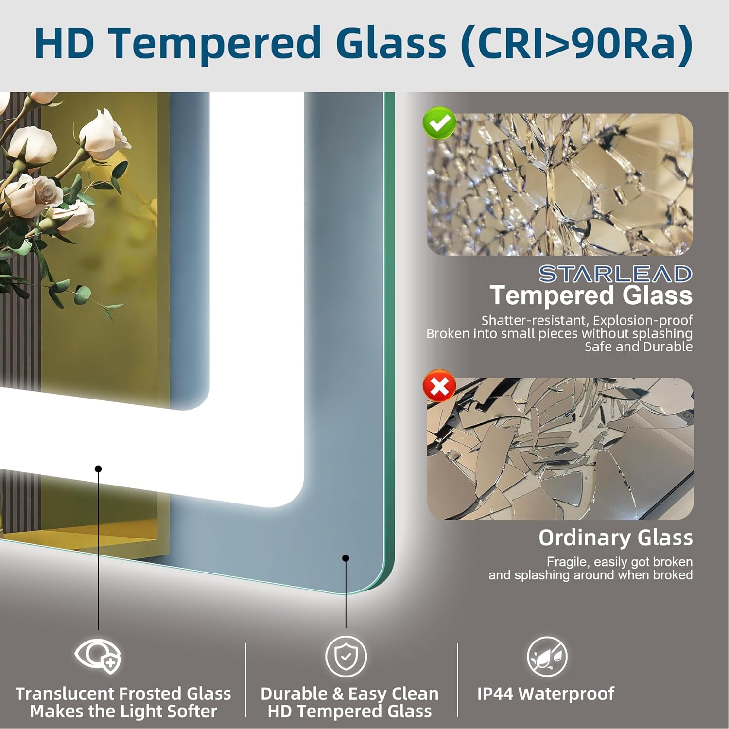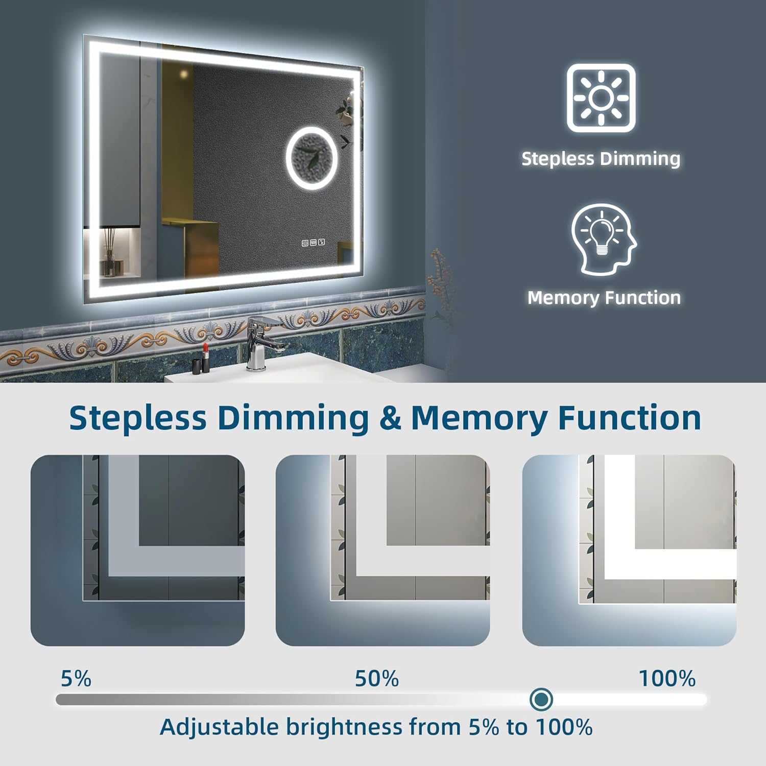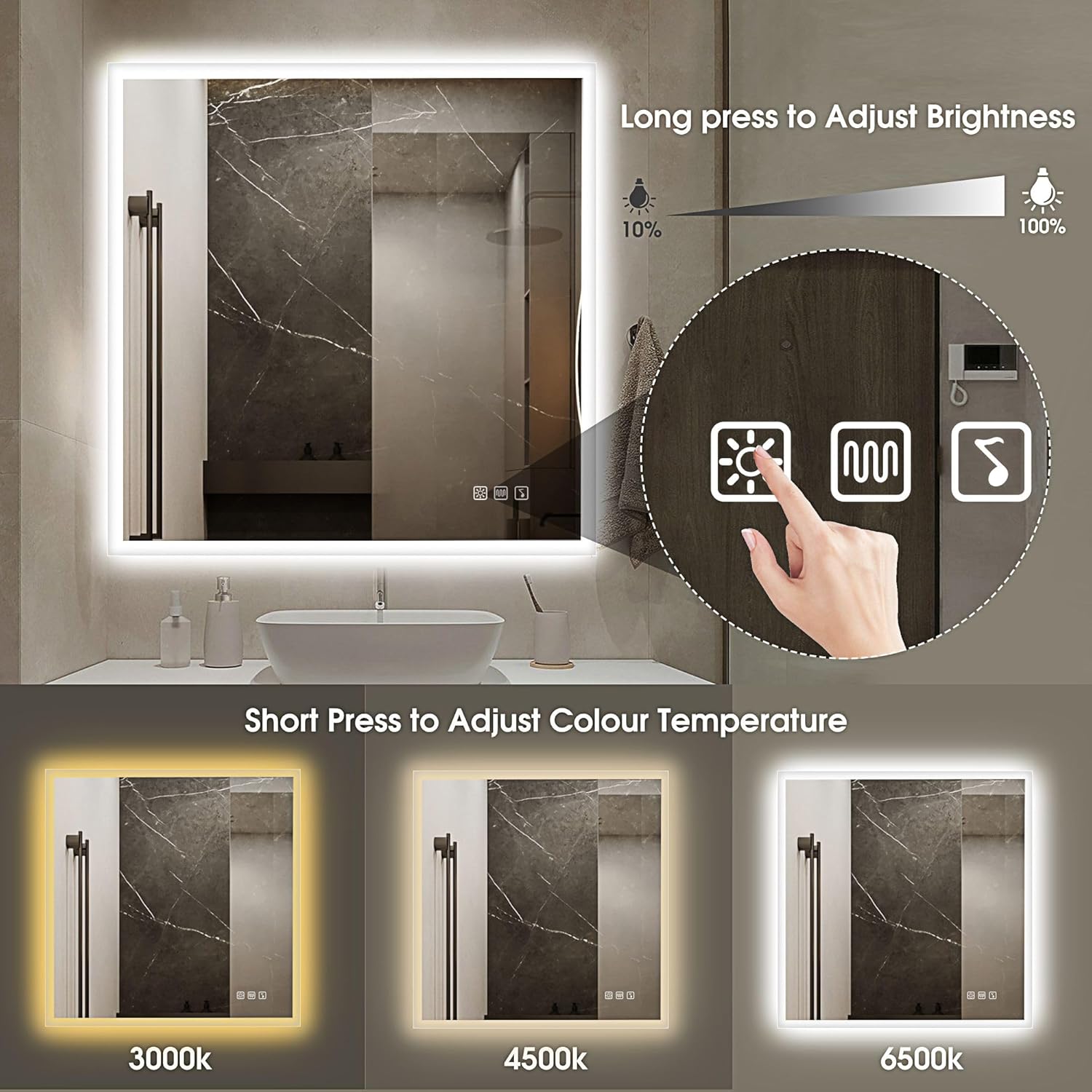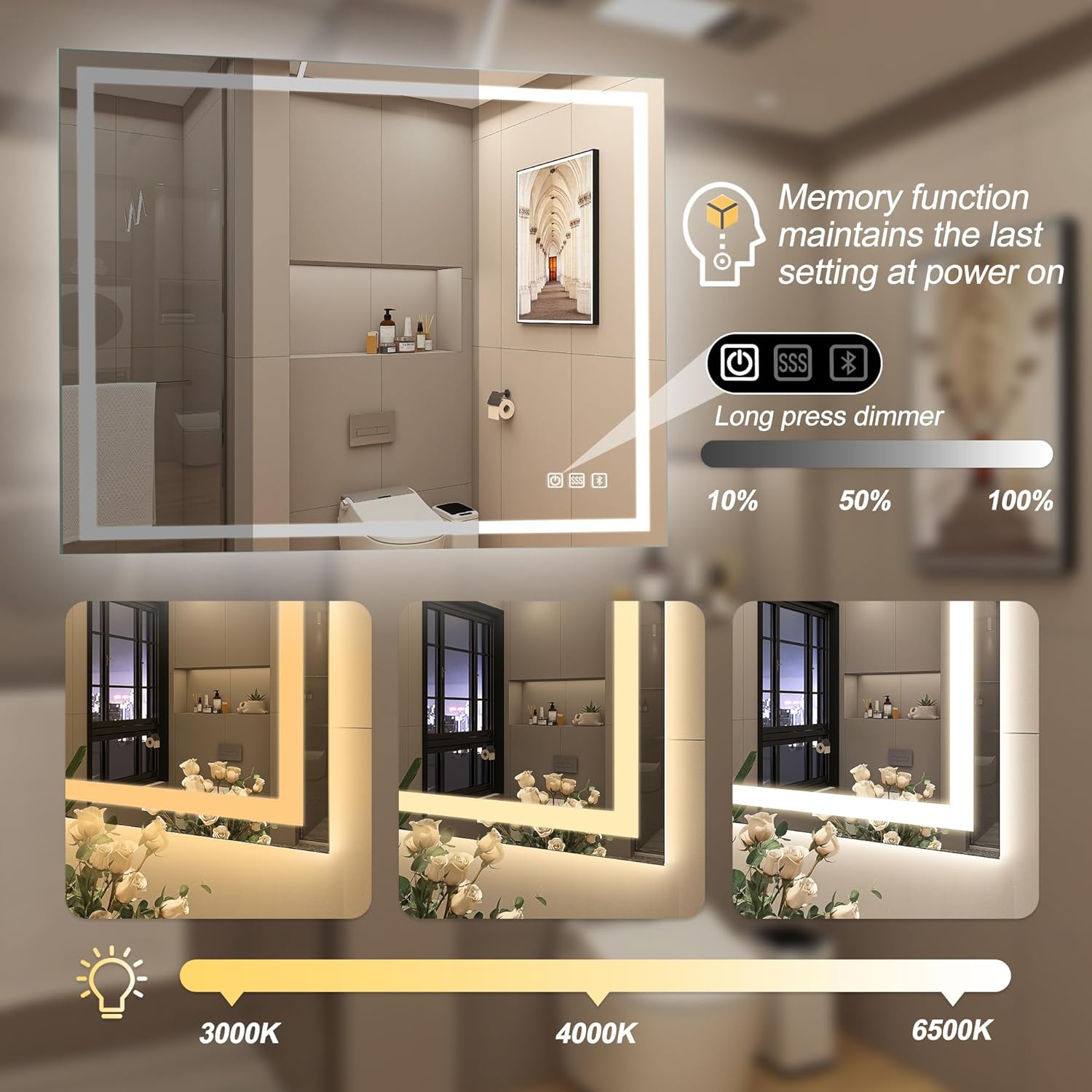 STARLEAD Specchio-Bagno-con-Luce e Bluetooth 70x100cm, Specchio-Bagno-LED con Antifog, 3 Colori Luce, Dimmerabile, IP44, Vetro Temperato HD, Memoria, Orizzontale/Verticale