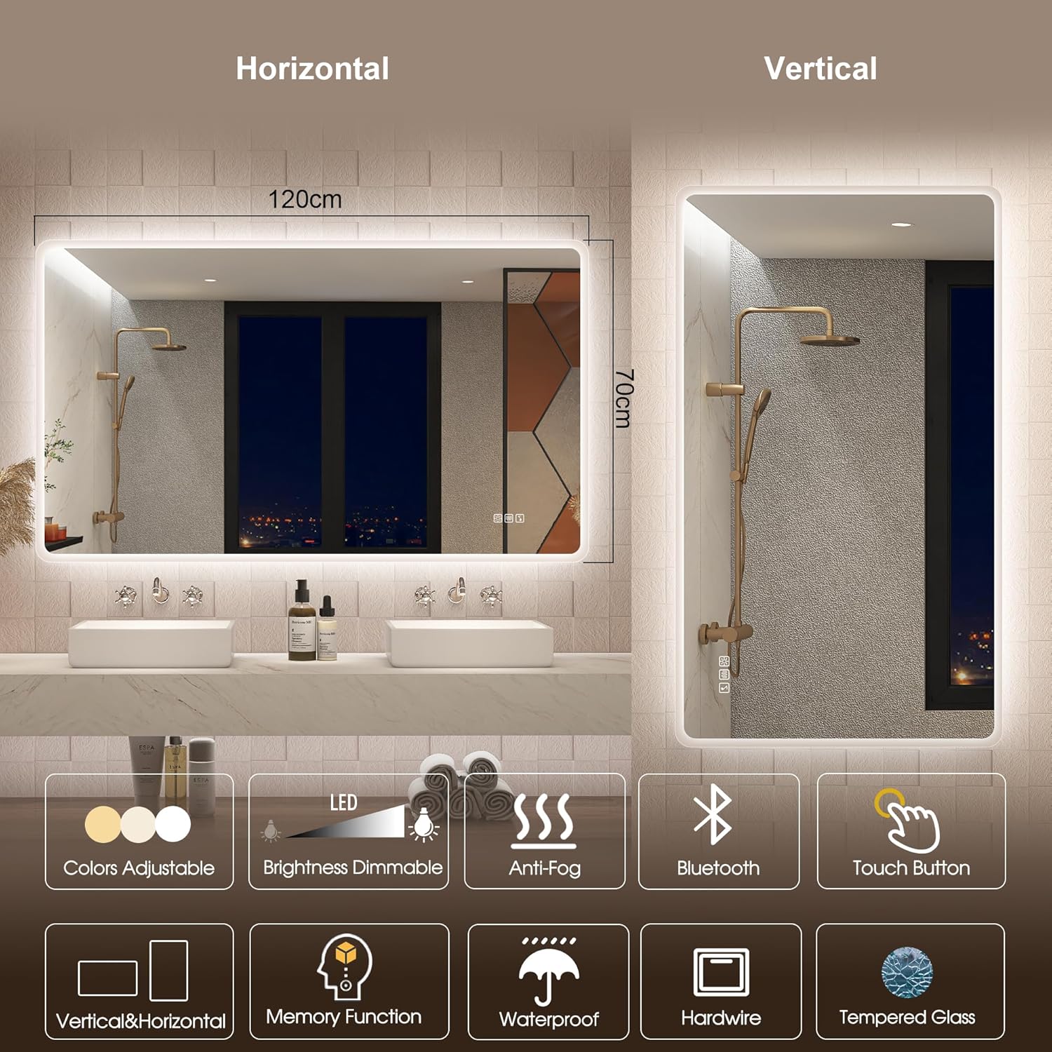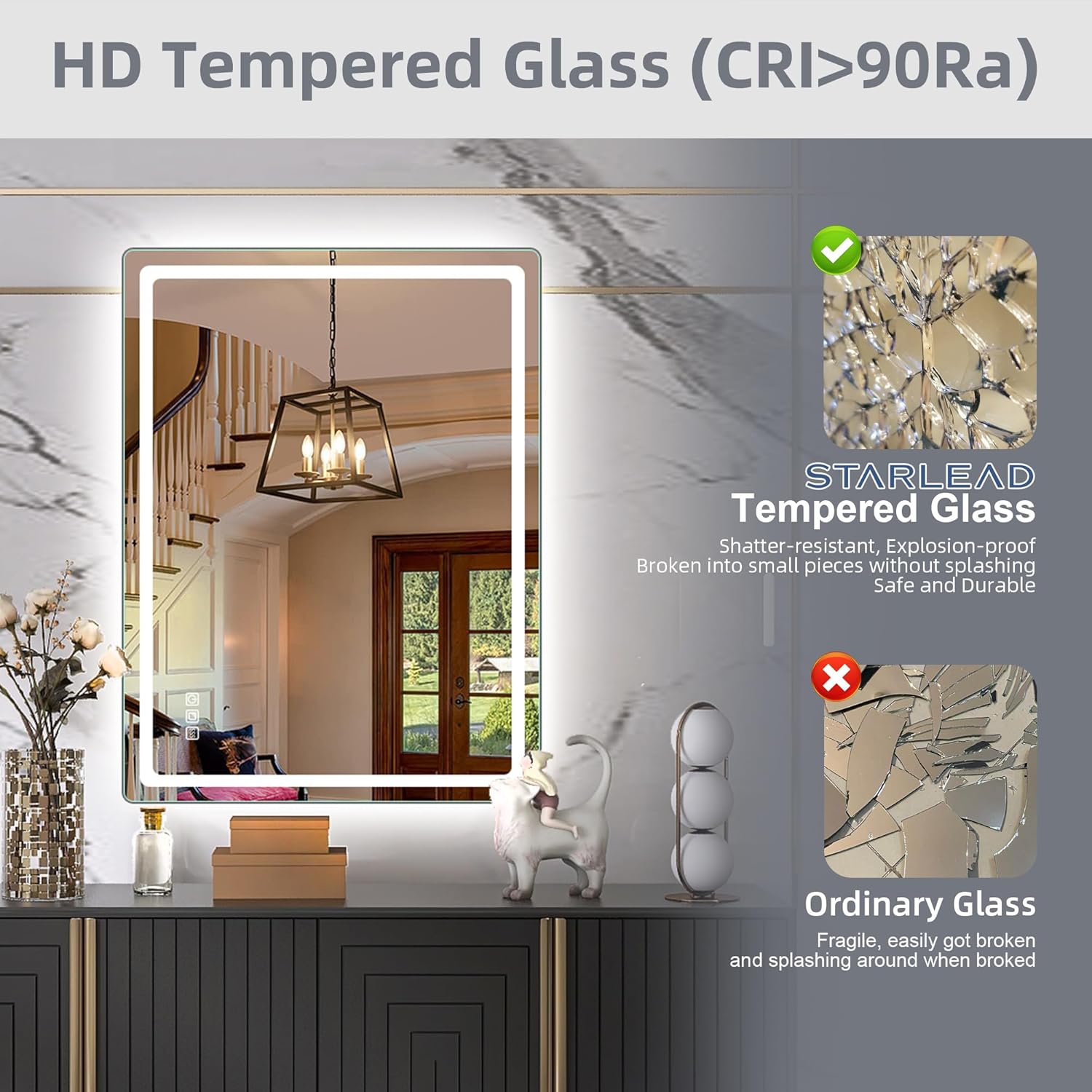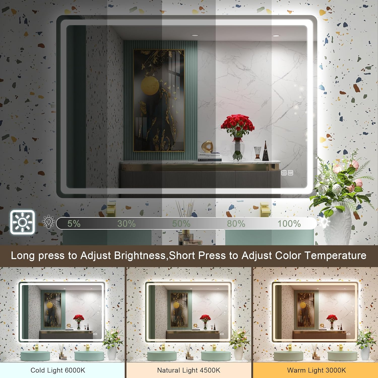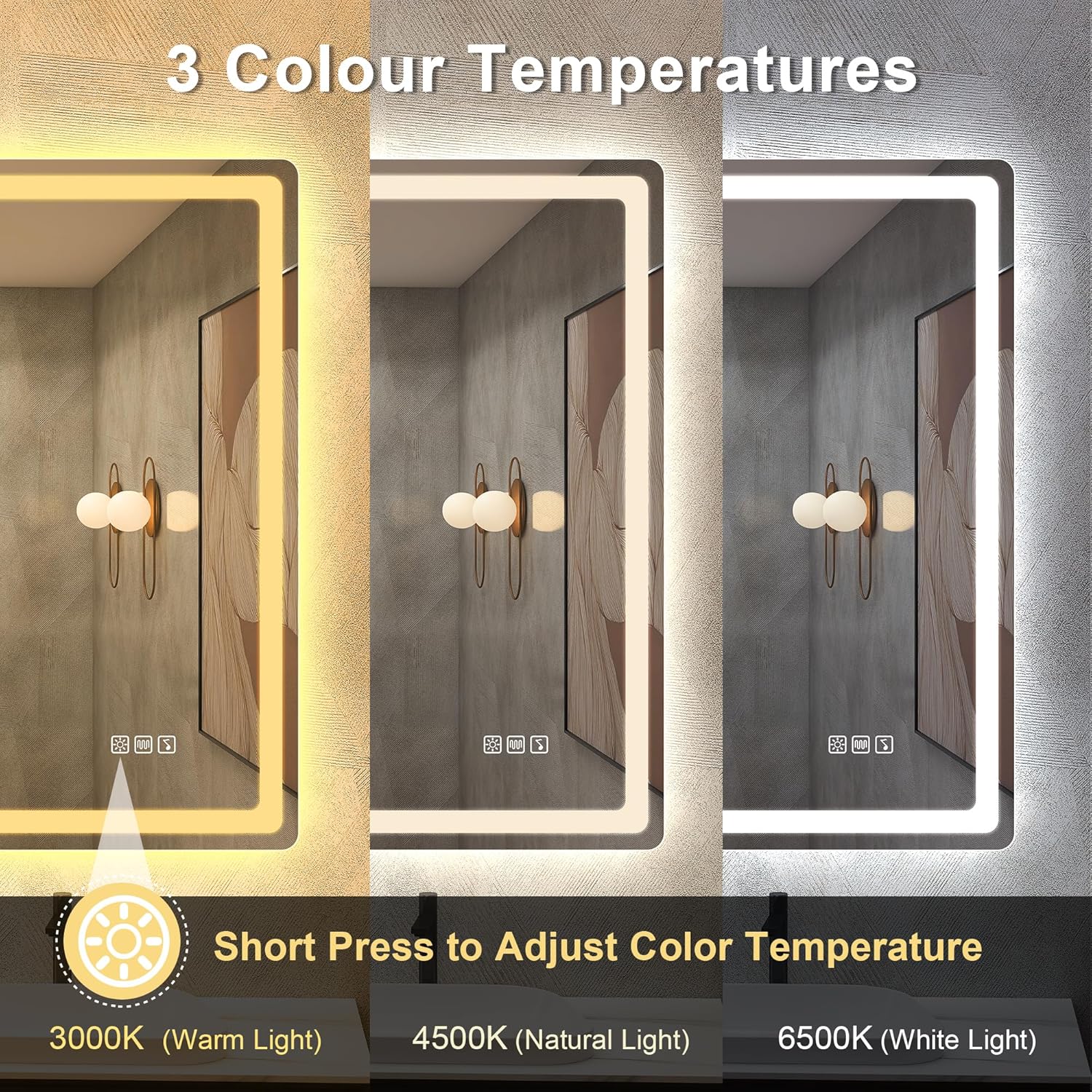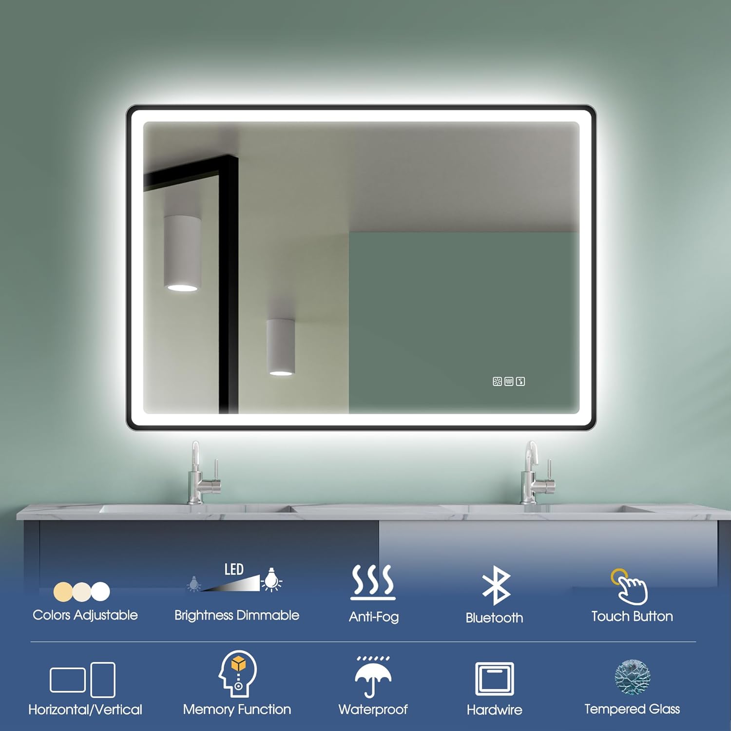 STARLEAD Specchio-Bagno-con-Luce e Bluetooth 70x100cm, Specchio-Bagno-LED con Antifog, 3 Colori Luce, Dimmerabile, IP44, Vetro Temperato HD, Memoria, Orizzontale/Verticale