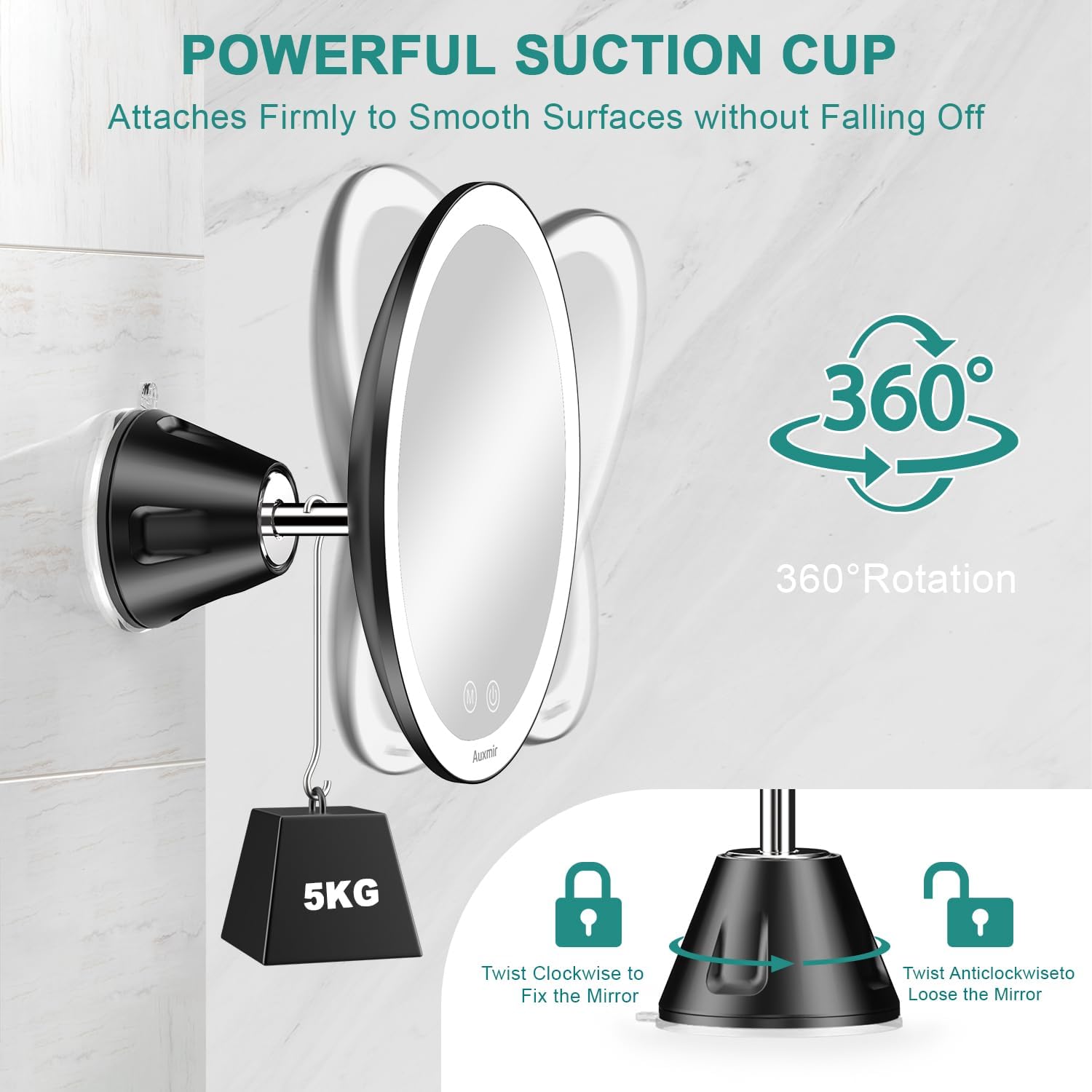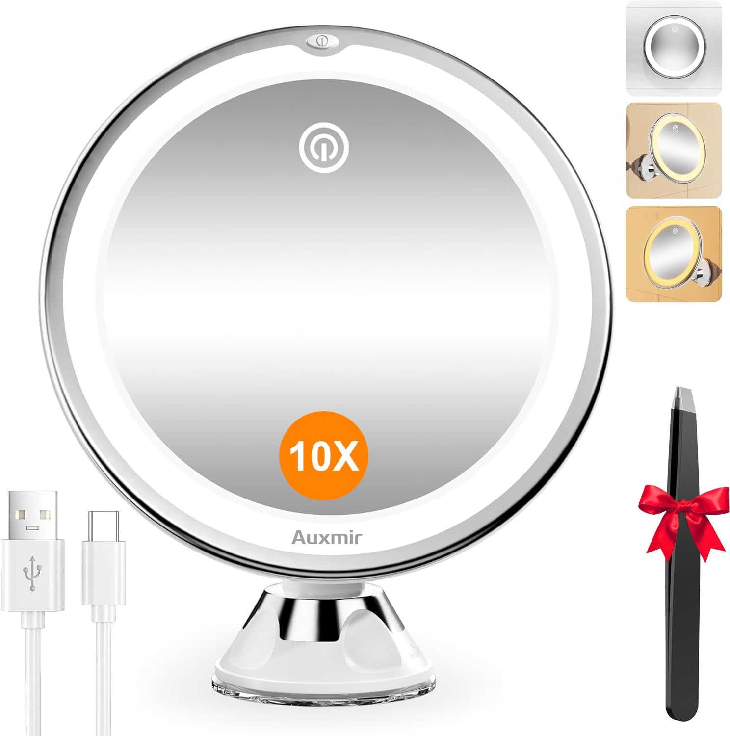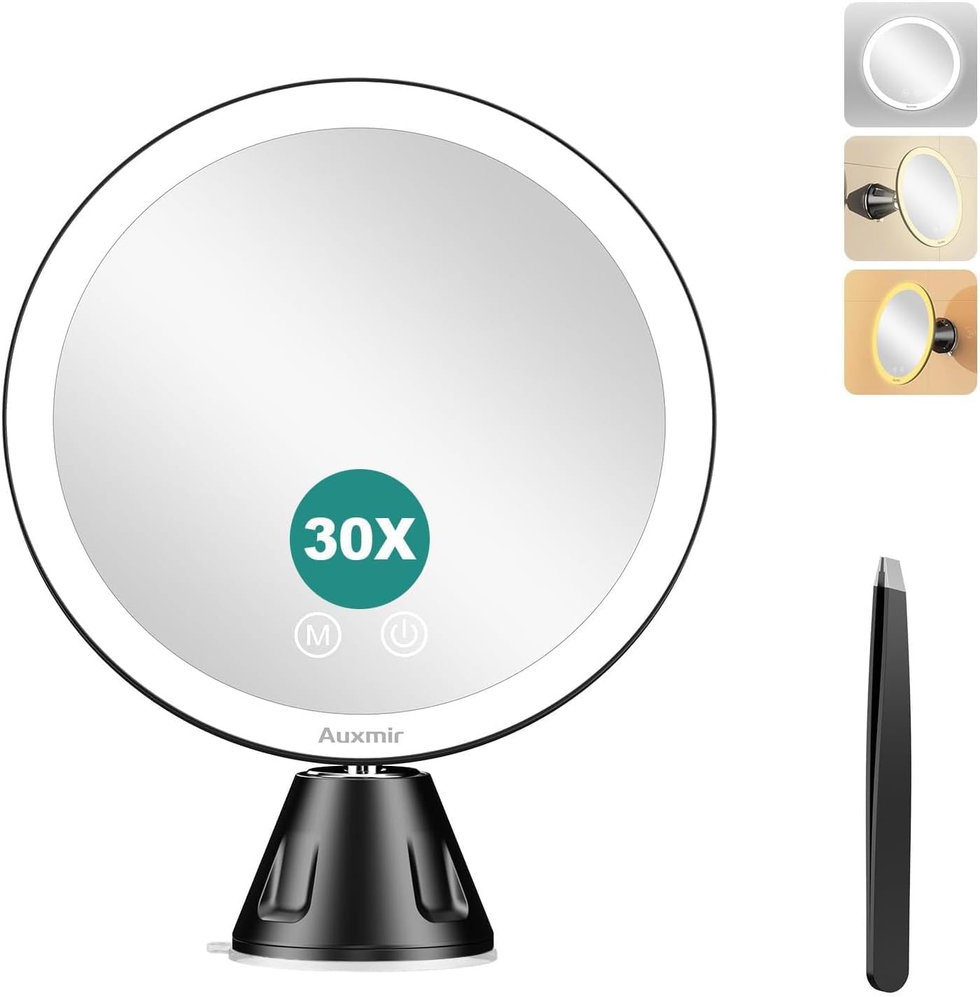Auxmir Specchio Ingranditore 20X, Specchio Trucco a 3 Colori d’Illuminazione, Luminosità Regolabile, Specchio Cosmetico a Ventosa con Giunto Sferico Orientabile Rotazione a 360°, Ricaricabile
