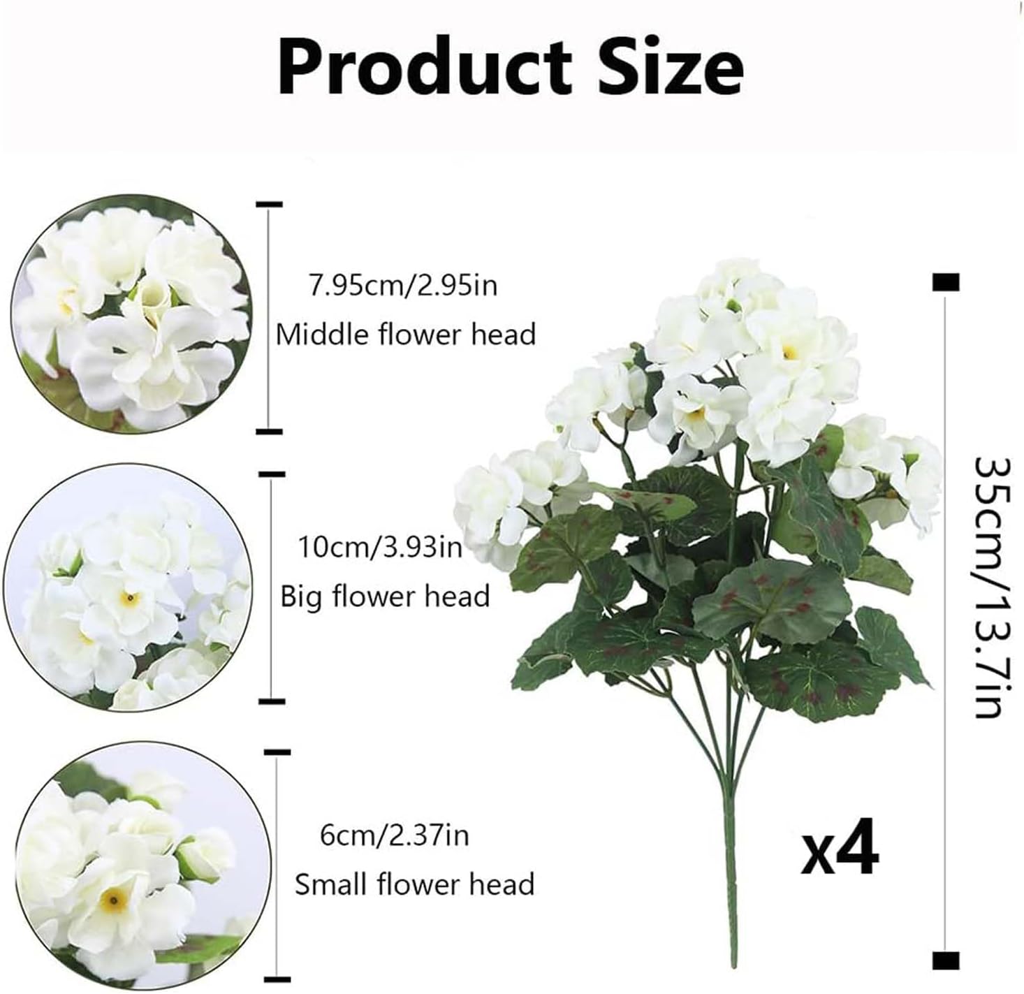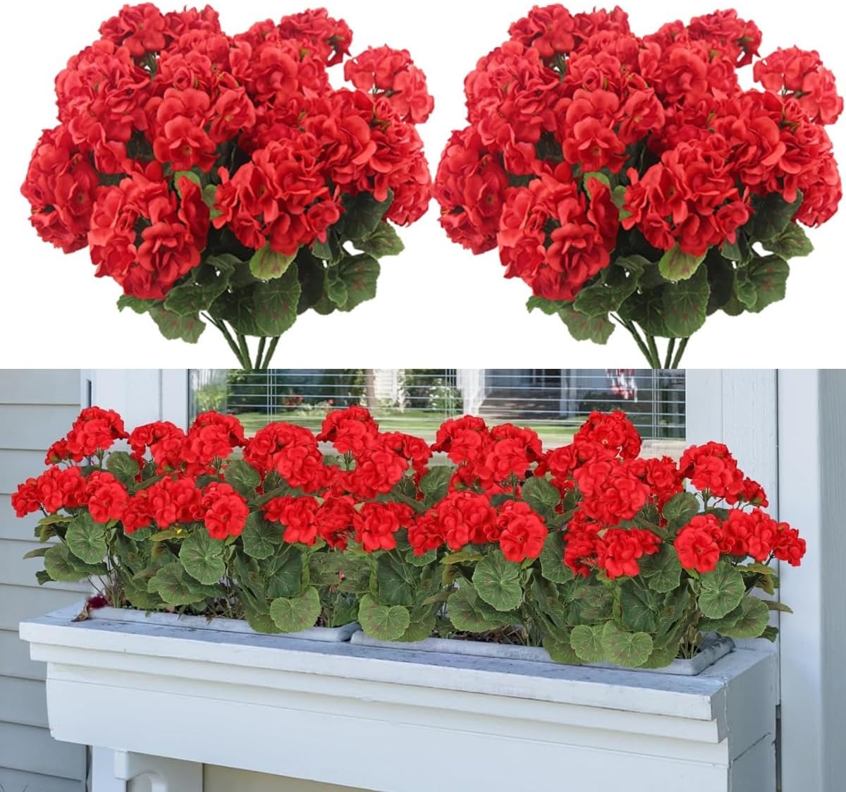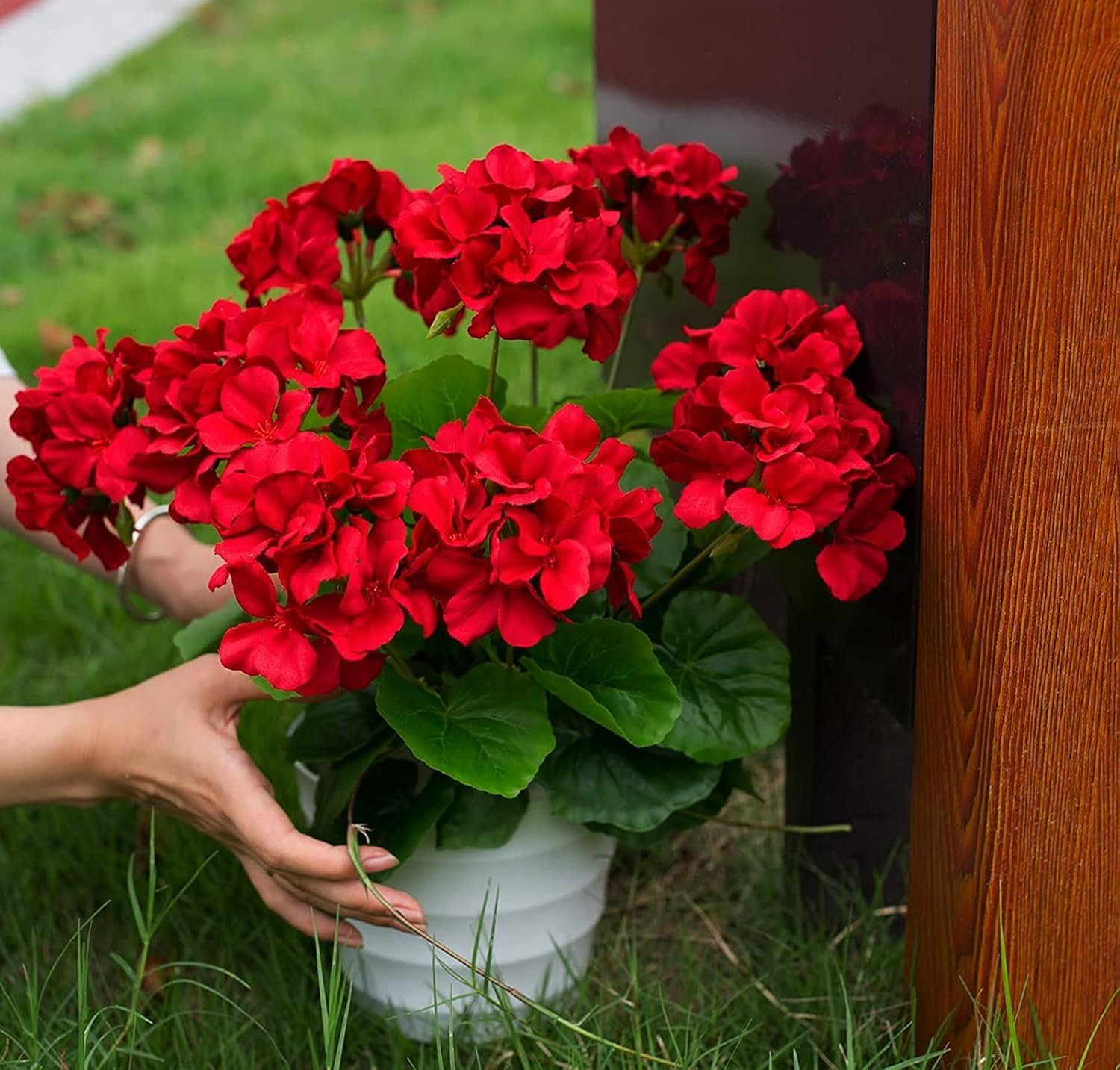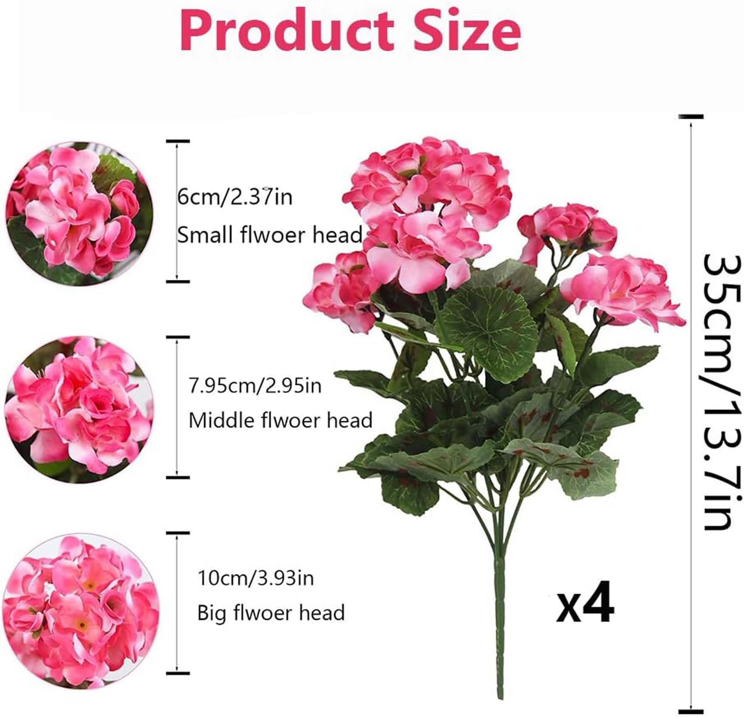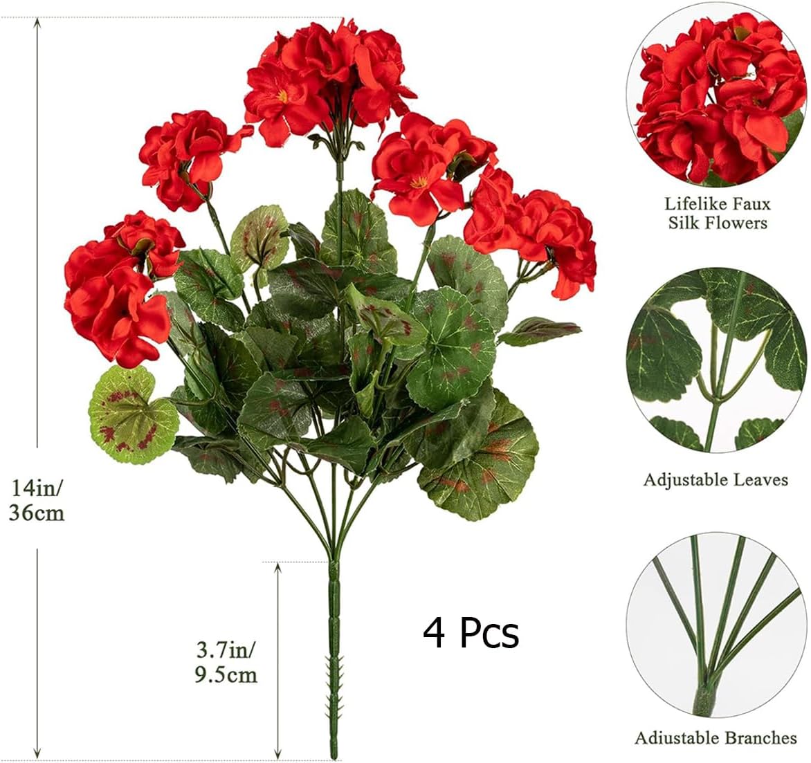 Laelfe 4 Pcs Gerani Rossi Finti da Esterno, Fiori Finti Artificiali Geranio per Esterno Balcone Patio Cimitero Sospensione di Fioriere Decorazione per Tavolo (Rosso-4 Pcs)