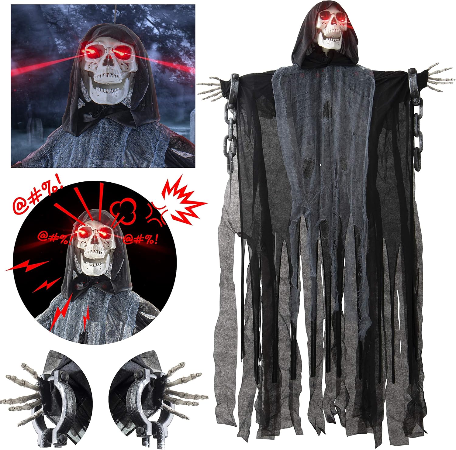 Prextex Halloween Teschio Nera Mietitrice da Appendere Animato 1.5m con Catene Migliore Decorazione Scenografica di Halloween - Decorazioni spaventose per Feste di Halloween