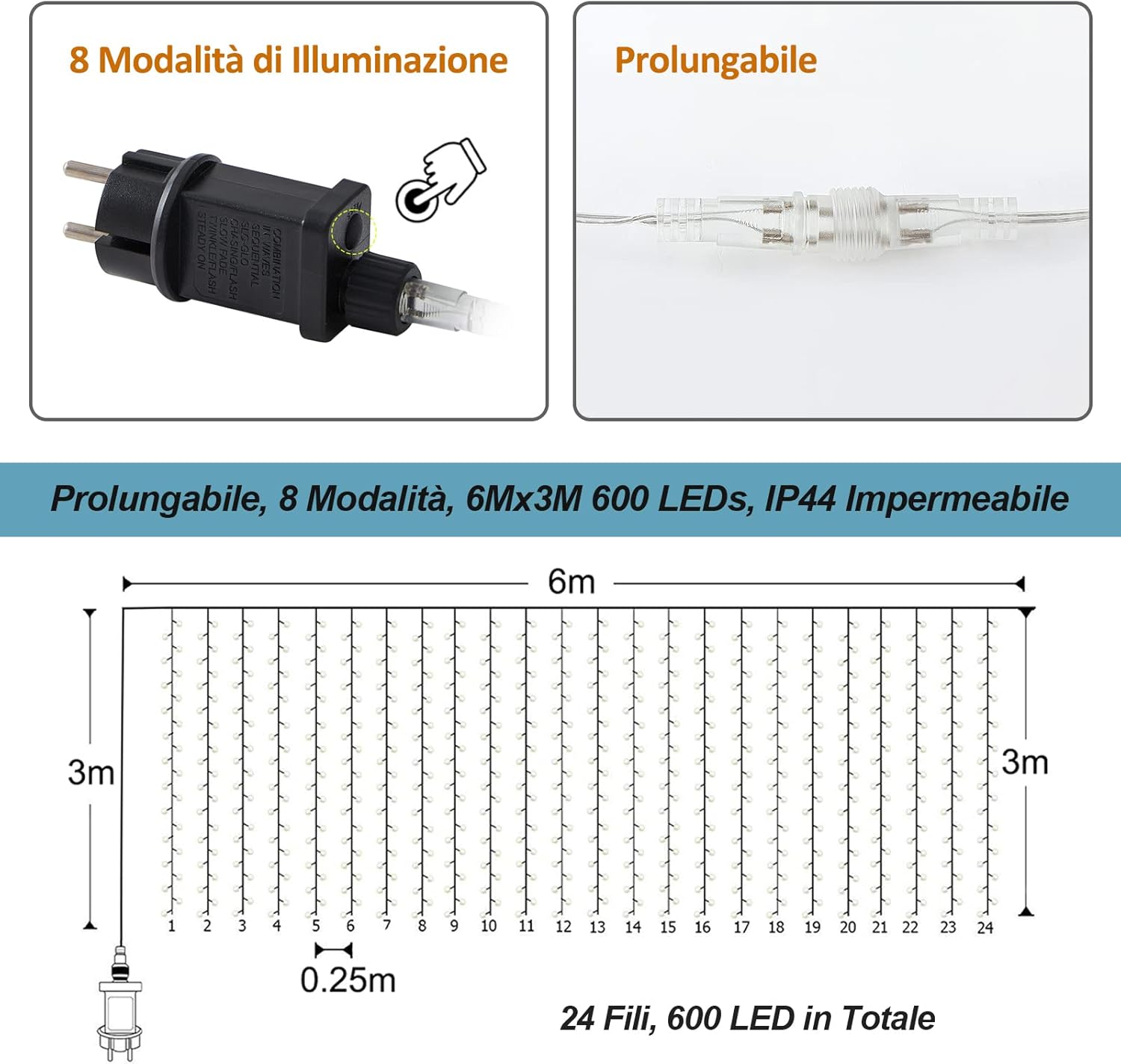 Zorela 600 LED 6Mx3M Tenda Luminosa Natale Esterno Interno Prolungabile Luci di Natale IP44 Impermeabile con 8 Modalità Tenda Luci Esterno per Natale, Giardino e Matrimonio