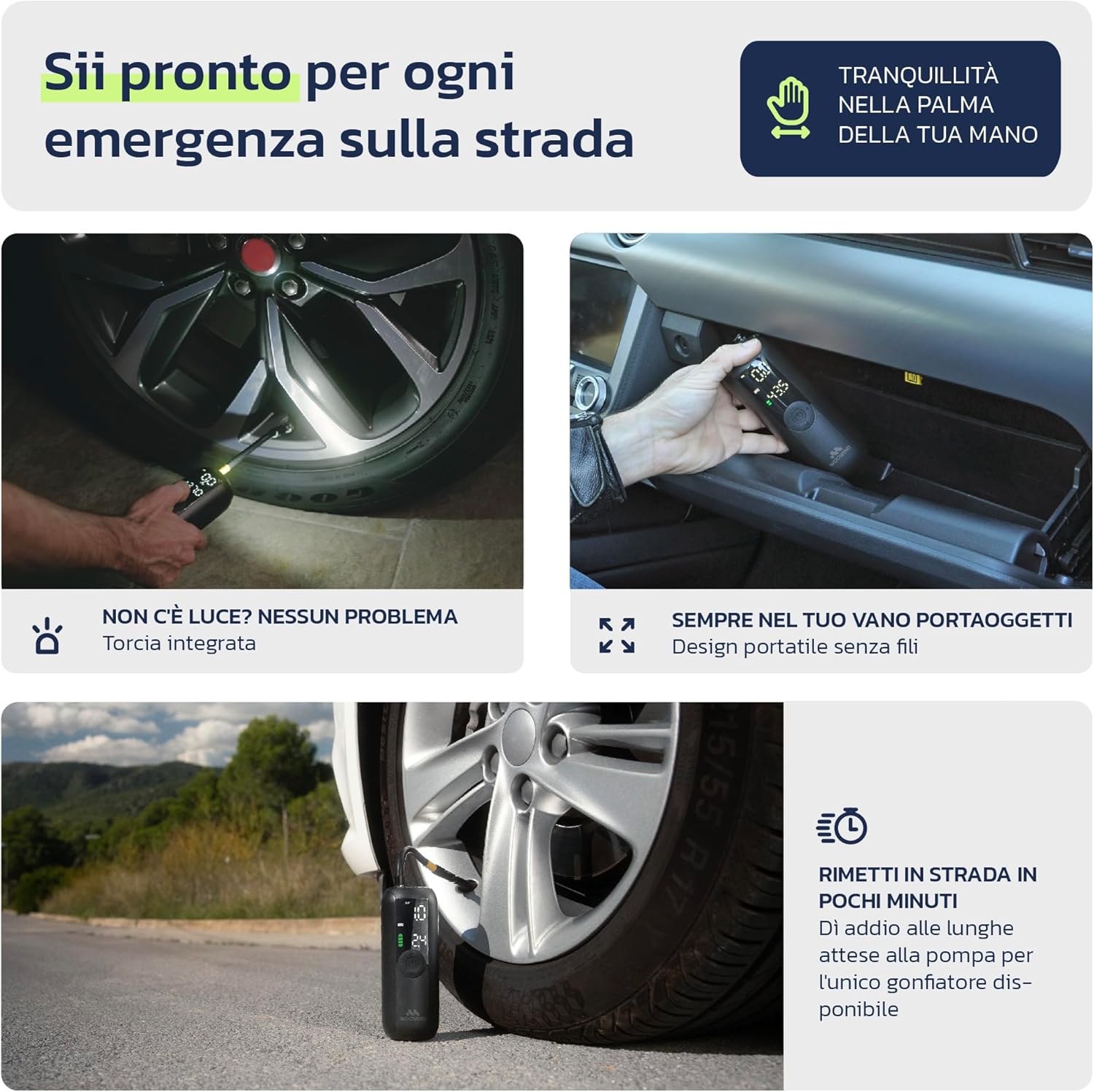 Lamicall Compressore Aria Portatile, Gonfiatore Elettrico Auto - [150 PSI Gonfiaggio Rapido] con Display LCD & Luce LED, Power Bank, Mini Pompa con 3 Ugelli per Auto/Bici/Moto/Palla