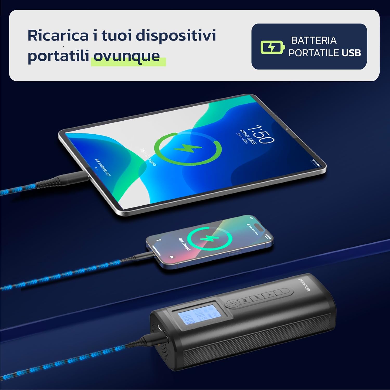 Portable Air Compressor, Mini Air Compresseur 150PSI, Inflator 12 V DC with 6000 mAh, Accessories for Car, Motorcycle, Bike, Ball. It is equipped with database function, LED light and automatic stop