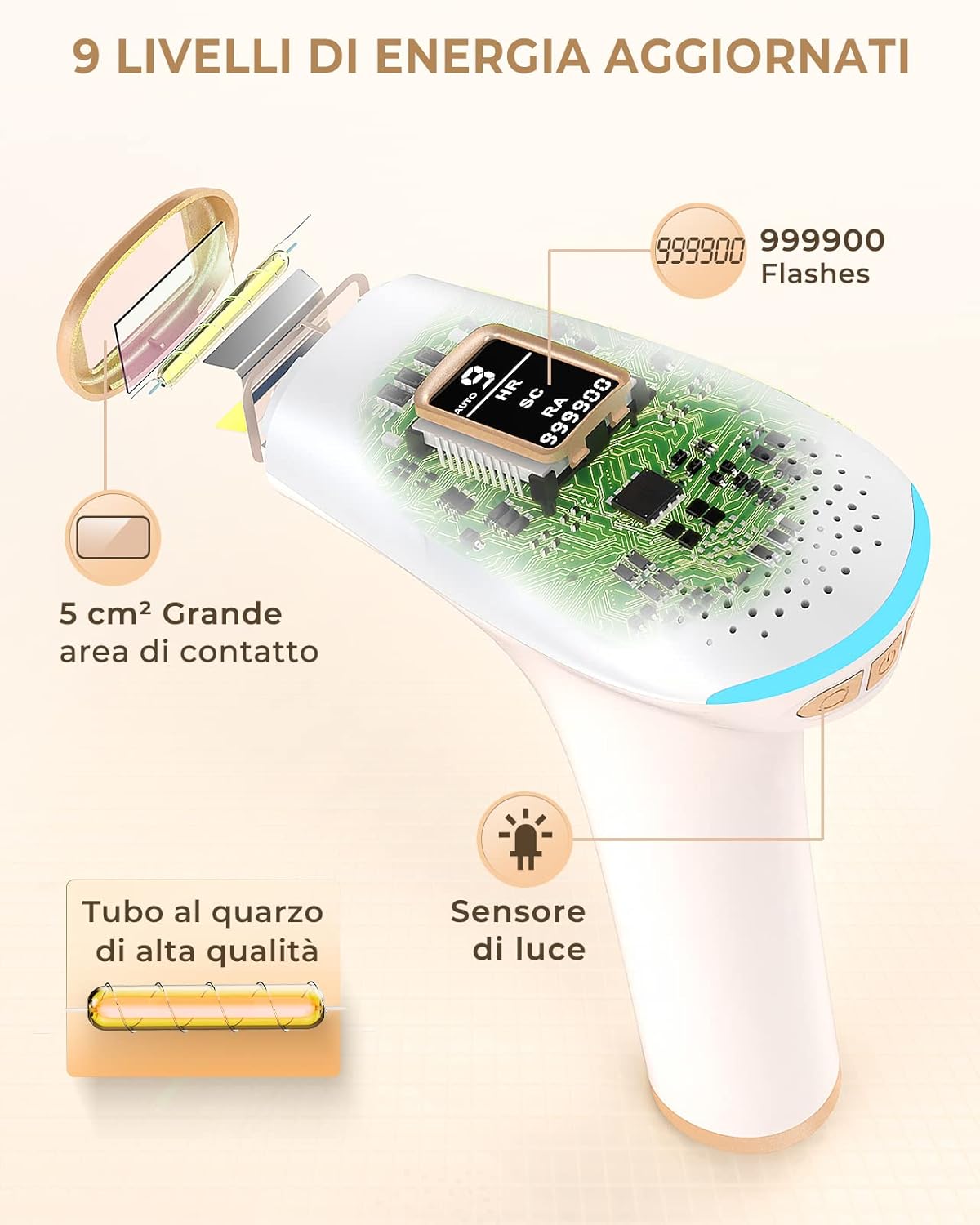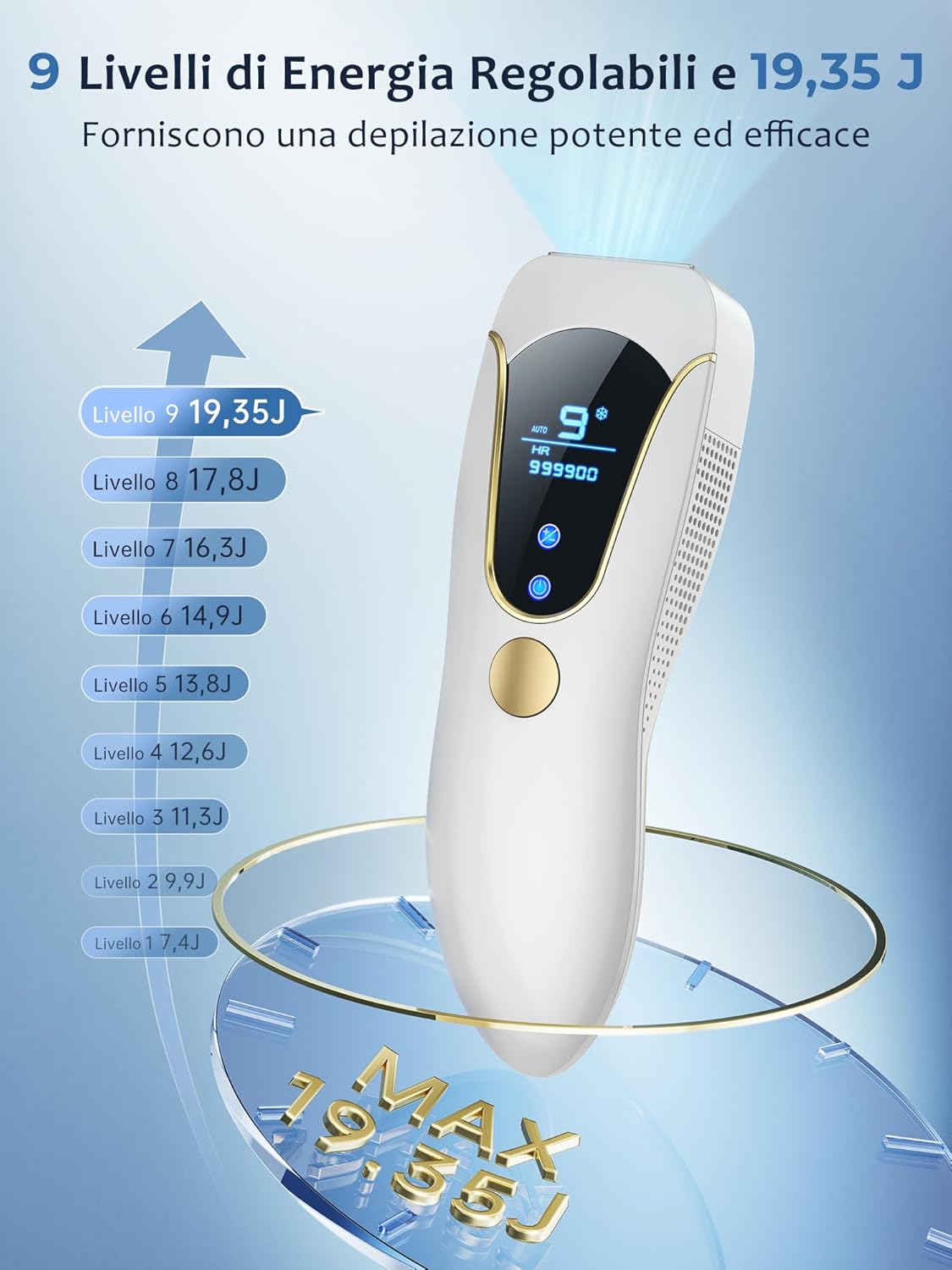 Epilatore Luce Pulsata con Funzione Ghiaccio, Luce Pulsata Efficiente 19,35J con 9 Livelli di Energia, Flash Continuo Automatico, Epilatore a Luce Pulsata per Donne, Braccia,Ascelle,Gambe