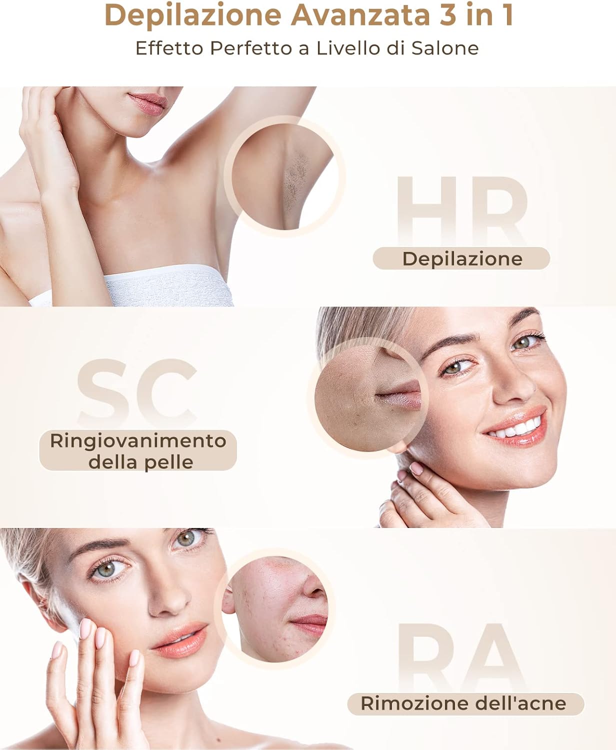Haarlosy IPL Epilatore Luce Pulsata, 3-in-1 HR/SC/RA Epilatore Laser per Donna e Uomo, 9 Livelli di Energia Regolabile Adatto Depilatore Corpo, Viso, Ascelle, Gambe (Bianco)
