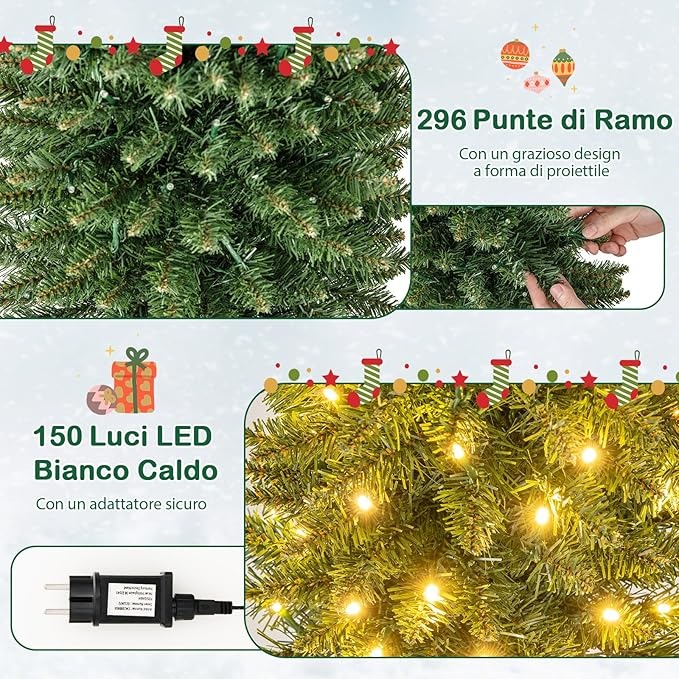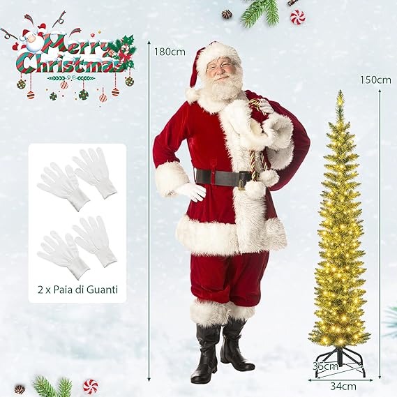 COSTWAY Albero di Natale Slim da 150/180/210 CM, Albero di Natale Artificiale con 296/390/499 Punte di Ramo, 150/180/200 Luci LED Bianche Calde, Supporto Pieghevole in Metallo (180 cm)